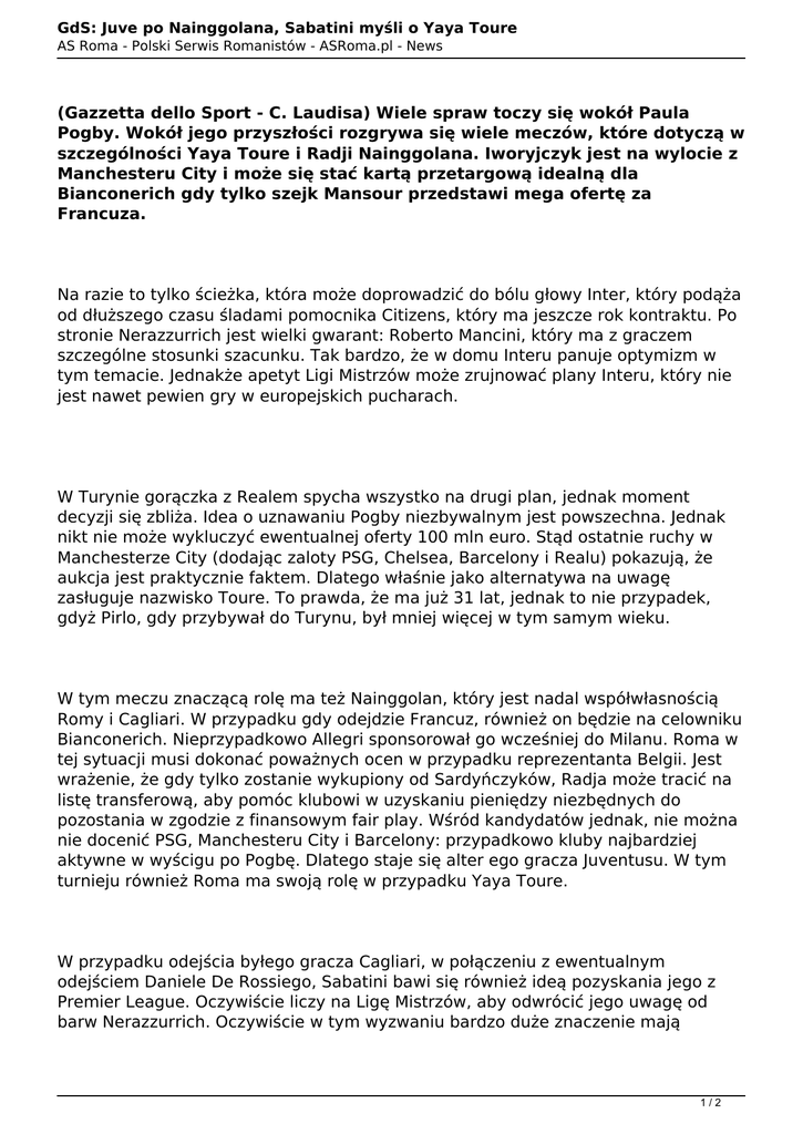 GdS: Juve po Nainggolana, Sabatini myśli o Yaya Toure AS Roma - Polski Serwis Romanistów - ASRoma.pl - News (Gazzetta dello Sport - C. Laudisa) Wiele spraw toczy się wokół Paula Pogby. Wokół jego przyszłości rozgrywa się wiele meczów, które dotyczą w szczególności Yaya Toure i Radji Nainggolana. Iworyjczyk jest na wylocie z Manchesteru City i może się stać kartą przetargową idealną dla Bianconerich gdy tylko szejk Mansour przedstawi mega ofertę za Francuza. Na razie to tylko ścieżka, która może doprowadzić do bólu głowy Inter, który podąża od dłuższego czasu śladami pomocnika Citizens, który ma jeszcze rok kontraktu. Po stronie Nerazzurrich jest wielki gwarant: Roberto Mancini, który ma z graczem szczególne stosunki szacunku. Tak bardzo, że w domu Interu panuje optymizm w tym temacie. Jednakże apetyt Ligi Mistrzów może zrujnować plany Interu, który nie jest nawet pewien gry w europejskich pucharach. W Turynie gorączka z Realem spycha wszystko na drugi plan, jednak moment decyzji się zbliża. Idea o uznawaniu Pogby niezbywalnym jest powszechna. Jednak nikt nie może wykluczyć ewentualnej oferty 100 mln euro. Stąd ostatnie ruchy w Manchesterze City (dodając zaloty PSG, Chelsea, Barcelony i Realu) pokazują, że aukcja jest praktycznie faktem. Dlatego właśnie jako alternatywa na uwagę zasługuje nazwisko Toure. To prawda, że ma już 31 lat, jednak to nie przypadek, gdyż Pirlo, gdy przybywał do Turynu, był mniej więcej w tym samym wieku. W tym meczu znaczącą rolę ma też Nainggolan, który jest nadal współwłasnością Romy i Cagliari. W przypadku gdy odejdzie Francuz, również on będzie na celowniku Bianconerich. Nieprzypadkowo Allegri sponsorował go wcześniej do Milanu. Roma w tej sytuacji musi dokonać poważnych ocen w przypadku reprezentanta Belgii. Jest wrażenie, że gdy tylko zostanie wykupiony od Sardyńczyków, Radja może tracić na listę transferową, aby pomóc klubowi w uzyskaniu pieniędzy niezbędnych do pozostania w zgodzie z finansowym fair play. Wśród kandydatów jednak, nie można nie docenić PSG, Manchesteru City i Barcelony: przypadkowo kluby najbardziej aktywne w wyścigu po Pogbę. Dlatego staje się alter ego gracza Juventusu. W tym turnieju również Roma ma swoją rolę w przypadku Yaya Toure. W przypadku odejścia byłego gracza Cagliari, w połączeniu z ewentualnym odejściem Daniele De Rossiego, Sabatini bawi się również ideą pozyskania jego z Premier League. Oczywiście liczy na Ligę Mistrzów, aby odwrócić jego uwagę od barw Nerazzurrich. Oczywiście w tym wyzwaniu bardzo duże znaczenie mają 1/2 GdS: Juve po Nainggolana, Sabatini myśli o Yaya Toure AS Roma - Polski Serwis Romanistów - ASRoma.pl - News oczekiwania ekonomiczne pomocnika City. Obecnie zarabia 6,5 mln euro plus bogate bonusy i jest gotowy na obniżkę w wieloletniej umowie, ale na pewno nie zejdzie poniżej 4 mln. To po trosze przeszkoda dla wszystkich. Dla Romy jeszcze bardziej, gdyż najlepiej opłacany w tym momencie jest właśnie De Rossi, z 6 mln euro netto. Dlatego właśnie celowanie Romy w Toure wiąże się z ewentualnym odejściem kapitana przyszłości do USA. Autor: abruzzi 2/2 Powered by TCPDF (www.tcpdf.org)