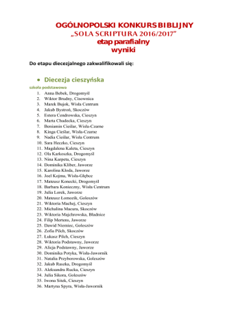 OGÓLNOPOLSKI KONKURS BIBLIJNY etap parafialny wyniki Do etapu diecezjalnego zakwalifikowali się: Diecezja cieszyńska szkoła podstawowa 1. Anna Bebek, Drogomyśl 2. Wiktor Brudny, Cisownica 3. Marek Bujok, Wisła Centrum 4. Jakub Bystroń, Skoczów 5. Estera Cendrowska, Cieszyn 6. Marta Chudecka, Cieszyn 7. Beniamin Cieślar, Wisła-Czarne 8. Kinga Cieślar, Wisła-Czarne 9. Nadia Cieślar, Wisła Centrum 10. Sara Heczko, Cieszyn 11. Magdalena Kaleta, Cieszyn 12. Ola Karkoszka, Drogomyśl 13. Nina Karpeta, Cieszyn 14. Dominika Kliber, Jaworze 15. Karolina Kłoda, Jaworze 16. Joel Kojma, Wisła-Głębce 17. Mateusz Konecki, Drogomyśl 18. Barbara Konieczny, Wisła Centrum 19. Julia Lorek, Jaworze 20. Mateusz Łomozik, Goleszów 21. Wiktoria Machej, Cieszyn 22. Michalina Macura, Skoczów 23. Wiktoria Majchrowska, Bładnice 24. Filip Mertens, Jaworze 25. Dawid Niemiec, Goleszów 26. Zofia Pilch, Skoczów 27. Łukasz Pilch, Cieszyn 28. Wiktoria Podstawny, Jaworze 29. Alicja Podstawny, Jaworze 30. Dominika Potyka, Wisła-Jawornik 31. Natalia Przyborowska, Goleszów 32. Jakub Raszka, Drogomyśl 33. Aleksandra Rucka, Cieszyn 34. Julia Sikora, Goleszów 35. Iwona Sitek, Cieszyn 36. Martyna Spyra, Wisła-Jawornik 37. 38. 39. 40. 41. 42. 43. 44. 45. 46. Karina Stasiak, Wisła Centrum Weronika Stasica, Cieszyn Dominika Suchorab, Cieszyn Kacper Szeremeta, Wisła-Głębce Piotr Szturc, Wisła Centrum Julia Tobias, Biała Martyna Tomica, Goleszów Jan Twardzik, Cisownica Kamil Watut, Drogomyśl Joanna Wiencek, Wisła Centrum gimnazjum 1. Jakub Barański, Skoczów 2. Edyta Bolek, Cieszyn 3. Joanna Brudny, Cieszyn 4. Tomasz Chmiel, Skoczów 5. Paweł Cholewa, Fundacja Życie i Misja w Ustroniu 6. Maria Chudecka, Cieszyn 7. Marek Chudecki, Cieszyn 8. Daniel Cieślar, Goleszów 9. Jakub Donocik, Cieszyn 10. Martyna Dorda, Cieszyn 11. Jagoda Fober, Dzięgielów 12. Zuzanna Gabryś, Drogomyśl 13. Karolina Gamola, Ustroń 14. Szymon Greń, Bładnice 15. Maciej Halicki, Cieszyn 16. Tobiasz Jankowski, Cieszyn 17. Klaudia Kidoń, Wieszczęta-Kowale 18. Szymon Kluz, Cisownica 19. Klaudia Knobloch, Cieszyn 20. Wiktoria Kojma, Skoczów 21. Przemysław Konecki, Cisownica 22. Anna Konieczny, Wisła Centrum 23. Jan Kulec, Zbór Braterski w Gródku, Czechy 24. Lilianna Leszczuk, Cieszyn 25. Aneta Macha, Goleszów 26. Wojciech Makula, Cieszyn 27. Paweł Markuzel, Bładnice 28. Julia Murańska, Cieszyn 29. Marta Ogrodnik, Jaworze 30. Paulina Panek, Cieszyn 31. Samantha Pinkas, Wisła Centrum 32. Julia Stasica, Cieszyn 33. Marcin Stefański, Bielsko 34. Anna Szajthauer, Wisła Centrum 35. Samuel Wapienik, Wisła Centrum 36. Samuel Wawrzeczko, Skoczów 37. Łukasz Wesołowski, Cieszyn szkoły ponadgimnazjalne 1. Alina Brych, Skoczów 2. Adam Bujok, Goleszów 3. Katarzyna Cieślar, Wisła-Malinka 4. Justyna Godawska, Skoczów 5. Jolanta Hanus, Goleszów 6. Marlena Janik, Ustroń 7. Marcin Michalik, Goleszów 8. Marzena Niemczyk, Wisła-Jawornik 9. Bartłomiej Ostachowski, Goleszów 10. Karol Raszka, Cieszyn 11. Łukasz Sikora, Skoczów 12. Natalia Szczurek, Cieszyn 13. Szymon Szlauer, Ustroń 14. Justyna Tomica, Goleszów 15. Agata Troszok, Wisła-Głębce 16. Jan Walica, Cieszyn Diecezja katowicka szkoła podstawowa 1. Justyna Bebek, Gołkowice 2. Michał Brudny, Gołkowice 3. Joanna Centner, Hołdunów 4. Zofia Chamioło, Kraków 5. Gabriela Firla, Gołkowice 6. Paweł Gałwa, Opole 7. Jan Idzi, Chrześcijańska Szkoła Podstawowa „Uczeń”, Kraków 8. Aleksandra Kaczmarczyk, Hołdunów 9. Małgorzata Karzełek, Jastrzębie-Zdrój 10. Dominik Konieczny, Golasowice 11. Martyna Liberda, Golasowice 12. Paweł Małek, Mikołów 13. Wiktoria Natonek, Orzesze 14. Aldona Niemczyk, Jastrzębie-Zdrój 15. Agata Niemiec, Pszczyna 16. Sonia Plinta, Golasowice 17. Marta Płonka, Kraków 18. Tymoteusz Prostak, Kraków 19. Jakub Przegendza, Mikołów 20. Witold Radzik, Tychy 21. Michał Sowada, Mikołów 22. Kornelia Trojan, Pszczyna 23. Julia Twardzik, Orzesze 24. Hanna Tyrańska, Kraków 25. Łukasz Wach, Opole 27. Oskar Wodowski, Mikołów gimnazjum 1. Mateusz Adamus, Tychy 2. Marta Boruta, Jastzrębie-Zdrój 3. Dominika Centner, Hołdunów 4. Emilia Cichy, Chorzów 5. Zofia Durdzińska, Rybnik 6. Wiktoria Gatner, Jastrzębie-Zdrój 7. Natalia Janota, Golasowice 8. Roksana Jurczyk, Żory 9. Szymon Karkoszka, Kraków 10. Kamil Kotorc, Golasowice 11. Zuzanna Kurko, Bytom-Miechowice 12. Maria Kurko, Bytom-Miechowice 13. Adrianna Lanc, Pszczyna 14. Klaudia Liberda, Golasowice 15. Magdalena Łazarska, Rybnik 16. Artur Mach, Golasowice 17. Patrycja Mach, Golasowice 18. Aneta Majer, Orzesze 19. Olaf Makula, Golasowice 20. Marcin Niemiec, Golasowice 21. Anna Pagano, Kraków 22. Jowanka Rzońca, Kraków 23. Szymon Wach, Opole 23. Rafał Zachraj, Golasowice szkoły ponadgimnazjalne 1. Martyna Banasiak, Golasowice 2. Jan Bieta, Hołdunów 3. Bogusz Dziadek, Golasowice 4. Daria Gatner, Jastrzebie-Zdrój 5. Konrad Indeka, Pszczyna 6. Natalia Mach, Pszczyna 7. Artur Markiel, Wodzisław Śląski 8. Anna Michalik, Katowice 9. Karol Pieczka, Chorzów Diecezja mazurska szkoła podstawowa 1. Zuzanna Juroszek, Mikołajki gimnazjum 1. Bruno Kulesza, Kętrzyn 2. Michał Dobrowolski, Nidzica szkoły ponadgimnazjalne 1. Klaudia Dankowska, Nidzica 2. Weronika Krauze, Nidzica Diecezja pomorsko-wielkopolska szkoła podstawowa 1. Julia Hintz, Gdańsk – Sopot 2. Olga Kwiatkowska, Bydgoszcz 3. Małgorzata Mendrok, Włocławek 4. Kacper Neumann, Rypin 5. Aniela Redlińska, Bydgoszcz 6. Patryk Spodziński, Włocławek 7. Vanessa Suer, Rypin gimnazjum 1. Gabriela Adrian, Gdańsk – Sopot 2. Sandra Berger, Kępno 3. Marcel Piechocki, Bydgoszcz 4. Mikołaj Sarnowski, Rypin 5. Wiktoria Spodzińska, Włocławek 6. Natalia Szczerbuk, Kępno szkoły ponadgimnazjalne 1. Aleksandra Chlost, Słupsk 2. Julia Fabiańska, Bydgoszcz 3. Artur, Koszmider, Kępno 4. Adam Parol, Słupsk 5. Jadwiga Sarnowska, Rypin 6. Dorota Sieklicka, Słupsk 7. Filip Szalbot, Toruń Die