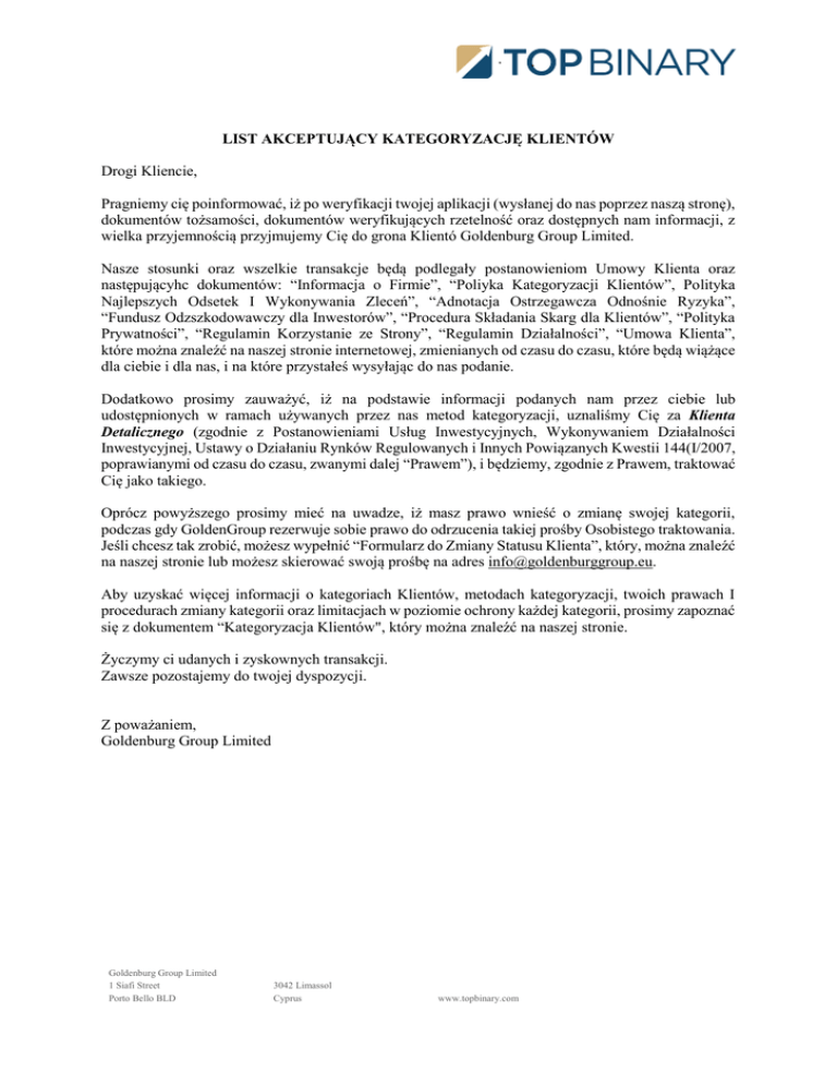 LIST AKCEPTUJĄCY KATEGORYZACJĘ KLIENTÓW Drogi Kliencie, Pragniemy cię poinformować, iż po weryfikacji twojej aplikacji (wysłanej do nas poprzez naszą stronę), dokumentów tożsamości, dokumentów weryfikujących rzetelność oraz dostępnych nam informacji, z wielka przyjemnością przyjmujemy Cię do grona Klientó Goldenburg Group Limited. Nasze stosunki oraz wszelkie transakcje będą podlegały postanowieniom Umowy Klienta oraz następującyhc dokumentów: “Informacja o Firmie”, “Poliyka Kategoryzacji Klientów”, Polityka Najlepszych Odsetek I Wykonywania Zleceń”, “Adnotacja Ostrzegawcza Odnośnie Ryzyka”, “Fundusz Odzszkodowawczy dla Inwestorów”, “Procedura Składania Skarg dla Klientów”, “Polityka Prywatności”, “Regulamin Korzystanie ze Strony”, “Regulamin Działalności”, “Umowa Klienta”, które można znaleźć na naszej stronie internetowej, zmienianych od czasu do czasu, które będą wiążące dla ciebie i dla nas, i na które przystałeś wysyłając do nas podanie. Dodatkowo prosimy zauważyć, iż na podstawie informacji podanych nam przez ciebie lub udostępnionych w ramach używanych przez nas metod kategoryzacji, uznaliśmy Cię za Klienta Detalicznego (zgodnie z Postanowieniami Usług Inwestycyjnych, Wykonywaniem Działalności Inwestycyjnej, Ustawy o Działaniu Rynków Regulowanych i Innych Powiązanych Kwestii 144(I/2007, poprawianymi od czasu do czasu, zwanymi dalej “Prawem”), i będziemy, zgodnie z Prawem, traktować Cię jako takiego. Oprócz powyższego prosimy mieć na uwadze, iż masz prawo wnieść o zmianę swojej kategorii, podczas gdy GoldenGroup rezerwuje sobie prawo do odrzucenia takiej prośby Osobistego traktowania. Jeśli chcesz tak zrobić, możesz wypełnić “Formularz do Zmiany Statusu Klienta”, który, można znaleźć na naszej stronie lub możesz skierować swoją prośbę na adres [email protected]. Aby uzyskać więcej informacji o kategoriach Klientów, metodach kategoryzacji, twoich prawach I procedurach zmiany kategorii oraz limitacjach w poziomie ochrony każdej kategorii, prosimy zapoznać się z dokumentem “Kategoryzacja Klientów", który można znaleźć na naszej stronie. Życzymy ci udanych i zyskownych transakcji. Zawsze pozostajemy do twojej dyspozycji. Z poważaniem, Goldenburg Group Limited Goldenburg Group Limited 1 Siafi Street Porto Bello BLD 3042 Limassol Cyprus www.topbinary.com