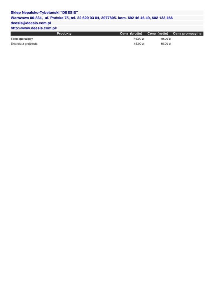 Sklep Nepalsko-Tybetański "DEESIS" Warszawa 00-834, ul. Pańska 75, tel. 22 620 03 04, 3977805. kom. 692 46 46 49, 602 133 466 [email protected] http://www.deesis.com.pl/ Produkty Cena (brutto) Cena (netto) Tarot apokalipsy 49.00 zł 49.00 zł Ekstrakt z grejpfruta 15.00 zł 15.00 zł Cena promocyjna