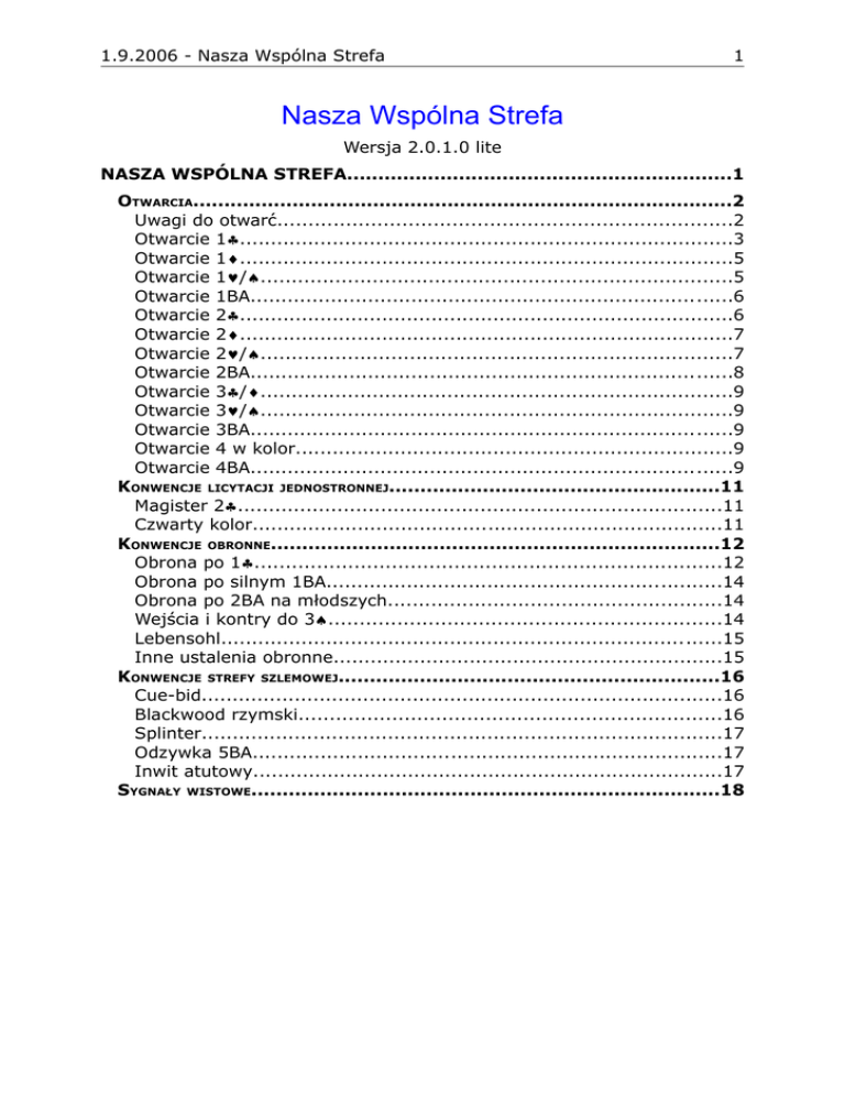 1.9.2006 - Nasza Wspólna Strefa 1 Nasza Wspólna Strefa Wersja 2.0.1.0 lite NASZA WSPÓLNA STREFA..............................................................1 OTWARCIA.......................................................................................2 Uwagi do otwarć.........................................................................2 Otwarcie 1♣................................................................................3 Otwarcie 1♦................................................................................5 Otwarcie 1♥/♠............................................................................5 Otwarcie 1BA..............................................................................6 Otwarcie 2♣................................................................................6 Otwarcie 2♦................................................................................7 Otwarcie 2♥/♠............................................................................7 Otwarcie 2BA..............................................................................8 Otwarcie 3♣/♦............................................................................9 Otwarcie 3♥/♠............................................................................9 Otwarcie 3BA..............................................................................9 Otwarcie 4 w kolor.......................................................................9 Otwarcie 4BA..............................................................................9 KONWENCJE LICYTACJI JEDNOSTRONNEJ.....................................................11 Magister 2♣..............................................................................11 Czwarty kolor............................................................................11 KONWENCJE OBRONNE........................................................................12 Obrona po 1♣...........................................................................12 Obrona po silnym 1BA................................................................14 Obrona po 2BA na młodszych......................................................14 Wejścia i kontry do 3♠...............................................................14 Lebensohl.................................................................................15 Inne ustalenia obronne...............................................................15 KONWENCJE STREFY SZLEMOWEJ.............................................................16 Cue-bid....................................................................................16 Blackwood rzymski....................................................................16 Splinter....................................................................................17 Odzywka 5BA............................................................................17 Inwit atutowy............................................................................17 SYGNAŁY WISTOWE...........................................................................18 2 Nasza Wspólna Strefa - 1.9.2006 Otwarcia 1♣ – wieloznaczne: • 11-14 PC, bal • 11-22 PC, 4+♣ • 18-20 PC, bal • Acol, unbal lub 24+ PC, bal 1♦ – 10-22 PC, 5+ lub 444♦1 1♥/♠ – 10-22 PC, 5+ 1BA – 14+-17 PC, bal 2♣ – 5-10 PC, 5+4+♥♠ 2♦ – 5-10 PC, 6+♥/♠ 2♥/♠ – 5-10 PC, 5+ i 4+♣/♦ 2BA – 21-23 PC, bal, może być 5=♥/♠ 3 w kolor – przed 6+, po 7+, dwa starsze honory 3BA – Gambling bez bocznej kontroli 4 w kolor – konstruktywny blok 4BA – pytanie o asa Uwagi do otwarć Z 10-12 PC nie ma obowiązku otwierania na poziomie 1 Układy zrównoważone to wyłącznie 4333, 4432 i 5332 z 5=♣/♦ Acol jest zawsze GF i do końcówki w ręku może brakować jednej lewy Z 10= PC i 6+♥/♠ lub 7+♣/♦ z miltonażem wybieramy wyższe otwarcie, bez miltonażu – niższe Z 5-10 PC i układem 6=4+ na ♥♠ otwieramy 2♣ Z 5-10 PC i układem 6=♥/♠ i 4=♣/♦ z lokalizacją punktów w starszym otwieramy 2♦, ze słabym starszym – 2♥/♠ Otwarcie 3 w kolor jest destruktywne, dajemy z mało obiecującą ręką Minimalny kolor do Gamblingu to AKQ109xx Otwarcie 4 w kolor jest konstruktywne na b. długim kolorze, może być coś z boku 1.9.2006 - Nasza Wspólna Strefa 3 Otwarcie 1♣ 1♣ – wieloznaczne: • 11-14 PC, bal • 11-22 PC, 4+♣ • 18-20 PC, bal • Acol, unbal lub 24+ PC, bal Odpowiedzi: • 1♦ – 0-6 PC, skład dowolny lub 7-11 PC, brak innej odpowiedzi lub 16+ PC, bez 4+♥/♠ i 5+♣/♦: o 1♥/♠ – 3+ o 1BA – 18-20 PC, bal, dalej jak po otwarciu 1BA o 2♣ – 11-17 PC, 5+♣ 2♦/♥/♠ – nat NF 2BA – 8-9 PC, fit 3♣ – 5-7 PC, fit 3♦ – 9-11 PC, fit, bez krótkości 3♥/♠ – 9-11 PC, sprinter o 2♦ – Acol, unbal, GF 2♥ – brak innej odpowiedzi 2BA – 5+4+ na ♣♦, 6+ PC 3♥/♠ – 5+5+ na ♣♦, licytowana krótkość inne – nat, 4+ PC o 2♥/♠ – 18-22 PC, 5+♣, 4= o 2BA – 24+ PC, bal, GF, dalej jak po otwarciu 2BA • 1♥ – 4+, 7+ PC, F1 o 1♠ – 4+♠, F1 o 1BA – 11-14 PC, bal, brak fitu 4= 2♣ – gadżet o 2♦/♠ – 15+ PC, 5+♣, 4= o 2BA – 18-20 PC, bal, może być fit • 1♠ – 4+, 7+ PC, F1 o 1BA – 11-14 PC, bal, brak fitu 4= 2♣ – gadżet o 2♦/♥ – 15+ PC, 5+♣, 4= o 2BA – 18-20 PC, bal, może być fit • 1BA – 7-11 PC, bal o 2♣ – 12-15 PC, 5+♣ o 2♦/♥/♠ – 15+ PC, 5+♣, 4=, ew. wartości o 2BA – 15-17 PC, 441♦4 o 3♣ – 6+♣, inwit o 3♦/♥/♠ – autosplinter (6+♣, 16+ PC) • 2♣ - 5+, brak 4+♥/♠, GF o 2♦ – 11-14 PC, bal o 2♥/♠ – 11-14 PC, 5+♣, wartości, brak krótkości 4 Nasza Wspólna Strefa - 1.9.2006 • • • • • • • o 2BA – 18-20 PC, bal o 3♣ – 15+ PC, 4+♣, krótkość 3♦ – relay o krótkość • 3♥/♠ – licytowana krótkość • 3BA – krótkość ♦, 15-17 PC, NF • 4♣ – krótkość 
