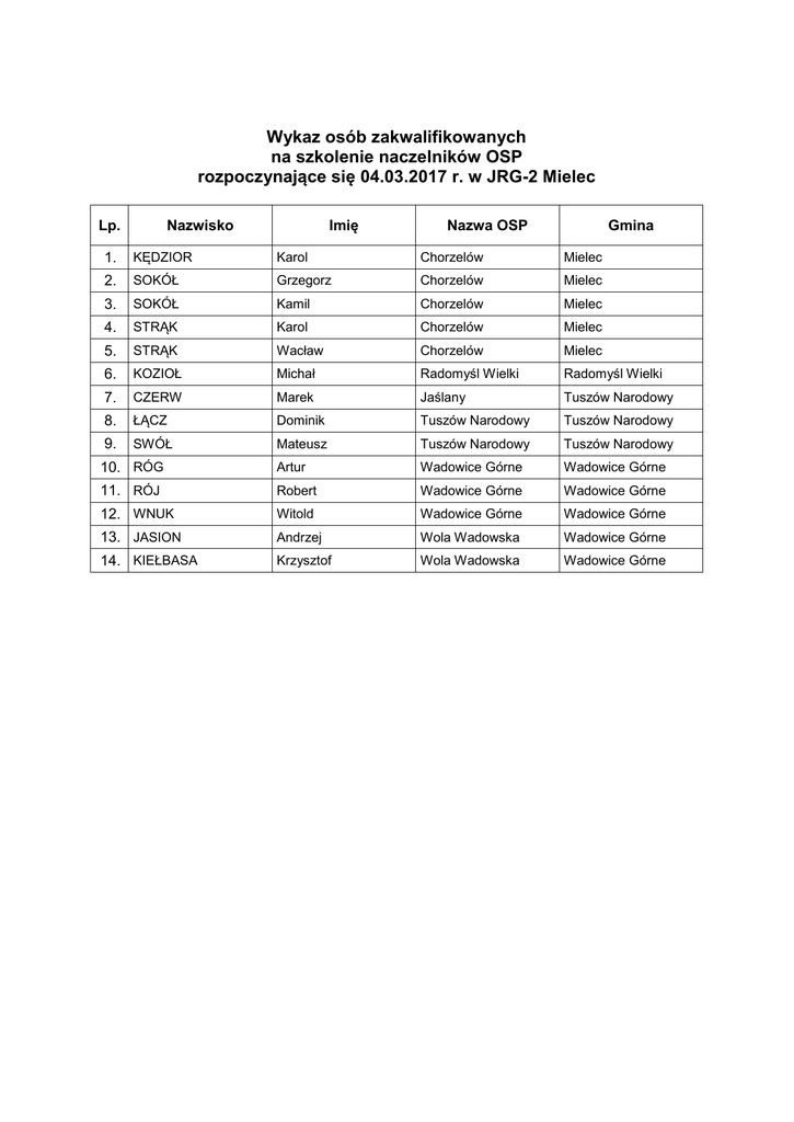 Wykaz osób zakwalifikowanych na szkolenie naczelników OSP rozpoczynające się 04.03.2017 r. w JRG-2 Mielec Lp. Imię Nazwisko Nazwa OSP Gmina 1. KĘDZIOR Karol Chorzelów Mielec 2. SOKÓŁ Grzegorz Chorzelów Mielec 3. SOKÓŁ Kamil Chorzelów Mielec 4. STRĄK Karol Chorzelów Mielec 5. STRĄK Wacław Chorzelów Mielec 6. KOZIOŁ Michał Radomyśl Wielki Radomyśl Wielki 7. CZERW Marek Jaślany Tuszów Narodowy 8. ŁĄCZ Dominik Tuszów Narodowy Tuszów Narodowy 9. SWÓŁ Mateusz Tuszów Narodowy Tuszów Narodowy 10. RÓG Artur Wadowice Górne Wadowice Górne 11. RÓJ Robert Wadowice Górne Wadowice Górne 12. WNUK Witold Wadowice Górne Wadowice Górne 13. JASION Andrzej Wola Wadowska Wadowice Górne 14. KIEŁBASA Krzysztof Wola Wadowska Wadowice Górne