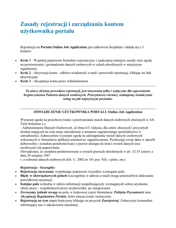 Zasady rejestracji i zarządzania kontem użytkownika portalu Rejestracja na Portalu Online Job Application jest całkowicie bezpłatna i składa się z 3 kroków: Krok 1 - Wypełnij poprawnie formularz rejestracyjny i zaakceptuj niniejsze zasady oraz zgodę na przetwarzanie i gromadzenie danych osobowych w celach określonych w niniejszym regulaminie. Krok 2 - Aktywacja konta - odbierz wiadomość e-mail i potwierdź rejestrację, klikając na link aktywacyjny Krok 3 - Akceptacja konta przez Administratora. Ta nieco złożona procedura rejestracji, jest stosowana tylko i wyłącznie dla zapewnienia bezpieczeństwa Państwa danych osobowych. Priorytetowo również, traktujemy świadczenie usług na jak najwyższym poziomie. OŚWIADCZENIE UŻYTKOWNIKA PORTALU Online Job Application Wyrażam zgodę na przechowywanie i przetwarzanie moich danych osobowych złożonych w ASTech Solutions s.c. - Administratora Danych Osobowych, ul Orna 6/3. Gdynia, dla celów obecnych i przyszłych działań mających na celu moje zatrudnienie u armatora zagranicznego (pośrednictwo w zatrudnieniu). Jednocześnie wyrażam zgodę na udostępnianie moich danych osobowych wskazanych w formularzu aplikacji armatorowi zagranicznemu. Przekazuję swoje dane w sposób dobrowolny i zostałem poinformowany o prawie dostępu do treści swoich danych oraz możliwości ich poprawiania. Oświadczam, że zostałem poinformowany o swoich prawach określonych w art. 32-35 ustawy z dnia 29 sierpnia 1997 r. o ochronie danych osobowych (Dz. U. 2002 nr 101 poz. 926, z późn. zm.) Rejestracja - Szczegóły: Rejestrację zaczynamy wypełniając poprawnie wszystkie wymagane pola. Błędy w obowiązkowych polach (szczególnie w adresie e-mail) mogą uniemożliwić dokonanie prawidłowej rejestracji. Kolejne pola wchodzą w zakres informacji uzupełniających, wymaganych celem uzyskania oferty pracy - wypełnianych przez użytkownika po zalogowaniu. Zwracamy jednak uwagę na pola, w końcowej części formularza: Polityka Prywatności oraz Akceptacja Regulaminu Portalu, które muszą zostać zaznaczone. Rejestrację na tym etapie kończymy klikając na przycisk Zarejestruj. Zobaczymy komunikat informujący nas o zakończeniu rejestracji. Po zaakceptowaniu Twojego konta, możesz się zalogować. E-mail rejestracyjny będzie zawierał link aktywacyjny. Klikając w niego aktywujemy swoje konto. Konta z potwierdzonym adresem e-mail, nie będą jeszcze gotowe do zalogowania się. Należy jeszcze zaczekać na zaakceptowanie, i odblokowanie konta Administratora. Wszystkie konta, są aktywowane niemal natychmiast. Wyjątek mogą stanowić sytuacje, gdy konto wymaga dodatkowej weryfikacji. Uwagi: Sporadycznie mogą pojawić się sytuacje, że wiadomość e-mail z linkiem aktywacyjnym może trafiać do folderu Spam. Jeśli po rejestracji nie otrzymali Państwo e-maila zwrotnego z linkiem aktywacyjnym, prosimy o sprawdzenie zawartości tego folderu. Inną przyczyną nie otrzymania takiej wiadomości, może być błędnie podany adres e-mail w formularzu rejestracji. Jeśli nie otrzymali Państwo e-maila aktywacyjnego, prosimy o kontakt z Administratorem portalu, podając podstawowe dane z rejestracji, aby mógł on ręcznie aktywować konto. Prosimy cierpliwie zaczekać na wiadomość e-mail zawierającą link aktywacyjny, i nie zakładać kolejnego konta, w sytuacji gdy opóźnia się jego nadejście. Nie zalecamy zakładać więcej niż jednego konta! Jeżeli zapomnieli Państwo login lub hasło, prosimy o skorzystania z opcji Forgot Password dostępnej w module logowania, lub kontakt z Administratorem. Aktualizacja danych: Podane w trakcie rejestracji dane możemy dowolnie edytować i aktualizować. Przechodząc przez kolejne zakładki, możemy edytować / aktualizować pozostałe dane widoczne w naszym profilu. Aby zatwierdzić wszystkie zmiany, na każdej zakładce klikamy ikonę Save Polityka Prywatności § 1. Bezpieczeństwo danych 1. Administratorem gromadzonych danych portalu jest firma AS-Tech Solutions s.c z siedzibą w Gdyni, ul. Orna 6/3 wpisany w rejestrze Agencji Zatrudnienia, pod numerem rejestru 5637. 2. Dane osobowe jak również ich ochronę traktujemy priorytetowo. Użytkownikom zapewniamy wszelkie prawa określone w art. 32-35 ustawy z dnia 29 sierpnia 1997 r. o ochronie danych osobowych (Dz. U. 2002 nr 101 poz. 926, z późn. zm.) a dane Użytkownika są chronione zgodnie z rozporządzeniem Ministra Spraw wewnętrznych i Administracji z dnia 29 kwietnia 2004 r. w sprawie dokumentacji przetwarzania danych osobowych oraz warunków technicznych i organizacyjnych, jakim powinny odpowiadać urządzenia i systemy informatyczne służące do przetwarzania danych osobowych. § 2. Rejestracja i konto użytkownika 1. Dane podawane podczas rejestracji oraz podczas edycji danych Portalu Online Job Application gromadzone są tylko i wyłącznie dla celów obecnych i przyszłych działań mających na celu zatrudnienie użytkownika u armatora zagranicznego (pośrednictwo w zatrudnieniu). Rejestracja w Portalu Online Job Application jest mozliwa tylko poprzez wyrażenie zgody i jest jednoznaczna z wyrażeniem zgody na udostępnianie danych osobowych wskazanych w Portalu Online Job Application armatorowi zagranicznemu w celu zatrudnienia Uzytkownika przez tego armatora. Dane sa przekazane w sposób dobrowolny i z poinformawaniem o prawie dostępu do treści swoich danych oraz możliwości ich poprawiania. 2. Każdy zarejestrowany użytkownik ma pełny wgląd do swoich danych podanych w trakcie rejestracji konta, i w każdej chwili może dokonać ich zmian lub aktualizacji. 3. Każdy zarejestrowany użytkownik w dowolnym momencie może usunąć swoje konto. Aby tego dokonać, wystarczy skontaktować się z Administratorem Danych Osobowych i złożyć dyspozycje usunięcia konta .