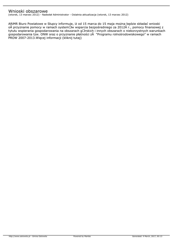 Wnioski obszarowe (wtorek, 13 marzec 2012) - Nadesłał Administrator - Ostatnia aktualizacja (wtorek, 13 marzec 2012) ARiMR Biuro Powiatowe w Słupcy informuje, iż od 15 marca do 15 maja można będzie składać wnioski o przyznanie pomocy w ramach systemÃłw wsparcia bezpośredniego za 2012 r., pomocy finansowej z tytułu wspierania gospodarowania na obszarach gÃłrskich i innych obszarach o niekorzystnych warunkach gospodarowania tzw. ONW oraz o przyznanie płatności z "Programu rolnośrodowiskowego" w ramach PROW 2007-2013.Więcej informacji (kliknij tutaj) http://www.ostrowite.pl - Gmina Ostrowite Powered by Mambo Generated: 9 March, 2017, 00:13
