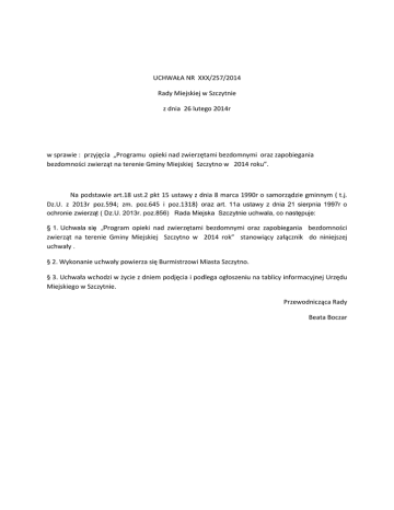 UCHWAŁA NR XXX/257/2014 Rady Miejskiej w Szczytnie z dnia 26 lutego 2014r w sprawie : przyjęcia „Programu opieki nad zwierzętami bezdomnymi oraz zapobiegania bezdomności zwierząt na terenie Gminy Miejskiej Szczytno w 2014 roku”. Na podstawie art.18 ust.2 pkt 15 ustawy z dnia 8 marca 1990r o samorządzie gminnym ( t.j. Dz.U. z 2013r poz.594; zm. poz.645 i poz.1318) oraz art. 11a ustawy z dnia 21 sierpnia 1997r o ochronie zwierząt ( Dz.U. 2013r. poz.856) Rada Miejska Szczytnie uchwala, co następuje: § 1. Uchwala się „Program opieki nad zwierzętami bezdomnymi oraz zapobiegania bezdomności zwierząt na terenie Gminy Miejskiej Szczytno w 2014 rok” stanowiący załącznik do niniejszej uchwały . § 2. Wykonanie uchwały powierza się Burmistrzowi Miasta Szczytno. § 3. Uchwała wchodzi w życie z dniem podjęcia i podlega ogłoszeniu na tablicy informacyjnej Urzędu Miejskiego w Szczytnie. Przewodnicząca Rady Beata Boczar Załącznik do Uchwały Nr XXX/257/2014 Rady Miejskiej w Szczytnie z dnia 26.02.2014r Program opieki nad zwierzętami bezdomnymi oraz zapobiegania bezdomności zwierząt na terenie Gminy Miejskiej Szczytno w 2014 roku. Rozdział I. Postanowienia ogólne. § 1. 1.Program dotyczy zwierząt bezdomnych domowych , w szczególności psów, kotów i gospodarskich oraz wolno żyjących kotów przebywających w granicach administracyjnych miasta Szczytno . 2. Realizacja programu odbywa się zgodnie z przepisami Ustawy z dnia 21 sierpnia 1997r o ochronie zwierząt, w szczególności z zachowaniem zasad humanitaryzmu. 3. Cele Programu to: 1) zapewnienie bezdomnym zwierzętom miejsca w schronisku dla zwierząt, 2) opieka nad wolno żyjącymi kotami, w tym ich dokarmianie, 3) odławianie bezdomnych zwierząt, 4) obligatoryjna sterylizacja albo kastracja zwierząt w schronisku dla zwierząt, 5) poszukiwanie właścicieli dla bezdomnych zwierząt, 6) usypianie ślepych miotów, 7) wskazanie gospodarstwa rolnego w celu zapewnienia miejsca dla zwierząt gospodarskich, 8) zapewnienie całodobowej opieki weterynaryjnej w przypadkach zdarzeń drogowych z udziałem zwierząt, 9) stworzenie bazy danych właścicieli psów na terenie Gminy Miejskiej Szczytno oraz trwałe oznakowanie psów, 4. Funkcję koordynatora działań dotyczących opieki nad zwierzętami bezdomnymi oraz ograniczania bezdomności zwierząt pełni Wydział Gospodarki Miejskiej. 5. Realizację działań dotyczących opieki nad zwierzętami bezdomnymi oraz przeciwdziałania bezdomności zwierząt prowadzą: 1) Schronisko dla Zwierząt „Cztery Łapy” w Szczytnie, 2) organizacje pozarządowe , których statutowym celem jest ochrona zwierząt. Rozdział II. Realizacja zadań. § 2. Zwierzęta bezdomne tj. zwierzęta przebywające na terenie Gminy Miejskiej Szczytno, które uciekły, zabłąkały się lub zostały porzucone przez człowieka a nie ma możliwości ustalenia ich właściciela lub innej osoby, pod której opieką trwale dotąd pozostawały, po odłowieniu zostaną przewiezione i umieszczone w Schronisku dla Zwierząt „Cztery Łapy” w Szczytnie. § 3. Sprawowanie opieki nad kotami wolno żyjącymi realizowane będzie poprzez: 1. Współpracę ze służbami weterynaryjnymi w przypadkach istniejącej potrzeby podjęcia leczenia kotów wolno żyjących, 2. Współpracę z opiekunami kotów wolno żyjących, 3. Prowadzenie akcji dokarmiania wolno żyjących kotów szczególnie w okresach niekorzystnych warunków atmosferycznych w oparciu o współpracę z organizacjami pozarządowymi, których statutowym celem jest ochrona zwierząt. § 4. Odławianie bezdomnych zwierząt realizowane będzie w sposób następujący: 1. Podmiotem uprawnionym do przeprowadzania odławiania zwierząt w sposób stały, w odniesieniu do zgłoszeń dotyczących pozostawionych bez opieki zwierząt, w szczególności chorych lub powodujących zagrożenie bezpieczeństwa na terenie Gminy Miejskiej Szczytno - jest podmiot prowadzący Schronisko dla Zwierząt „Cztery Łapy” w Szczytnie, 2 . Termin okresowego odławiania bezdomnych zwierząt oraz granice terenu będą podane do publicznej wiadomości z 21-dniowym wyprzedzeniem i będzie przeprowadzane przez podmioty wskazane przez Burmistrza Miasta, 3. Akcja odławiania zwierząt powinna być przeprowadzona w sposób sprawny nie zagrażający bezpieczeństwu i porządkowi publicznemu, przy użyciu sprzętu nie mogącego stwarzać zagrożenia dla życia i zdrowia zwierząt ani zadawać im cierpienia. 4. Koszty odławiania bezdomnych zwierząt, umieszczania ich w schronisku, zapewnienia im w razie potrzeby pomocy lekarsko-weterynaryjnej oraz utrzymania zwierzęcia w schronisku pokrywane są z budżetu Gminy Miejskiej Szczytno, 5. W przypadku ustalenia właściciela zwierzęcia obowiązany jest on odebrać zwierzę ze schroniska w ciągu 14 dni od dnia otrzymania zawiadomienia, 6. Po upływie 14 dni prowadzący schronisko po uzgodnieniu z lekarzem weterynarii sprawującym opiekę w schronisku decyduje o dalszym losie zwierzęcia np. przekazaniu do adopcji. § 5. Schronisko dla Zwierząt „Cztery Łapy” w Szczytnie przed przekazaniem do adopcji zwierząt , obligatoryjnie przeprowadzać będzie zabiegi sterylizacji i kastracji zwierząt bezdomnych przyjętych do Schroniska, z wyjątkiem tych u których istnieją przeciwwskazania do wykonywania tych zabiegów. § 6. Poszukiwanie nowych właścicieli dla bezdomnych zwierząt będzie realizowane przez: 1.Schronisko dla Zwierząt „Cztery Łapy” poprzez publikujące informacji o zwierzętach oczekujących na adopcję na stronie internetowej Schroniska , 2. Gminę Miejską Szczytno poprzez promocję zwierząt ze schroniska oraz umieszczanie ogłoszeń o adopcji zwierząt na tablicach informacyjnych, 3.Organizacje pozarządowe poprzez prowadzenie akcji adopcyjnych i promocyjnych. § 6. Usypianie ślepych miotów zwierząt realizują: 1. Schronisko dla Zwierząt „Cztery Łapy” w Szczytnie poprzez dokonywanie przez lekarza w