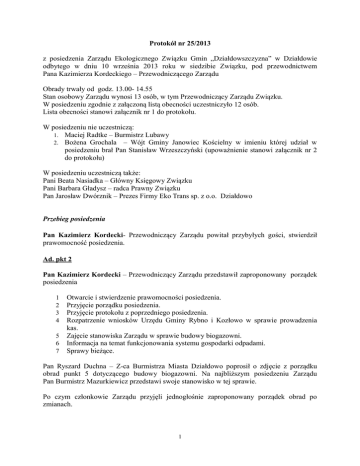 Protokół nr 25/2013 z posiedzenia Zarządu Ekologicznego Związku Gmin „Działdowszczyzna” w Działdowie odbytego w dniu 10 września 2013 roku w siedzibie Związku, pod przewodnictwem Pana Kazimierza Kordeckiego – Przewodniczącego Zarządu Obrady trwały od godz. 13.00- 14.55 Stan osobowy Zarządu wynosi 13 osób, w tym Przewodniczący Zarządu Związku. W posiedzeniu zgodnie z załączoną listą obecności uczestniczyło 12 osób. Lista obecności stanowi załącznik nr 1 do protokołu. W posiedzeniu nie uczestniczą: 1. Maciej Radtke – Burmistrz Lubawy 2. Bożena Grochala – Wójt Gminy Janowiec Kościelny w imieniu której udział w posiedzeniu brał Pan Stanisław Wrzeszczyński (upoważnienie stanowi załącznik nr 2 do protokołu) W posiedzeniu uczestniczą także: Pani Beata Nasiadka – Główny Księgowy Związku Pani Barbara Gładysz – radca Prawny Związku Pan Jarosław Dwórznik – Prezes Firmy Eko Trans sp. z o.o. Działdowo Przebieg posiedzenia Pan Kazimierz Kordecki- Przewodniczący Zarządu powitał przybyłych gości, stwierdził prawomocność posiedzenia. Ad. pkt 2 Pan Kazimierz Kordecki – Przewodniczący Zarządu przedstawił zaproponowany porządek posiedzenia 1 2 3 4 5 6 7 Otwarcie i stwierdzenie prawomocności posiedzenia. Przyjęcie porządku posiedzenia. Przyjęcie protokołu z poprzedniego posiedzenia. Rozpatrzenie wniosków Urzędu Gminy Rybno i Kozłowo w sprawie prowadzenia kas. Zajęcie stanowiska Zarządu w sprawie budowy biogazowni. Informacja na temat funkcjonowania systemu gospodarki odpadami. Sprawy bieżące. Pan Ryszard Duchna – Z-ca Burmistrza Miasta Działdowo poprosił o zdjęcie z porządku obrad punkt 5 dotyczącego budowy biogazowni. Na najbliższym posiedzeniu Zarządu Pan Burmistrz Mazurkiewicz przedstawi swoje stanowisko w tej sprawie. Po czym członkowie Zarządu przyjęli jednogłośnie zaproponowany porządek obrad po zmianach. 1 Ad. pkt 3 Bez uwag – jednomyślnie, Zarząd bez odczytania przyjął protokół z poprzedniego posiedzenia Zarządu. Ad. pkt. 4 Pan Kazimierz Kordecki – Przewodniczący Zarządu przekazał, że Gminy Rybno i Kozłowo wystąpiły z wnioskiem o umożliwienie mieszkańcom dokonywanie opłaty za gospodarowanie odpadami w placówkach banku spółdzielczego funkcjonujących na terenie ich gmin a nie w kasach gmin jak to określała Uchwała Zgromadzenia Związku. Wnioski swoje uzasadnili dodatkowym obciążeniem kas gmin. W grudniu 2012 roku Zgromadzenie Związku podjęło uchwałę określającą sposób dokonywania opłaty za gospodarowanie odpadami komunalnymi przez mieszkańców. W czasie realizacji uchwały Gminy Rybno i Kozłowo odmówiły zainstalowania modułu kasowego. W przypadku pozytywnego stanowiska Zarządu w/w sprawie zostanie przygotowany projekt uchwały Zgromadzenia w sprawie funkcjonowania kas. Na chwilę obecną mieszkańcy gminy Kozłowo i Rybno dokonując opłat ponoszą dodatkowe koszty z tytułu prowizji. Pani Beata Nasiadka – Główny księgowy Związku przekazała, że Gmina Janowo nie ma swojej kasy w związku z czym już na etapie projektu uchwały dotyczącej funkcjonowania kas Pan Wójt wnioskował o podpisanie umowy z Bankiem Spółdzielczym na takich warunkach, aby mieszkańcy nie ponosili dodatkowych opłat. Bank w trakcie rozmowy na temat przyjmowania opłat od mieszkańców Kozłowa nie przystał na warunki takie jak ustalone są dla Janowa. W tym przypadku proponuje prowizje w wysokości 1,5 zł od wpłaty. Ponadto moduł kasowy funkcjonujący w gminach bezpośrednio przypisuje mieszkańcom należną opłatę natomiast z banku przychodzą wyciągi i pracownik Związku musi ręcznie wprowadzać do systemu i w tym momencie zakupiony przez Związek moduł kasowy staje się bezużyteczny. Pan Edmund Ligman – Wójt Gminy Rybno przekazał, że nie zainstaluje u siebie w Gminie modułu kasowego, gdyż ich kasjerka ma dużo pracy związanej z bieżąca działalnością gminy a przyjęcie jeszcze opłaty byłoby to wielkim obciążeniem. Ponadto zaproponowana kwota 200 zł przez Związek za prowadzenie kasy uważa, że to kpina. Pan Kazimierz Kordecki – Przewodniczący Zarządu zapytał w jaki sposób mieszkańcy gminy Rybno wpłacają opłatę? Pan Edmund Ligman – Wójt Gminy Rybno odpowiedział, że są kierowani do banku spółdzielczego. Ponadto przekazał, że prowadził rozmowy z panem Dyrektorem Banku i jest w stanie podpisać umowę na prowizję od wpłaty w wysokości 1 zł. Pani Beata Nasiadka – Główny księgowy Związku przekazała, że propozycja ze strony Związku była 300 a nie 200 zł. Kwota ta wstępna propozycją i mogła uleć zmianie gdyby Gmina poniosła wyższe koszty. 2 Pan Jacek Jankowski – Wójt Gminy Kołowo Również jest zdania, że zaproponowana stawka przez Związek jest za niska a dodatkowo przyjmowanie opłat w kasie gminy obciąży pracę gminy. Wnioskuje, aby Związek podpisał umowę z bankiem spółdzielczym w Kozłowie. Wójt zobowiązał się do przeprowadzenia rozmów w tej sprawie z dyrektorem banku. Pan Jan Przyborski – Wójt Gminy Iłowo-Osada przekazał, że przed posiedzeniem rozmawiał z pracownikami Gminy w sprawie funkcjonowania kasy w zakresie przyjmowania opłaty od mieszkańców. Koszty jakie już poniosła Gmina są dużo wyższe niż stawka zaproponowana przez Związek. Pomimo tego dalej w gminie będzie funkcjonował ten system, żeby mieszkańcy mieli możliwość dokonywania wpłat. Związek został powołany do rozwiązywania problemów związanych z gospodarką odpadami a my musimy im w tym pomagać. Pan Dariusz Szypulski – Burmistrz Nidzicy przekazał, że największy problem to są koszty związane z obsługą kasy. Dla Nidzicy funkcjonuje kasa w Przedsiębiorstwie Usług Gospodarki Komunalnej gdzie w miesiącu sierpniu przez 2 tygodnie kasa była wyłączona z bieżącej działalności spółki a przyjmowała tylko opłatę za śmieci. Wie, że Pan Jabłonka wystąpił w pismem o rozwiązanie