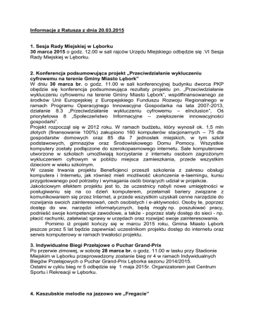 Informacje z Ratusza z dnia 20.03.2015 1. Sesja Rady Miejskiej w Lęborku 30 marca 2015 o godz. 12.00 w sali rajców Urzędu Miejskiego odbędzie się .VI Sesja Rady Miejskiej w Lęborku. 2. Konferencja podsumowująca projekt „Przeciwdziałanie wykluczeniu cyfrowemu na terenie Gminy Miasto Lębork” W dniu 30 marca br. o godz. 11.00 w sali konferencyjnej budynku dworca PKP obędzie się konferencja podsumowująca rezultaty projektu pn. „Przeciwdziałanie wykluczeniu cyfrowemu na terenie Gminy Miasto Lębork”, współfinansowanego ze środków Unii Europejskiej z Europejskiego Funduszu Rozwoju Regionalnego w ramach Programu Operacyjnego Innowacyjna Gospodarka na lata 2007-2013, działanie 8.3 „Przeciwdziałanie wykluczeniu cyfrowemu – eInclusion”, Oś priorytetowa 8 „Społeczeństwo Informacyjne – zwiększenie innowacyjności gospodarki”. Projekt rozpoczął się w 2012 roku. W ramach budżetu, który wynosił ok. 1,5 mln złotych (finansowanie 100%) zakupiono 160 komputerów stacjonarnych – 75 dla gospodarstw domowych oraz 85 dla 7 jednostek miejskich, w tym szkół podstawowych, gimnazjów oraz Środowiskowego Domu Pomocy. Wszystkie komputery zostały podłączone do szerokopasmowego internetu. Sale komputerowe utworzone w szkołach umożliwiają korzystanie z internetu osobom zagrożonym wykluczeniem cyfrowym w pobliżu miejsca zamieszkania, przede wszystkim dzieciom w wieku szkolnym. W czasie trwania projektu Beneficjenci przeszli szkolenia z zakresu obsługi komputera i Internetu, jak również mieli możliwość ukończenia e-laerningu, kursu przygotowanego pod potrzeby i wymagania osób biorących udział w projekcie. Jakościowym efektem projektu jest to, że uczestnicy nabyli nowe umiejętności w posługiwaniu się na co dzień komputerem, przełamali bariery związane z komunikowaniem się przez Internet, a przede wszystkim uzyskali cenne narzędzie do rozwijania swoich zainteresowań, cech osobistych i e-aktywności. Osoby te, poprzez dostęp do ww. narzędzi informatycznych, będą mogły np. poszukiwać pracy, podnieść swoje kompetencje zawodowe, a także - poprzez stały dostęp do sieci - np. płacić rachunki, załatwiać sprawy w urzędach oraz rozwijać swoje zainteresowania. Pomimo iż projekt kończy się w marcu 2015 roku, Gmina Miasto Lębork jeszcze przez 5 lat będzie zapewniać uczestnikom projektu dostęp do internetu oraz serwis komputerowy w ramach trwałości projektu. 3. Indywidualne Biegi Przełajowe o Puchar Grand-Prix Po przerwie zimowej, w sobotę 28 marca br. o godz. 11.00 w lasku przy Stadionie Miejskim w Lęborku przeprowadzony zostanie bieg nr 4 w ramach Indywidualnych Biegów Przełajowych o Puchar Grand-Prix Lęborka sezonu 2014/2015. Ostatni w cyklu bieg nr 5 odbędzie się 1 maja 2015r. Organizatorem jest Centrum Sportu i Rekreacji w Lęborku. 4. Kaszubskie melodie na jazzowo we „Fregacie” Lęborskie Centrum Kultury „Fregata” zaprasza na kolejne wydarzenie dla miłośników ambitnych dźwięków. Już 19 kwietnia na scenie przy ulicy Gdańskiej 12 zaprezentuje się kwartet jazzowy Almost Jazz Group. Początek o godzinie 18.00. Zespół zaprezentuje swój najnowszy album "Na Kaszëbach". To płyta, która uzupełnia lukę na naszym rynku muzycznym, bowiem "Na Kaszëbach" prezentuje materiał leżący pomiędzy folklorem a ambitną muzyką jazzową. Muzycy serwują świeże, instrumentalne aranżacje m.in. takich utworów jak: "Wele wele wetka", „Nasza zemia” czy "Hej morze, morze". Bilety w cenie 12 zł można nabywać w Centrum Informacji Turystycznej „Brama Kaszubskiego Pierścienia” przy alei Niepodległości 6 oraz w kasie Kina „Fregata” przy ulicy Gdańskiej 12.