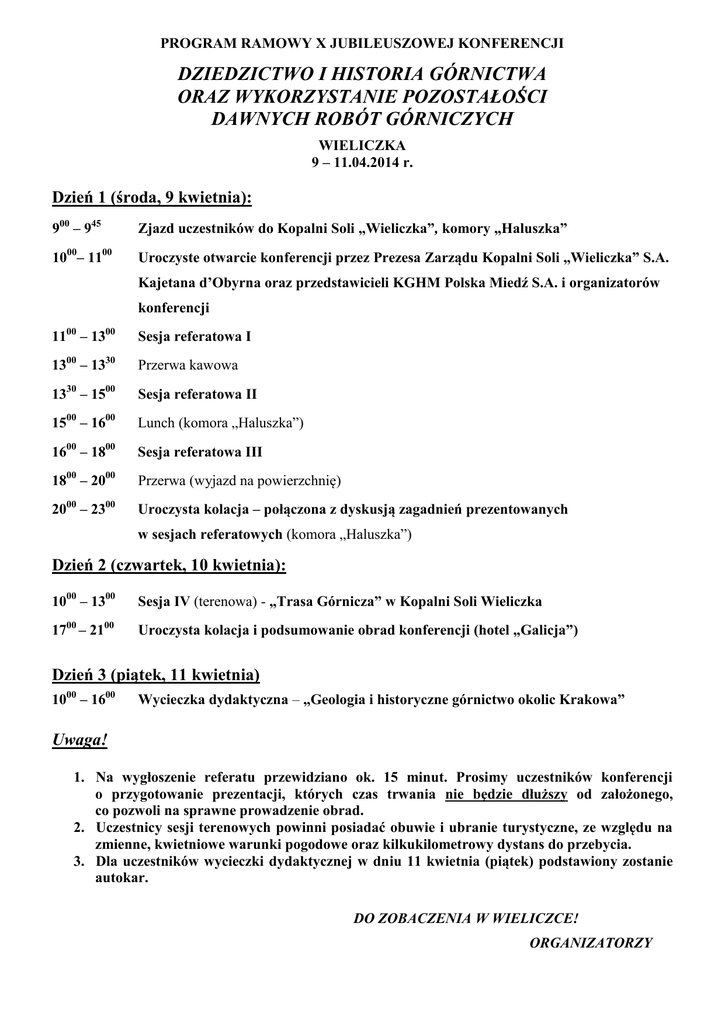 PROGRAM RAMOWY X JUBILEUSZOWEJ KONFERENCJI DZIEDZICTWO I HISTORIA GÓRNICTWA ORAZ WYKORZYSTANIE POZOSTAŁOŚCI DAWNYCH ROBÓT GÓRNICZYCH WIELICZKA 9 – 11.04.2014 r. Dzień 1 (środa, 9 kwietnia): 900 – 945 Zjazd uczestników do Kopalni Soli „Wieliczka”, komory „Haluszka” 1000– 1100 Uroczyste otwarcie konferencji przez Prezesa Zarządu Kopalni Soli „Wieliczka” S.A. Kajetana d’Obyrna oraz przedstawicieli KGHM Polska Miedź S.A. i organizatorów konferencji 1100 – 1300 Sesja referatowa I 1300 – 1330 Przerwa kawowa 1330 – 1500 Sesja referatowa II 1500 – 1600 Lunch (komora „Haluszka”) 1600 – 1800 Sesja referatowa III 1800 – 2000 Przerwa (wyjazd na powierzchnię) 2000 – 2300 Uroczysta kolacja – połączona z dyskusją zagadnień prezentowanych w sesjach referatowych (komora „Haluszka”) Dzień 2 (czwartek, 10 kwietnia): 1000 – 1300 Sesja IV (terenowa) - „Trasa Górnicza” w Kopalni Soli Wieliczka 1700 – 2100 Uroczysta kolacja i podsumowanie obrad konferencji (hotel „Galicja”) Dzień 3 (piątek, 11 kwietnia) 1000 – 1600 Wycieczka dydaktyczna – „Geologia i historyczne górnictwo okolic Krakowa” Uwaga! 1. Na wygłoszenie referatu przewidziano ok. 15 minut. Prosimy uczestników konferencji o przygotowanie prezentacji, których czas trwania nie będzie dłuższy od założonego, co pozwoli na sprawne prowadzenie obrad. 2. Uczestnicy sesji terenowych powinni posiadać obuwie i ubranie turystyczne, ze względu na zmienne, kwietniowe warunki pogodowe oraz kilkukilometrowy dystans do przebycia. 3. Dla uczestników wycieczki dydaktycznej w dniu 11 kwietnia (piątek) podstawiony zostanie autokar. DO ZOBACZENIA W WIELICZCE! ORGANIZATORZY
