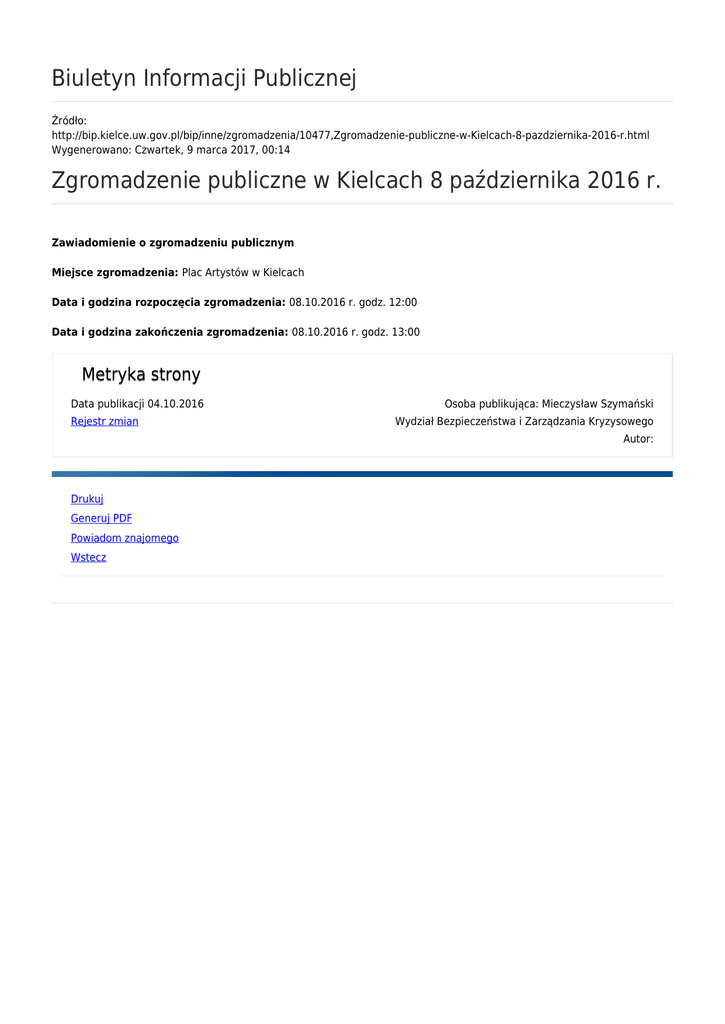 Biuletyn Informacji Publicznej Źródło: http://bip.kielce.uw.gov.pl/bip/inne/zgromadzenia/10477,Zgromadzenie-publiczne-w-Kielcach-8-pazdziernika-2016-r.html Wygenerowano: Czwartek, 9 marca 2017, 00:14 Zgromadzenie publiczne w Kielcach 8 października 2016 r. Zawiadomienie o zgromadzeniu publicznym Miejsce zgromadzenia: Plac Artystów w Kielcach Data i godzina rozpoczęcia zgromadzenia: 08.10.2016 r. godz. 12:00 Data i godzina zakończenia zgromadzenia: 08.10.2016 r. godz. 13:00 Metryka strony Data publikacji 04.10.2016 Rejestr zmian Osoba publikująca: Mieczysław Szymański Wydział Bezpieczeństwa i Zarządzania Kryzysowego Autor: Drukuj Generuj PDF Powiadom znajomego Wstecz