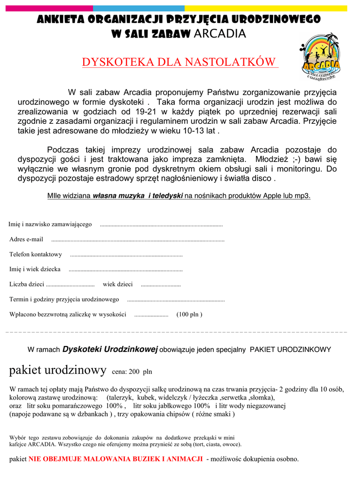 ANKIETA ORGANIZACJI PRZYJĘCIA URODZINOWEGO W SALI ZABAW ARCADIA DYSKOTEKA DLA NASTOLATKÓW W sali zabaw Arcadia proponujemy Państwu zorganizowanie przyjęcia urodzinowego w formie dyskoteki . Taka forma organizacji urodzin jest możliwa do zrealizowania w godziach od 19-21 w każdy piątek po uprzedniej rezerwacji sali zgodnie z zasadami organizacji i regulaminem urodzin w sali zabaw Arcadia. Przyjęcie takie jest adresowane do młodzieży w wieku 10-13 lat . Podczas takiej imprezy urodzinowej sala zabaw Arcadia pozostaje do dyspozycji gości i jest traktowana jako impreza zamknięta. Młodzież ;-) bawi się wyłącznie we własnym gronie pod dyskretnym okiem obsługi sali i monitoringu. Do dyspozycji pozostaje estradowy sprzęt nagłośnieniowy i światła disco . MIle widziana własna muzyka i teledyski na nośnikach produktów Apple lub mp3. Imię i nazwisko zamawiającego Adres e-mail ................................................................................... ..................................................................................................................... Telefon kontaktowy ............................................................................ Imię i wiek dziecka ............................................................................. Liczba dzieci ................................. wiek dzieci Termin i godziny przyjęcia urodzinowego Wpłacono bezzwrotną zaliczkę w wysokości ........................... .................................................................. ....................... (100 pln ) -‐-‐-‐-‐-‐-‐-‐-‐-‐-‐-‐-‐-‐-‐-‐-‐-‐-‐-‐-‐-‐-‐-‐-‐-‐-‐-‐-‐-‐-‐-‐-‐-‐-‐-‐-‐-‐-‐-‐-‐-‐-‐-‐-‐-‐-‐-‐-‐-‐-‐-‐-‐-‐-‐-‐-‐-‐-‐-‐-‐-‐-‐-‐-‐-‐-‐-‐-‐-‐-‐-‐-‐-‐-‐-‐-‐-‐-‐-‐-‐-‐-‐ W ramach Dyskoteki Urodzinkowej obowiązuje jeden specjalny PAKIET URODZINKOWY pakiet urodzinowy cena: 200 pln W ramach tej opłaty mają Państwo do dyspozycji salkę urodzinową na czas trwania przyjęcia- 2 godziny dla 10 osób, kolorową zastawę urodzinową: (talerzyk, kubek, widelczyk / łyżeczka ,serwetka ,słomka), oraz litr soku pomarańczowego 100% , litr soku jabłkowego 100% i litr wody niegazowanej (napoje podawane są w dzbankach ) , trzy opakowania chipsów ( różne smaki ) Wybór tego zestawu zobowiązuje do dokonania zakupów na dodatkowe przekąski w mini kafejce ARCADIA. Wszystko czego nie oferujemy można przynieść ze sobą (tort, ciasta, owoce). pakiet NIE OBEJMUJE MALOWANIA BUZIEK I ANIMACJI - możliwośc dokupienia osobno. Dodatkowe przekąski wg wyboru z tabeli produktów: Artykuł Cena Paluszki Lajkonik Junior opakowanie 4,00 pln Chipsy Chitos opakowanie 3,50 pln Gumy Mamba kostka 1,00 pln Żelki Haribo opakowanie 4,0 0pln Cukierki NIMM 2 / żujki NIMM 2 opakowanie 3,50 / 4,00 pln Ciasteczka HIT opakowanie 5,00 pln Batonik PRINCE-POLO Mini sztuka 1,00 pln Ciasteczka Junior Safari opakowanie 3,50 pln Chrupki kukurydziane opakowanie 2,00 pln Kubuś Play - smaki do wyboru 0,5 l 3,00 pln Water Kubuß PLAY – smaki do wyboru 0,5 l 3,00 pln Coca-Cola /Zero/Fanta/Sprite 0,5 l 4,00 pln Woda niegazowana / gazowana 0,5 l 2,50 pln Woda niegazowana 1l 3,50 pln Chrupki BINGO opakowanie 2,00 pln Sok 100% - kartonik 0,2l 2,00 pln Sok 100 % Cappy 0,33l 3,00 pln FRUGO – smaki do wyboru 0,25l 3,00 pln Sok 100 % pomarańczowy 1L 5,00 pln Sok 100 % jabłkowy 1L 5,00 pln Ilość sztuk suma Dodatkowo przekąski ciepłe płatne osobno : - Pizza ( 30-32 cm średnicy ) wg. Cennika Pizzerii -‐-‐-‐-‐-‐-‐-‐-‐-‐-‐-‐-‐-‐-‐-‐-‐-‐-‐-‐-‐-‐-‐-‐-‐-‐-‐-‐-‐-‐-‐-‐-‐-‐-‐-‐-‐-‐-‐-‐-‐-‐-‐-‐-‐-‐-‐-‐-‐-‐-‐-‐-‐-‐-‐-‐-‐-‐-‐-‐-‐-‐-‐-‐-‐-‐-‐-‐-‐-‐-‐-‐-‐-‐-‐-‐-‐-‐-‐-‐-‐-‐-‐-‐-‐-‐ OPCJE DODATKOWE: v Animacja jako dodatek do pakietu 2 pln od osoby v Specjalne zaproszenie - płatne 0,50 pln/sztuka ilość osób ......................... ilość zaproszeń ............... Powyżej 10-ciorga dzieci - każde dodatkowe dziecko płatne wg cennika sali zabaw Arcadia Oświadczam, iż zapoznałam / em się z regulaminem sali zabaw ARCADIA i regulaminem organizacji urodzin i akceptuję go. ............................................................... podpis osoby przyjmującej zgłoszenie ........................................................ data i podpis Rodzica/Opiekuna
