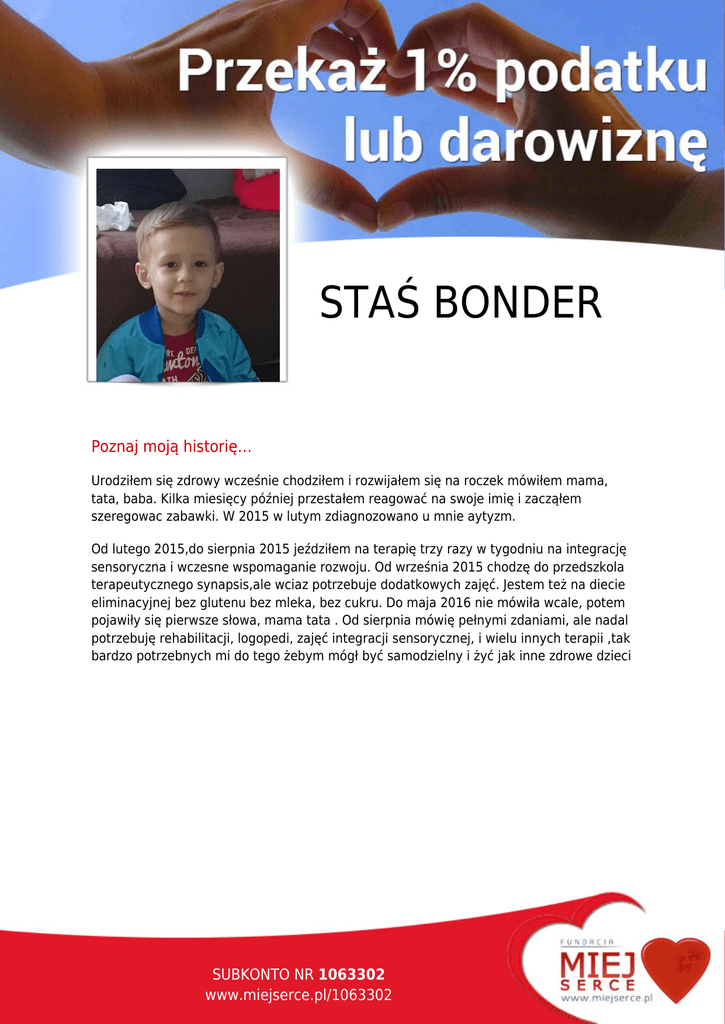 STAŚ BONDER Poznaj moją historię… Urodziłem się zdrowy wcześnie chodziłem i rozwijałem się na roczek mówiłem mama, tata, baba. Kilka miesięcy później przestałem reagować na swoje imię i zacząłem szeregowac zabawki. W 2015 w lutym zdiagnozowano u mnie aytyzm. Od lutego 2015,do sierpnia 2015 jeździłem na terapię trzy razy w tygodniu na integrację sensoryczna i wczesne wspomaganie rozwoju. Od września 2015 chodzę do przedszkola terapeutycznego synapsis,ale wciaz potrzebuje dodatkowych zajęć. Jestem też na diecie eliminacyjnej bez glutenu bez mleka, bez cukru. Do maja 2016 nie mówiła wcale, potem pojawiły się pierwsze słowa, mama tata . Od sierpnia mówię pełnymi zdaniami, ale nadal potrzebuję rehabilitacji, logopedi, zajęć integracji sensorycznej, i wielu innych terapii ,tak bardzo potrzebnych mi do tego żebym mógł być samodzielny i żyć jak inne zdrowe dzieci SUBKONTO NR 1063302 www.miejserce.pl/1063302