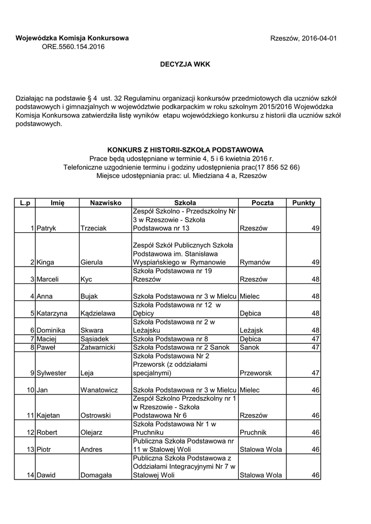 Rzeszów, 2016-04-01 DECYZJA WKK KONKURS Z HISTORII