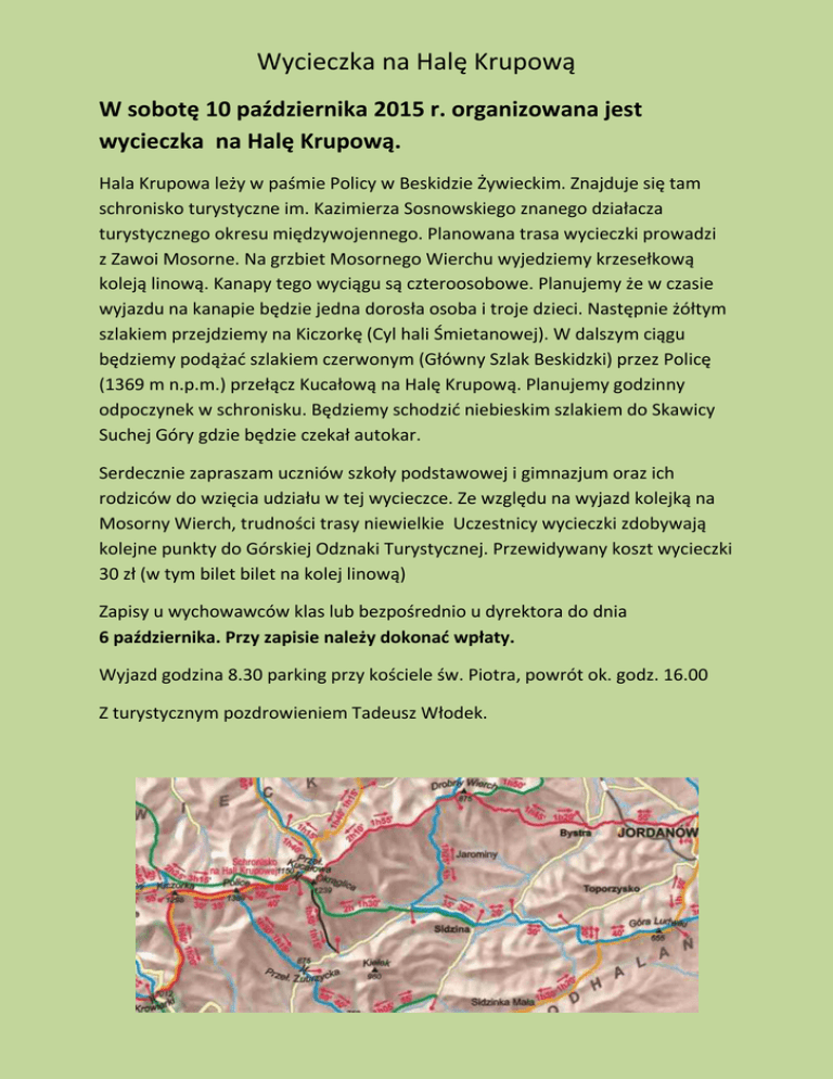 Wycieczka na Halę Krupową W sobotę 10 października 2015 r. organizowana jest wycieczka na Halę Krupową. Hala Krupowa leży w paśmie Policy w Beskidzie Żywieckim. Znajduje się tam schronisko turystyczne im. Kazimierza Sosnowskiego znanego działacza turystycznego okresu międzywojennego. Planowana trasa wycieczki prowadzi z Zawoi Mosorne. Na grzbiet Mosornego Wierchu wyjedziemy krzesełkową koleją linową. Kanapy tego wyciągu są czteroosobowe. Planujemy że w czasie wyjazdu na kanapie będzie jedna dorosła osoba i troje dzieci. Następnie żółtym szlakiem przejdziemy na Kiczorkę (Cyl hali Śmietanowej). W dalszym ciągu będziemy podążać szlakiem czerwonym (Główny Szlak Beskidzki) przez Policę (1369 m n.p.m.) przełącz Kucałową na Halę Krupową. Planujemy godzinny odpoczynek w schronisku. Będziemy schodzić niebieskim szlakiem do Skawicy Suchej Góry gdzie będzie czekał autokar. Serdecznie zapraszam uczniów szkoły podstawowej i gimnazjum oraz ich rodziców do wzięcia udziału w tej wycieczce. Ze względu na wyjazd kolejką na Mosorny Wierch, trudności trasy niewielkie Uczestnicy wycieczki zdobywają kolejne punkty do Górskiej Odznaki Turystycznej. Przewidywany koszt wycieczki 30 zł (w tym bilet bilet na kolej linową) Zapisy u wychowawców klas lub bezpośrednio u dyrektora do dnia 6 października. Przy zapisie należy dokonać wpłaty. Wyjazd godzina 8.30 parking przy kościele św. Piotra, powrót ok. godz. 16.00 Z turystycznym pozdrowieniem Tadeusz Włodek.