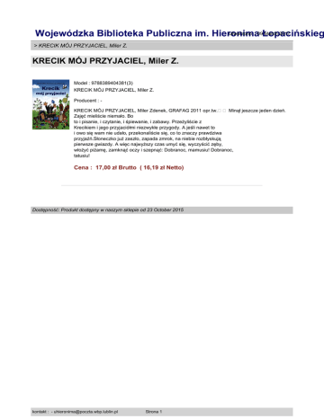 Utworzono : 09Łopacińskieg March 2017 Wojewódzka Biblioteka Publiczna im. Hieronima > KRECIK MÓJ PRZYJACIEL, Miler Z. KRECIK MÓJ PRZYJACIEL, Miler Z. Model : 9788389404381(3) KRECIK MÓJ PRZYJACIEL, Miler Z. Producent : KRECIK MÓJ PRZYJACIEL, Miler Zdenek, GRAFAG 2011 opr.tw.�� Minął jeszcze jeden dzień. Zajęć mieliście niemało. Bo to i pisanie, i czytanie, i śpiewanie, i zabawy. Przeżyliście z Krecikiem i jego przyjaciółmi niezwykłe przygody. A jeśli nawet to i owo się wam nie udało, przekonaliście się, co to znaczy prawdziwa przyjaźń.Słoneczko już zaszło, zapada zmrok, na niebie rozbłyskują pierwsze gwiazdy. A więc najwyższy czas umyć się, wyczyścić zęby, włożyć piżamę, zamknąć oczy i szepnąć: Dobranoc, mamusiu! Dobranoc, tatusiu! Cena : 17,00 zł Brutto ( 16,19 zł Netto) Dostępność: Produkt dostępny w naszym sklepie od 23 October 2015 kontakt : - [email protected] Strona 1