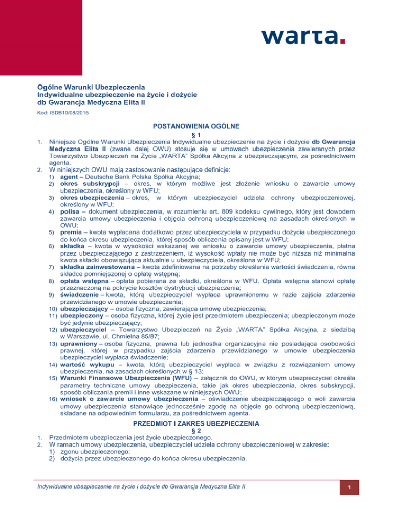 Ogólne Warunki Ubezpieczenia Indywidualne ubezpieczenie na życie i dożycie db Gwarancja Medyczna Elita II Kod: ISDB10/08/2015 POSTANOWIENIA OGÓLNE §1 1. Niniejsze Ogólne Warunki Ubezpieczenia Indywidualne ubezpieczenie na życie i dożycie db Gwarancja Medyczna Elita II (zwane dalej OWU) stosuje się w umowach ubezpieczenia zawieranych przez Towarzystwo Ubezpieczeń na Życie „WARTA” Spółka Akcyjna z ubezpieczającymi, za pośrednictwem agenta. 2. W niniejszych OWU mają zastosowanie następujące definicje: 1) agent – Deutsche Bank Polska Spółka Akcyjna; 2) okres subskrypcji – okres, w którym możliwe jest złożenie wniosku o zawarcie umowy ubezpieczenia, określony w WFU; 3) okres ubezpieczenia – okres, w którym ubezpieczyciel udziela ochrony ubezpieczeniowej, określony w WFU; 4) polisa – dokument ubezpieczenia, w rozumieniu art. 809 kodeksu cywilnego, który jest dowodem zawarcia umowy ubezpieczenia i objęcia ochroną ubezpieczeniową na zasadach określonych w OWU; 5) premia – kwota wypłacana dodatkowo przez ubezpieczyciela w przypadku dożycia ubezpieczonego do końca okresu ubezpieczenia, której sposób obliczenia opisany jest w WFU; 6) składka – kwota w wysokości wskazanej we wniosku o zawarcie umowy ubezpieczenia, płatna przez ubezpieczającego z zastrzeżeniem, iż wysokość wpłaty nie może być niższa niż minimalna kwota składki obowiązująca aktualnie u ubezpieczyciela, określona w WFU; 7) składka zainwestowana – kwota zdefiniowana na potrzeby określenia wartości świadczenia, równa składce pomniejszonej o opłatę wstępną; 8) opłata wstępna – opłata pobierana ze składki, określona w WFU. Opłata wstępna stanowi opłatę przeznaczoną na pokrycie kosztów dystrybucji ubezpieczenia; 9) świadczenie – kwota, którą ubezpieczyciel wypłaca uprawnionemu w razie zajścia zdarzenia przewidzianego w umowie ubezpieczenia; 10) ubezpieczający – osoba fizyczna, zawierająca umowę ubezpieczenia; 11) ubezpieczony – osoba fizyczna, której życie jest przedmiotem ubezpieczenia; ubezpieczonym może być jedynie ubezpieczający; 12) ubezpieczyciel – Towarzystwo Ubezpieczeń na Życie „WARTA” Spółka Akcyjna, z siedzibą w Warszawie, ul. Chmielna 85/87; 13) uprawniony – osoba fizyczna, prawna lub jednostka organizacyjna nie posiadająca osobowości prawnej, której w przypadku zajścia zdarzenia przewidzianego w umowie ubezpieczenia ubezpieczyciel wypłaca świadczenie; 14) wartość wykupu – kwota, którą ubezpieczyciel wypłaca w związku z rozwiązaniem umowy ubezpieczenia, na zasadach określonych w § 13; 15) Warunki Finansowe Ubezpieczenia (WFU) – załącznik do OWU, w którym ubezpieczyciel określa parametry techniczne umowy ubezpieczenia, takie jak okres ubezpieczenia, okres subskrypcji, sposób obliczania premii i inne wskazane w niniejszych OWU; 16) wniosek o zawarcie umowy ubezpieczenia – oświadczenie ubezpieczającego o woli zawarcia umowy ubezpieczenia stanowiące jednocześnie zgodę na objęcie go ochroną ubezpieczeniową, składane na odpowiednim formularzu, za pośrednictwem agenta. PRZEDMIOT I ZAKRES UBEZPIECZENIA §2 1. Przedmiotem ubezpieczenia jest życie ubezpieczonego. 2. W ramach umowy ubezpieczenia, ubezpieczyciel udziela ochrony ubezpieczeniowej w zakresie: 1) zgonu ubezpieczonego; 2) dożycia przez ubezpieczonego do końca okresu ubezpieczenia. Indywidualne ubezpieczenie na życie i dożycie db Gwarancja Medyczna Elita II 1 1. 2. 3. 4. 5. 6. 7. 8. 9. 10. 1. 2. 3. 4. ZAWARCIE UMOWY UBEZPIECZENIA §3 Umowa ubezpieczenia zawierana jest na okres, wskazany w WFU jako okres ubezpieczenia. Ubezpieczeniem może być objęta osoba, która w dniu rozpoczęcia okresu ubezpieczenia ukończyła 18 lat. Umowa ubezpieczenia jest zawarta po spełnieniu łącznie poniższych warunków: 1) podpisanie wniosku przez ubezpieczającego i doręczenie go ubezpieczycielowi za pośrednictwem agenta; 2) wpłata składki; 3) zaakceptowanie wniosku o zawarcie umowy ubezpieczenia przez ubezpieczyciela. Złożenie wniosku możliwe jest tylko w okresie subskrypcji. Możliwe jest złożenie kilku wniosków przez jedną osobę. Zawarcie umowy ubezpieczenia następuje z dniem rozpoczęcia okresu ubezpieczenia, z zastrzeżeniem ust. 8. Potwierdzeniem zawarcia umowy ubezpieczenia jest polisa wystawiana przez ubezpieczyciela w terminie 10 dni roboczych licząc od pierwszego dnia okresu ubezpieczenia i wysyłana ubezpieczającemu. Odpowiedzialność ubezpieczyciela rozpoczyna się w dniu początku okresu ubezpieczenia, wskazanego w WFU, z zastrzeżeniem ust. 8. Ubezpieczyciel ma prawo odwołać subskrypcję, do ostatniego dnia trwania okresu subskrypcji włącznie oraz ma prawo zdecydować o nie rozpoczęciu okresu ubezpieczenia do dnia poprzedzającego dzień początku okresu ubezpieczenia włącznie. W przypadku odwołania okresu subskrypcji i decyzji o nie rozpoczęciu okresu ubezpieczenia, ubezpieczyciel informuje ubezpieczającego o swojej decyzji, umowa ubezpieczenia nie zostaje zawarta, okres ubezpieczenia nie rozpoczyna się, a składka wpłacona przez ubezpieczającego jest zwracana na rachunek bankowy wskazany we wniosku o zawarcie umowy ubezpieczenia. Przed rozpoczęciem okresu ubezpieczenia ubezpieczający może zrezygnować z zawarcia umowy ubezpieczenia składając u agenta formularz rezygnacji z zawarcia umowy ubezpieczenia/wniosku o zwrot wpłaty. W takim przypadku składka wpłacona przez ubezpieczającego jest zwracana na rachunek wskazany we wniosku o zawarcie umowy ubezpieczenia, w terminie do 6 dni roboczych od dnia złożenia ww. formularza. ROZWIĄZANIE UMOWY UBEZPIECZENIA §4 Ubezpieczający może odstąpić od umowy ubezpieczenia w ciągu 30 dni od daty zawarcia umowy ubezpieczenia. Ubezpieczający może złożyć oświadczenie o odstąpieniu poprzez złożenie wniosku o wykup ubezpieczenia, zgodnie z trybem przewidzianym w § 13, z zastrzeżeniem ust. 4. Ubezpieczający może wypowiedzieć um