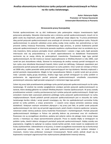 Analiza ekonomiczno-techniczna rynku pożyczek społecznościowych w Polsce na tle rynku światowego. Autor: Katarzyna Gajda Promotor: dr Tomasz Kaczmarek Uniwersytet Ekonomiczny w Poznaniu Streszczenie pracy licencjackiej Portale społecznościowe nie są dziś traktowane jako potencjalne miejsce inwestowania bądź pożyczania pieniędzy. Niewielu internautów wie o istnieniu portali społecznościowych, innych niż te gdzie szuka się znajomych, poznaje nowych ludzi, publikuje swoje zdjęcia itp. Ta praca przedstawia ideę portali pożyczek społecznościowych oraz analizuje ich istnienie na potencjalnym rynku. Pożyczki społecznościowe to pożyczki udzielane przez jedną osobę innej osobie, bez pośrednictwa w tym procesie żadnej instytucji finansowej. Implementacja tego procesu, w postaci budowania portali pożyczek społecznościowych w Internecie pozwala zwykłemu użytkownikowi sieci na wcielenie się w rolę inwestora, który pożycza pieniądze innym użytkownikom i czerpie z tego zyski, bądź pozwala internaucie stać się pożyczkobiorcą i w chwili zapotrzebowania na dodatkowe finansowanie zwrócenie się ze swoją ofertą do potencjalnych inwestorów. Powstawanie tego typu portali społecznościowych, bo tak można je nazwać zapoczątkowano w Wielkiej Brytanii w roku 2005, czyli rynek ten jest stosunkowo młody. Stanowi to motywację do analizy rozwoju portali istniejących na tym rynku oraz określenie kluczowych kwestii, które rynek ten definiują. Ciekawym zjawiskiem jest powstawanie portali pożyczek społecznościowych na rynku polskim. Choć rynek ten istnieje w Polsce od 2008 roku, szybko powstało wiele portali reprezentujących ten typ działania. Niestety większość z portali poniosła niepowodzenie. Mogło to być spowodowane faktem, iż polski rynek jest po prostu mały i posiada wąską grupę docelową. Analiza tego typu portali istniejących na rynku polskim w porównaniu do zagranicznych portali pożyczek społecznościowych umożliwiła zrozumienie poniesionych sukcesów, bądź porażek związanych z istnieniem tego typu portali. Celem tej pracy było przedstawienie polskiego rynku portali pożyczek społecznościowych na tle rynku światowego. W analizie tej zostały uwzględnione wiodące portale pożyczek społecznościowych na świecie, które działają głównie na rynkach Wielkiej Brytanii i Stanów Zjednoczonych. W pracy zostały przedstawione wnioski z analizy porównawczej tych rynków pożyczek społecznościowych. Dzięki tym wnioskom można było usytuować położenie polskiego rynku pożyczek społecznościowych na rynku międzynarodowym. Rynek polskich portali pożyczek społecznościowych jest w stosunku do rynku światowego bardzo młody i wciąż powoli rozwijający się. Nie ma spektakularnych wzrostów liczby portali na rynku polskim, a wręcz przeciwnie - z czasem coraz więcej serwisów zawiesza swoją działalność. Kolejnym ważnym wnioskiem płynącym z tej pracy jest fakt, że polski rynek pożyczek społecznościowych nie różni się od portali zagranicznych, jeżeli chodzi o kryteria społeczne i prawne, natomiast widać różnicę podczas oceny kryteriów finansowych i marketingowych. Portale pożyczek społecznościowych działające w Polsce nie potrafią dobrze się promować oraz ich możliwości finansowe nie są szczegółowo określone, podany jest jedynie zakres do jakiego może rosnąć stopa zwrotu z inwestycji czy stopa oprocentowania pożyczki. Praca ta wytyka błędy w istniejących na polskim rynku, dwóch dobrze rokujących portalach pożyczek społecznościowych. Gdyby zostały one poprawione, mogłoby to wpłynąć na szybszy rozwój tychże portali, może nawet na zwiększenie ich liczby użytkowników. Udowodniono w tej pracy, iż nawet szczegółowe wzorowanie się na konkurencji nie gwarantuje sukcesu. Jako, że rynek pożyczek społecznościowych jest rynkiem młodym i niszowym, można tutaj próbować rozwiązań innowacyjnych. Rynek polski, jednak skupił się na kopiowaniu rozwiązań zagranicznych bez wykorzystania jakiejkolwiek inwencji własnej.