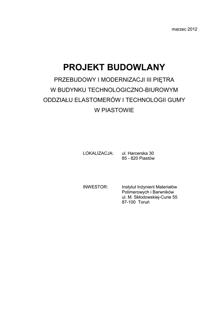 marzec 2012 PROJEKT BUDOWLANY PRZEBUDOWY I MODERNIZACJI III PIĘTRA W BUDYNKU TECHNOLOGICZNO-BIUROWYM ODDZIAŁU ELASTOMERÓW I TECHNOLOGII GUMY W PIASTOWIE LOKALIZACJA: ul. Harcerska 30 85 - 820 Piastów INWESTOR: Instytut InŜynierii Materiałów Polimerowych i Barwników ul. M. Skłodowskiej-Curie 55 87-100 Toruń PROJEKT ZAWIERA : OPIS TECHNICZNY INFORMACJA BIOZ CZĘŚĆ GRAFICZNA Rzut III piętra - inwentaryzacja Rys. Nr 1 Rzut III piętra - projekt Rys. Nr 2 Układ sufitów podwieszanych III piętra Rys. Nr 3 Przekrój pionowy Rys. Nr 4 Rzut łącznika Rys. Nr 5 Zestawienie stolarki Rys. Nr 6 Rzut III p. - instalacja wod.-kan. i C.O. Rys. Nr 7 Rozwinięcie instalacji wodociągowej III p. Rys. Nr 8 Oświadczenie i ksera uprawnień 2 OPIS TECHNICZNY I. Dane ogólne 1. Podstawa opracowania - ustalenia programowo-funkcjonalne z właścicielem obiektu - inwentaryzacja - umowa z inwestorem 2. Przedmiot opracowania Opracowanie obejmuje projekt przebudowy i modernizacji III piętra istniejącego budynku technologiczno-biurowego oraz łącznika, bez ingerencji w konstrukcję i bez zmiany gabarytów budynku. Realizacja zadania będzie przebiegała w dwóch etapach. Etap pierwszy – obejmuje przebudowę i remont kapitalny sanitariatów na III p, remont korytarza nr 330 oraz przebudowę i remont pomieszczeń biurowych o numerach 301 – 310 oraz 317 – 329 (od osi 20 do osi 27 oraz klatka schodowa i pomieszczenie nr 317) Etap drugi obejmował będzie remont pozostałych pomieszczeń nr : 311-316 3. Podstawowe dane Budynek czterokondygnacyjny wykonany w technologii szkieletu Ŝelbetowego. Głównym elementem konstrukcyjnym są ramy Ŝelbetowe. 4. Zestawienie powierzchni Powierzchnia netto III piętra (cała kondygnacja) - 653,9 m2 Etap 1 – powierzchnia netto 551,5 m2 • pomieszczenia biurowe 400,4 m2 • korytarz i sanitariaty 151,1 m2 Etap 2 – powierzchnia netto 102,4 m2 • pomieszczenia biurowe 89,2 m2 • korytarz 13,2 m2 II. Opis stanu istniejącego i ocena techniczna Fundamenty - ławy Ŝelbetowe. Mury fundamentowe betonowe. Ściany zewnętrzne z bloczków betonu komórkowego gr. 24 cm (bez ocieplenia). Ściany wewnętrzne - konstrukcyjne gr. 12 i 6,5 cm z cegły ceramicznej na zaprawie cementowo-wapiennej. Stropy z płyt kanałowych gr. 24 cm. Stropodach niewentylowany z płyt korytkowych. Pokrycie papą termozgrzewalną. Schody wewnętrzne Ŝelbetowe. 3 Elementy konstrukcyjne budynku nie wykazują spękań, nadmiernych ugięć ani odchyleń od pionu. Posadzki w pomieszczeniach biurowych i korytarzu z płytek PCW, w niektórych pomieszczeniach na płytkach wykładzina dywanowa lub panele. W sanitariatach terakota. Warstwa szlichty cementowej w wielu miejscach mocno spękana (zbyt mała grubość), a w niektórych pomieszczeniach takŜe o bardzo słabej strukturze. Dlatego płytki odklejają się od podłoŜa. Posadzki w bardzo złym stanie technicznym. Posadzki terakotowe i z płytek PCW naleŜy wymienić na nowe. Tynki wewnętrzne cementowo-wapienne w złym stanie. Glazura w sanitariatach zniszczona i bardzo nieestetyczna. Stolarka okienna. Na ścianie szczytowej wschodniej oraz w pomieszczeniu 314 (inwentaryzacja) okna PCW nowe. Pozostałe okna drewniane stare w bardzo złym stanie. Parapety wewnętrzne z blachy stalowej na konstrukcji z kątowników, do której zmocowano osłony grzejnikowe. W części pomieszczeń znajdują się sufity podwieszane modułowe 60x60 lub sufity z płyt gipsowo-kartonowych. Większość z nich wymaga uzupełnień lub reperacji. W wielu pomieszczeniach sufitów brak. Drzwi wewnętrzne drewniane płytowe zniszczone otwierane na korytarz (droga ewakuacyjna). III. Opis stanu projektowanego Roboty budowlane dotyczą tylko pomieszczeń wewnętrznych. Nie przewiduje się Ŝadnych robót dotyczących elementów konstrukcyjnych budynku. 1. Ściany III p Ściany nowe murowane w sanitariatach z bloczków wapienno-piaskowych gr. 8 cm tynkowane tynkiem cementowo-wapiennym kat. III lub cementowym jako podkład pod glazurę. Nowo wstawiane ścianki gipsowo-kartonowe na profilach stalowych 100 mm okładane obustronnie płytami grubości 12,5 mm wypełnione wełną mineralną. Na istniejących ścianach w sanitariatach moŜliwość zastosowania suchych tynków z płyt gipsowo-kartonowych wodoodpornych mocowanych do ścian kotwami rozporowymi. Ściany istniejące i nowe, szpachlowane i trzykrotnie malowane na kolor jasny (uzgodnić z inwestorem) . Ściany w pomieszczeniach sanitarnych wykończone płytkami ceramicznymi w kolorze jasno beŜowym do wysokości ościeŜnic. Rodzaj i kolor płytek uzgodnić z Inwestorem. 2. Sufity Zaprojektowano nowe sufity podwieszone z wypełnieniem płytami z włókien mineralnych 60x60. W bezpośrednim sąsiedztwie okien na korytarzu zastosować skosy zapewniające otwarcie okien. Sufity istniejące do uzupełnienia i reperacji. 4 3. Podłogi W sanitariatach i pomieszczeniu gospodarczym gres matowy, antypoślizgowy o wymiarach minimalnych 30x30 cm w kolorze jasnobeŜowym . W pokojach biurowych wykładzina Gamrat Rekord 42 gr. 2,0 mm a na korytarzu Tarket Optima. Wykładzina na korytarzu i w pokojach wywinięta na ściany na wysokość 10 cm. Cokół i pas szerokości 40 cm wokół ścian pomieszczeń w kolorze ciemniejszym, a środek pomieszczenia w kolorze jaśniejszym. Wymienić uszkodzoną i bardzo słabą szlichtę cementową. Całą powierzchnię wzmocnić zaprawą renowacyjną samopoziomującą gr. 5 mm np. UZIN nc 195 z wtopioną siatką z włókna szklanego o oczkach 1,0x1,0 cm. Kolorystykę i typ wykładzin oraz rodzaj płytek podłogowych uzgodnić z inwestorem 4. Drzwi Drzwi d1 płytowe wyposaŜone w zamek patentowy, klamkę, zamontowane na istniejących ościeŜnicach stalowych, które naleŜy wypełnić pianką poliuretanową, poprawić mocowanie do ściany i pomalować na kolor brązowy. Drzwi d2 i d3 płytowe wyposaŜone w zamek patentowy lub zamek WC, klamkę i otwory nawiewne. OścieŜnice nowe stalowe pomalować na k