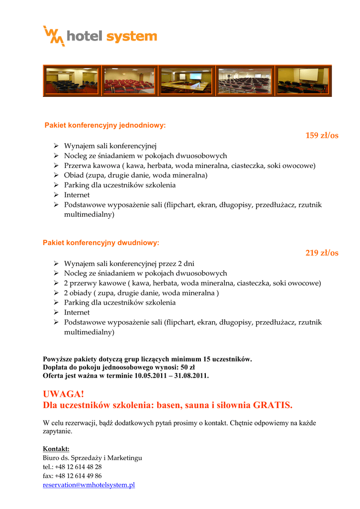 Pakiet konferencyjny jednodniowy: 159 zł/os Wynajem sali konferencyjnej Nocleg ze śniadaniem w pokojach dwuosobowych Przerwa kawowa ( kawa, herbata, woda mineralna, ciasteczka, soki owocowe) Obiad (zupa, drugie danie, woda mineralna) Parking dla uczestników szkolenia Internet Podstawowe wyposażenie sali (flipchart, ekran, długopisy, przedłużacz, rzutnik multimedialny) Pakiet konferencyjny dwudniowy: 219 zł/os Wynajem sali konferencyjnej przez 2 dni Nocleg ze śniadaniem w pokojach dwuosobowych 2 przerwy kawowe ( kawa, herbata, woda mineralna, ciasteczka, soki owocowe) 2 obiady ( zupa, drugie danie, woda mineralna ) Parking dla uczestników szkolenia Internet Podstawowe wyposażenie sali (flipchart, ekran, długopisy, przedłużacz, rzutnik multimedialny) Powyższe pakiety dotyczą grup liczących minimum 15 uczestników. Dopłata do pokoju jednoosobowego wynosi: 50 zł Oferta jest ważna w terminie 10.05.2011 – 31.08.2011. UWAGA! Dla uczestników szkolenia: basen, sauna i siłownia GRATIS. W celu rezerwacji, bądź dodatkowych pytań prosimy o kontakt. Chętnie odpowiemy na każde zapytanie. Kontakt: Biuro ds. Sprzedaży i Marketingu tel.: +48 12 614 48 28 fax: +48 12 614 49 86 [email protected]