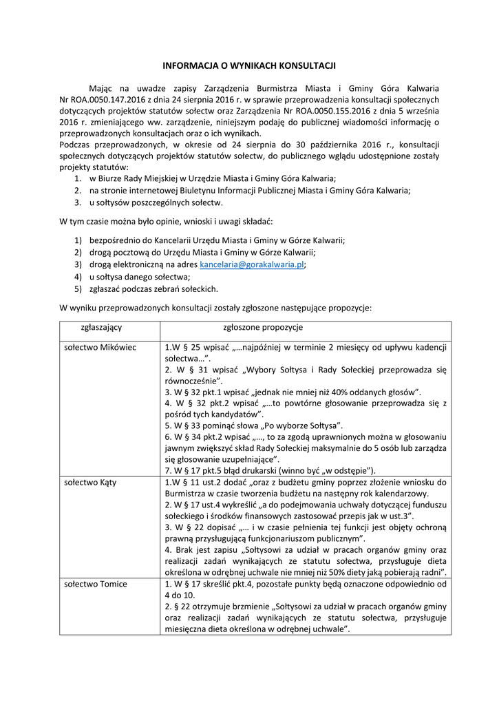 INFORMACJA O WYNIKACH KONSULTACJI Mając na uwadze zapisy Zarządzenia Burmistrza Miasta i Gminy Góra Kalwaria Nr ROA.0050.147.2016 z dnia 24 sierpnia 2016 r. w sprawie przeprowadzenia konsultacji społecznych dotyczących projektów statutów sołectw oraz Zarządzenia Nr ROA.0050.155.2016 z dnia 5 września 2016 r. zmieniającego ww. zarządzenie, niniejszym podaję do publicznej wiadomości informację o przeprowadzonych konsultacjach oraz o ich wynikach. Podczas przeprowadzonych, w okresie od 24 sierpnia do 30 października 2016 r., konsultacji społecznych dotyczących projektów statutów sołectw, do publicznego wglądu udostępnione zostały projekty statutów: 1. w Biurze Rady Miejskiej w Urzędzie Miasta i Gminy Góra Kalwaria; 2. na stronie internetowej Biuletynu Informacji Publicznej Miasta i Gminy Góra Kalwaria; 3. u sołtysów poszczególnych sołectw. W tym czasie można było opinie, wnioski i uwagi składać: 1) 2) 3) 4) 5) bezpośrednio do Kancelarii Urzędu Miasta i Gminy w Górze Kalwarii; drogą pocztową do Urzędu Miasta i Gminy w Górze Kalwarii; drogą elektroniczną na adres [email protected]; u sołtysa danego sołectwa; zgłaszać podczas zebrań sołeckich. W wyniku przeprowadzonych konsultacji zostały zgłoszone następujące propozycje: zgłaszający sołectwo Mikówiec sołectwo Kąty sołectwo Tomice zgłoszone propozycje 1.W § 25 wpisać „…najpóźniej w terminie 2 miesięcy od upływu kadencji sołectwa…”. 2. W § 31 wpisać „Wybory Sołtysa i Rady Sołeckiej przeprowadza się równocześnie”. 3. W § 32 pkt.1 wpisać „jednak nie mniej niż 40% oddanych głosów”. 4. W § 32 pkt.2 wpisać „…to powtórne głosowanie przeprowadza się z pośród tych kandydatów”. 5. W § 33 pominąć słowa „Po wyborze Sołtysa”. 6. W § 34 pkt.2 wpisać „…, to za zgodą uprawnionych można w głosowaniu jawnym zwiększyć skład Rady Sołeckiej maksymalnie do 5 osób lub zarządza się głosowanie uzupełniające”. 7. W § 17 pkt.5 błąd drukarski (winno być „w odstępie”). 1.W § 11 ust.2 dodać „oraz z budżetu gminy poprzez złożenie wniosku do Burmistrza w czasie tworzenia budżetu na następny rok kalendarzowy. 2. W § 17 ust.4 wykreślić „a do podejmowania uchwały dotyczącej funduszu sołeckiego i środków finansowych zastosować przepis jak w ust.3”. 3. W § 22 dopisać „… i w czasie pełnienia tej funkcji jest objęty ochroną prawną przysługującą funkcjonariuszom publicznym”. 4. Brak jest zapisu „Sołtysowi za udział w pracach organów gminy oraz realizacji zadań wynikających ze statutu sołectwa, przysługuje dieta określona w odrębnej uchwale nie mniej niż 50% diety jaką pobierają radni”. 1. W § 17 skreślić pkt.4, pozostałe punkty będą oznaczone odpowiednio od 4 do 10. 2. § 22 otrzymuje brzmienie „Sołtysowi za udział w pracach organów gminy oraz realizacji zadań wynikających ze statutu sołectwa, przysługuje miesięczna dieta określona w odrębnej uchwale”. sołectwo Moczydłów sołectwo Podłęcze sołectwo Krzaki Czaplinkowskie sołectwo Wólka Załęska sołectwo Wólka Dworska sołectwo Brzumin sołectwo Cendrowice sołectwo Sierzchów sołectwo Dobiesz 3. Dodać §22a w brzmieniu „Sołtys korzysta z ochrony prawnej przysługującej funkcjonariuszom publicznym”. 1. W § 17 skreślić pkt.4, pozostałe punkty będą oznaczone odpowiednio od 4 do 10. 2. § 22 otrzymuje brzmienie „Sołtysowi za udział w pracach organów gminy oraz realizacji zadań wynikających ze statutu sołectwa, przysługuje miesięczna dieta określona w odrębnej uchwale”. 3.Dodać §22a w brzmieniu „Sołtys korzysta z ochrony prawnej przysługującej funkcjonariuszom publicznym”. 1. Wykreślić z § 17 ust.4. 2. Dodać do § 22 kolejne zdanie o treści „Sołtysowi za udział w pracach organów gminy oraz realizacji zadań wynikających ze statutu sołectwa, przysługuje miesięczna dieta w wysokości określonej w odrębnej uchwale”. 1.Wykreślić z § 17 ust.4. Akceptacja projektu bez uwag. 1.W § 17 ust.4 skreślić „przepisu ust. 3 nie stosuje się do zebrań, w których przedmiotem jest podejmowanie uchwał dotyczących dysponowania środkami finansowymi dotyczącymi funduszu sołeckiego”. 2. § 22 otrzymuje brzmienie: 1) Sołtys pełni swoją funkcję społecznie; 2) Sołtysowi za udział w pracach organów gminy oraz realizacji zadań wynikających ze statutu sołectwa, przysługuje miesięczna dieta określona w odrębnej uchwale; 3) Dodać §22a w brzmieniu „Sołtys korzysta z ochrony prawnej przysługującej funkcjonariuszom publicznym”. 1. W § 17 skreślić pkt.4, pozostałe punkty będą oznaczone odpowiednio od 4 do 10. 2. § 22 otrzymuje brzmienie „Sołtysowi za udział w pracach organów gminy oraz realizacji zadań wynikających ze statutu sołectwa, przysługuje miesięczna dieta określona w odrębnej uchwale”. 3. Dodać §22a w brzmieniu „Sołtys korzysta z ochrony prawnej przysługującej funkcjonariuszom publicznym”. 1.Wpisać do statutu sołectwa Cendrowice działki nr 78 jako dawnego mienia gromadzkiego a dzisiaj tzw. „mienia gminnego” (w stosunku do tej działki trwa proces administracyjny – nadanie KW). 2. Wpisać do statutu sołectwa Cendrowice dawnego mienia gromadzkiego wsi Cendrowice, a obecnie „mienia gminnego”. 3. W § 17 skreślić pkt. 4 4. W § 22 dodać: pkt. „Sołtysowi przysługuje comiesięczna dieta określona w odrębnej ustawie” pkt. ”Sołtys korzysta z ochrony prawnej przysługującej funkcjonariuszom publicznym” Akceptacja projektu bez uwag. 1.W § 8 ust.1 po słowie „przekazać” dodać „bądź nabyć/zakupić”. 2. W § 9 ust.4 po słowie „Urzędzie” dodać „Sołtys co roku uzyskuje informację dotyczącą ewidencji mienia z Gminy w formie elektronicznej na emaila”. 3. W § 11 ust.2 po słowie „sołecki” dodać „bądź na wniosek Sołtysa z innych środków Gminy GK”. 4. W §
