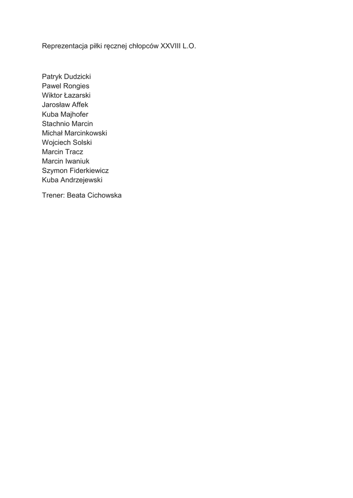 Reprezentacja piłki ręcznej chłopców XXVIII L.O. Patryk Dudzicki Pawel Rongies Wiktor Łazarski Jarosław Affek Kuba Majhofer Stachnio Marcin Michał Marcinkowski Wojciech Solski Marcin Tracz Marcin Iwaniuk Szymon Fiderkiewicz Kuba Andrzejewski Trener: Beata Cichowska