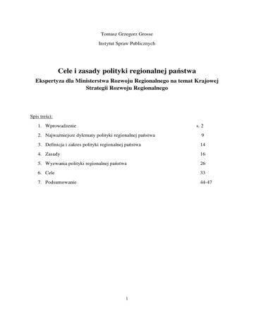 Tomasz Grzegorz Grosse Instytut Spraw Publicznych Cele i zasady polityki regionalnej państwa Ekspertyza dla Ministerstwa Rozwoju Regionalnego na temat Krajowej Strategii Rozwoju Regionalnego Spis treści: 1. Wprowadzenie s. 2 2. Najważniejsze dylematy polityki regionalnej państwa 9 3. Definicja i zakres polityki regionalnej państwa 14 4. Zasady 16 5. Wyzwania polityki regionalnej państwa 26 6. Cele 33 7. Podsumowanie 44-47 1 1. Wprowadzenie W Polsce od wielu lat utrzymują się poważne problemy planowania strategicznego polityk publicznych1. Wśród nich można wymienić: (a) brak myślenia o polityce rozwoju w długiej perspektywie czasu, (b) brak ciągłości prac programowych, w tym częste zmiany podstawowych koncepcji i instrumentów programowych, (c) nadmierna liczba słabo ze sobą powiązanych strategii i dokumentów programowych. (d) Innym problemem jest słabość implementacji dokumentów programowych oraz (e) zdarzające się próby omijania najważniejszych dokumentów strategicznych w praktyce administracyjnej. Wspomniane trudności dotykają także polityki regionalnej. Dla tej polityki zasadnicze znaczenie ma również (f) niewłaściwa koordynacja prac programowych między różnymi segmentami administracji publicznej, co utrudnia m.in. powiązanie polityk sektorowych z politykami regionalnymi, a także działań rządu z zadaniami podejmowanymi przez samorządy terytorialne. Od wielu lat utrzymuje się również (g) dychotomia planowania inwestycyjnego (społeczno-gospodarczego) i przestrzennego. Podstawowym dokumentem strategicznym w zakresie polityki regionalnej w Polsce była w latach 2001-2006 Narodowa Strategia Rozwoju Regionalnego2 (NSRR). Model rozwoju zaproponowany w tej strategii dążył do likwidacji podstawowych barier rozwoju (m.in. infrastrukturalnych), wspierał rozwiązywanie problemów obszarów zagrożonych marginalizacją, działania zapewniające spójność kraju, a także poprawiał warunki życia mieszkańców, zwłaszcza w regionach słabiej rozwijających się. Przyczyniał się do rozwoju gospodarczego (m.in. poprzez wsparcie małych i średnich przedsiębiorstw oraz pośrednio – przez rozbudowę podstawowej infrastruktury). Przedstawiał również działania uatrakcyjniające regiony dla zewnętrznych inwestorów. W niewystarczający sposób proponował jednak działania wspierające szanse rozwoju innowacyjnej gospodarki. W ten sposób w niewielkim stopniu realizował cele dotyczące promowania konkurencyjności gospodarczej w regionach związane ze strategią lizbońską3. Można jedynie wspomnieć, że Por. T. G. Grosse (2001): Wpływ procesów globalnych i integracji europejskiej na polski system polityki regionalnej, Studia Regionalne i Lokalne nr 1 (5); T. G. Grosse (1999): Polityka regionalna państwa, Gazeta Samorządowa, nr 6; Model planowania strategicznego w Polsce, Ministerstwo Rozwoju Regionalnego, Warszawa 2008, s. 6-9; T. G. Grosse (2007): Narodowa Strategia Rozwoju Regionalnego i kontrakty wojewódzkie: czy są jeszcze potrzebne? Samorząd Terytorialny, nr 12, s. 7-19. 2 Na podstawie Uchwały Rady Ministrów Nr 105 z dnia 28 grudnia 2000 roku w sprawie przyjęcia Narodowej Strategii Rozwoju Regionalnego 2001-2006 (Monitor Polski 2000, nr 43, poz. 851). 3 Strategia lizbońska została przyjęta podczas szczytu Unii Europejskiej pod koniec marca 2000 roku. Została ukierunkowana na realizowanie celów rozwoju 1 2 szereg innych krajów korzystających z polityki spójności w latach 2000-2006 także w niewielkim stopniu realizowało wspomniane cele lizbońskie. Częściowa zmiana stanowiska wielu krajów w tym względzie, jak również nastawienia samej Unii Europejskiej do polityki spójności - nastąpiła dopiero po roku 2006. Jak wcześniej wspomniałem, problemem wielu dokumentów strategicznych polityki regionalnej - zarówno rządowych, jak również samorządowych - jest to, że wprawdzie deklaratywnie obejmują działania wspierające rozwój nowoczesnej gospodarki, ale są one bardzo słabo realizowane w praktyce. Niektóre dokumenty programowe, w tym również NSRR, ujmują więc działania wspierające innowacje organizacyjne i technologiczne, prowadzenie prac badawczo-rozwojowych przez przedsiębiorstwa, tworzenie regionalnych centrów innowacyjnej przedsiębiorczości, a także rozwijanie infrastruktury zapewniającej komercjalizację innowacji (transfer wiedzy z instytucji badawczych do przedsiębiorstw). Wspierają rozwój instrumentów finansowych pozwalających na wprowadzanie inwestycji technologicznych. Jednak w dużej części, jak pokazuje praktyka, wspomniane zapisy pozostają jedynie w sferze deklaratywnej lub są realizowane w marginalny sposób. Dlatego też, polityka regionalna w Polsce w latach 2001-2006 realizowała model wyrównywania poziomu rozwoju i osiągania spójności zwłaszcza w sferze społecznej i terytorialnej między poszczególnymi województwami. Natomiast znacznie słabiej wywiązywała się z deklarowanej w NSRR chęci długofalowego rozwoju konkurencyjnej gospodarki w polskich regionach. Działania kontraktów wojewódzkich (i poszczególnych Programów wsparcia) były formalnie zgodne z celami Narodowej Strategii Rozwoju Regionalnego. Kontrakty realizowały jednak inwestycje w niewielkim stopniu przyczyniające się do budowania konkurencyjnej i innowacyjnej gospodarki w województwach. Realizowały głównie inwestycje lokalne i komunalne, często inwestycje w służbie zdrowia, oświacie lub mające znacznie socjalne. Ponadto, zostały rozproszone na zbyt wiele działań, co przy stosunkowo małych środkach finansowych ograniczało możliwości pobudzania rozwoju regionalnego. Kontrakty w zasadzie nie miały ukierunkowania przestrzennego dostosowanego do uwarunkowań regionalnych. Oznacza to, że nie zawierały zróżnicowanych priorytetów merytorycznych lub gospodarczego, zwłaszcza związanego z poprawą konkurencyjności, dalszą liberalizacją niektórych segmentów 