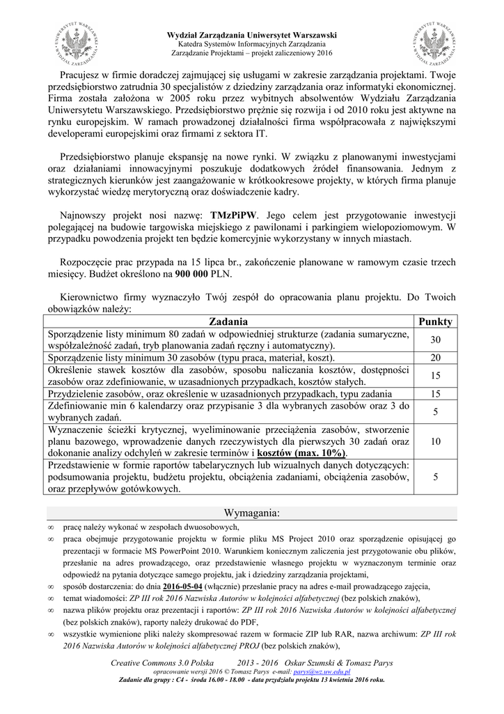 Wydział Zarządzania Uniwersytet Warszawski Katedra Systemów Informacyjnych Zarządzania Zarządzanie Projektami – projekt zaliczeniowy 2016 Pracujesz w firmie doradczej zajmującej się usługami w zakresie zarządzania projektami. Twoje przedsiębiorstwo zatrudnia 30 specjalistów z dziedziny zarządzania oraz informatyki ekonomicznej. Firma została założona w 2005 roku przez wybitnych absolwentów Wydziału Zarządzania Uniwersytetu Warszawskiego. Przedsiębiorstwo prężnie się rozwija i od 2010 roku jest aktywne na rynku europejskim. W ramach prowadzonej działalności firma współpracowała z największymi developerami europejskimi oraz firmami z sektora IT. Przedsiębiorstwo planuje ekspansję na nowe rynki. W związku z planowanymi inwestycjami oraz działaniami innowacyjnymi poszukuje dodatkowych źródeł finansowania. Jednym z strategicznych kierunków jest zaangażowanie w krótkookresowe projekty, w których firma planuje wykorzystać wiedzę merytoryczną oraz doświadczenie kadry. Najnowszy projekt nosi nazwę: TMzPiPW. Jego celem jest przygotowanie inwestycji polegającej na budowie targowiska miejskiego z pawilonami i parkingiem wielopoziomowym. W przypadku powodzenia projekt ten będzie komercyjnie wykorzystany w innych miastach. Rozpoczęcie prac przypada na 15 lipca br., zakończenie planowane w ramowym czasie trzech miesięcy. Budżet określono na 900 000 PLN. Kierownictwo firmy wyznaczyło Twój zespół do opracowania planu projektu. Do Twoich obowiązków należy: Zadania Sporządzenie listy minimum 80 zadań w odpowiedniej strukturze (zadania sumaryczne, współzależność zadań, tryb planowania zadań ręczny i automatyczny). Sporządzenie listy minimum 30 zasobów (typu praca, materiał, koszt). Określenie stawek kosztów dla zasobów, sposobu naliczania kosztów, dostępności zasobów oraz zdefiniowanie, w uzasadnionych przypadkach, kosztów stałych. Przydzielenie zasobów, oraz określenie w uzasadnionych przypadkach, typu zadania Zdefiniowanie min 6 kalendarzy oraz przypisanie 3 dla wybranych zasobów oraz 3 do wybranych zadań. Wyznaczenie ścieżki krytycznej, wyeliminowanie przeciążenia zasobów, stworzenie planu bazowego, wprowadzenie danych rzeczywistych dla pierwszych 30 zadań oraz dokonanie analizy odchyleń w zakresie terminów i kosztów (max. 10%). Przedstawienie w formie raportów tabelarycznych lub wizualnych danych dotyczących: podsumowania projektu, budżetu projektu, obciążenia zadaniami, obciążenia zasobów, oraz przepływów gotówkowych. Punkty 30 20 15 15 5 10 5 Wymagania: • • • • • • pracę należy wykonać w zespołach dwuosobowych, praca obejmuje przygotowanie projektu w formie pliku MS Project 2010 oraz sporządzenie opisującej go prezentacji w formacie MS PowerPoint 2010. Warunkiem koniecznym zaliczenia jest przygotowanie obu plików, przesłanie na adres prowadzącego, oraz przedstawienie własnego projektu w wyznaczonym terminie oraz odpowiedź na pytania dotyczące samego projektu, jak i dziedziny zarządzania projektami, sposób dostarczenia: do dnia 2016-05-04 (włącznie) przesłanie pracy na adres e-mail prowadzącego zajęcia, temat wiadomości: ZP III rok 2016 Nazwiska Autorów w kolejności alfabetycznej (bez polskich znaków), nazwa plików projektu oraz prezentacji i raportów: ZP III rok 2016 Nazwiska Autorów w kolejności alfabetycznej (bez polskich znaków), raporty należy drukować do PDF, wszystkie wymienione pliki należy skompresować razem w formacie ZIP lub RAR, nazwa archiwum: ZP III rok 2016 Nazwiska Autorów w kolejności alfabetycznej PROJ (bez polskich znaków), Creative Commons 3.0 Polska 2013 - 2016 Oskar Szumski & Tomasz Parys opracowanie wersji 2016 © Tomasz Parys e-mail: [email protected] Zadanie dla grupy : C4 - środa 16.00 - 18.00 - data przydziału projektu 13 kwietnia 2016 roku.