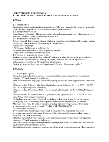 SPECYFIKACJA TECHNICZNA KONSTRUKCJE BETONOWE KOD CPV: 45262210-6; 45262311-4 1. Wstęp 1.1. Przedmiot ST Przedmiotem niniejszej specyfikacji technicznej (ST) są wymagania dotyczące wykonania i odbioru robót związanych z wykonaniem konstrukcji betonowych. 1.2. Zakres stosowania ST Specyfikacja techniczna (ST) jest stosowana jako dokument przetargowy i kontraktowy przy zlecaniu i realizacji robót wymienionych w pkt.1.3. 1.3. Zakres robót objętych ST Roboty, których dotyczy specyfikacja obejmują wszystkie czynności umożliwiające i mające na celu wykonanie konstrukcji betonowych i żelbetowych. Zakres robót obejmuje: - Wykonanie fundamentów wylewanych - Montaż prefabrykowanych stropów gęstożebrowych - Wykonanie elementów konstrukcyjnych 1.4. Ogólne wymagania dotyczące robót Wykonawca jest odpowiedzialny za jakość wykonania robót, bezpieczeństwo wszelkich czynności na terenie budowy, metody użyte przy budowie oraz za ich zgodność z dokumentacją projektową, ST i poleceniami Inżyniera. Ogólne wymagania dotyczące robót podano w ST część „Wymagania ogólne". 2. Materiały 2.1. Wymagania ogólne Wszystkie materiały stosowane do wykonania robót muszą być zgodne z wymaganiami niniejszej ST i dokumentacji projektowej. Do wykonania robót mogą być stosowane wyroby budowlane spełniające warunki określone w: - Ustawie z dnia 7 lipca 1994 r. Prawo budowlane (tekst jednolity: Dz. U. z 2003 r., Nr 207, poz. 2016; z późniejszymi zmianami), - Ustawie z dnia 16 kwietnia 2004 r. o wyrobach budowlanych (Dz. U. z 2004 r, Nr 92, poz. 881), - Ustawie z dnia 30 sierpnia 2002 r. o systemie oceny zgodności (Dz. U. z 2002r. Nr 166, poz.1360, z późniejszymi zmianami). Na Wykonawcy spoczywa obowiązek posiadania dokumentacji wyrobu budowlanego wymaganej przez w/w ustawy lub rozporządzenia wydane na podstawie tych ustaw. Materiały stosowane do wykonywania konstrukcji betonowych powinny odpowiadać wymaganiom zawartym w normach: PN-B-03264, PN-88/B-06250 2.2. Mieszanka betonowa Do wykonywania konstrukcji betonowych można stosować mieszankę betonową wykonywaną samodzielnie przez Wykonawcę lub mieszankę betonową wykonywaną w wytwórni tzw. „beton towarowy". Składniki mieszanki betonowej jak i sama mieszanka muszą być zgodne z wymaganiami niniejszej ST i dokumentacji projektowej. Mieszanka betonowa powinna odpowiadać wymaganiom norm: PN-B-03264/2002, PN-88/06250 oraz warunków technicznych. Produkcja mieszanki betonowej powinna się odbywać na podstawie receptury laboratoryjnej opracowanej przez Wykonawcę lub na jego zlecenie i zatwierdzonej przez Inżyniera. Wykonawca musi posiadać własne laboratorium lub też za zgodą Inżyniera, zleci nadzór laboratoryjny niezależnemu laboratorium. Wszystkie elementy prefabrykowane dostarczane na budowę powinny być trwale oznakowane. Poszczególne partie elementów tego samego typu powinny posiadać świadectwo jakości (atest). Elementy prefabrykowane powinny spełniać wymogi PN. Tolerancje wymiarowe elementów: - dla grubości 2 mm - dla szerokości i wysokości 2 mm - dla długości 2 mm Prefabrykaty gotowe do wbudowania muszą uzyskać projektowaną wytrzymałość i posiadać atest wytwórni. 3. Sprzęt Roboty związane z wykonaniem konstrukcji betonowych i żelbetowych mogą być wykonywane ręcznie lub mechanicznie przy użyciu dowolnego sprzętu przeznaczonego do wykonywania zamierzonych robót. Sprzęt wykorzystywany przez Wykonawcę powinien być sprawny technicznie i spełniać wymagania techniczne w zakresie BHP. Ogólne wymagania dotyczące sprzętu podano w ST część „Wymagania ogólne". 4. Transport Środki transportu wykorzystywane przez Wykonawcę powinny być sprawne technicznie i spełniać wymagania techniczne w zakresie BHP oraz przepisów o ruchu drogowym. Ogólne wymagania dotyczące transportu podano w ST część „Wymagania ogólne". 4.1.Transport, podawanie i układanie mieszanki betonowej Mieszanki betonowe mogą być transportowane mieszalnikami samochodowymi. Ilość samochodów należy dobrać tak, aby zapewnić wymaganą szybkość betonowania z uwzględnieniem odległości dowozu, czasu twardnienia betonu oraz koniecznej rezerwy w przypadku awarii samochodu. W czasie transportu w mieszance nie może nastąpić: segregacja, zmiana konsystencji i składu. Czas transportu i wbudowania mieszanki betonowej nie powinien być dłuższy od wartości podanych w normie . Wszelkie zanieczyszczenia dróg publicznych Wykonawca będzie usuwał na bieżąco i na własny koszt. 5. Wykonanie robót 5.1. Wymagania ogólne Ogólne wymagania dotyczące wykonania robót podano w ST część „Wymagania ogólne". Wykonanie robót powinno być zgodne normami PN-B-03264/2002,PN-88/-06250 lub PN63/B-06251 oraz warunkami technicznymi. 5.2. Zakres wykonania robót Roboty związane z wykonaniem elementów konstrukcyjnych należy prowadzić zgodnie z opracowaną przez Wykonawcę i zaakceptowaną przez Inżyniera „Dokumentacją technologiczną". Betonowanie można rozpocząć po uzyskaniu zezwolenia Inżyniera, potwierdzonego wpisem do Dziennika wykonania i obmiaru robót. 5.3. Wbudowanie mieszanki betonowej 5.3.1. Podawanie i układanie mieszanki betonowej Roboty związane z podawaniem i układaniem mieszanki betonowej powinny być wykonywane zgodnie z wymaganiami normy PN-S-10040:1999. Przed przystąpieniem do układania betonu należy sprawdzić: położenie zbrojenia, zgodność rzędnych z projektem. 5.3.2. Zagęszczenie betonu Roboty związane z zagęszczaniem betonu powinny być wykonywane zgodnie z wymaganiami norm. 5.3.3. Warunki atmosferyczne przy układaniu mieszanki betonowej i wiązaniu betonu 5.3.31. Temperatura otoczenia Betonowanie należy wykonywać wyłącznie w temperaturach nie niższych niż +5°C, zachowując warunki umożliwiające uzyskanie przez beton wytrzymałości co najmniej 15 MPa przed pierwszym zamarznięciem. W wyjątkowych przypadkach dopuszcza się betonowanie w