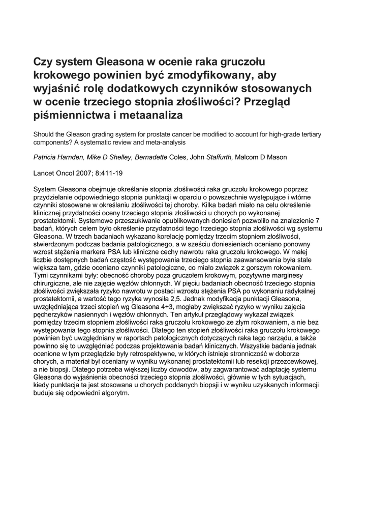 Czy system Gleasona w ocenie raka gruczołu krokowego powinien być zmodyfikowany, aby wyjaśnić rolę dodatkowych czynników stosowanych w ocenie trzeciego stopnia złośliwości? Przegląd piśmiennictwa i metaanaliza Should the Gleason grading system for prostate cancer be modified to account for high-grade tertiary components? A systematic review and meta-analysis Patricia Harnden, Mike D Shelley, Bernadette Coles, John Staffurth, Malcom D Mason Lancet Oncol 2007; 8:411-19 System Gleasona obejmuje określanie stopnia złośliwości raka gruczołu krokowego poprzez przydzielanie odpowiedniego stopnia punktacji w oparciu o powszechnie występujące i wtórne czynniki stosowane w określaniu złośliwości tej choroby. Kilka badań miało na celu określenie klinicznej przydatności oceny trzeciego stopnia złośliwości u chorych po wykonanej prostatektomii. Systemowe przeszukiwanie opublikowanych doniesień pozwoliło na znalezienie 7 badań, których celem było określenie przydatności tego trzeciego stopnia złośliwości wg systemu Gleasona. W trzech badaniach wykazano korelację pomiędzy trzecim stopniem złośliwości, stwierdzonym podczas badania patologicznego, a w sześciu doniesieniach oceniano ponowny wzrost stężenia markera PSA lub kliniczne cechy nawrotu raka gruczołu krokowego. W małej liczbie dostępnych badań częstość występowania trzeciego stopnia zaawansowania była stale większa tam, gdzie oceniano czynniki patologiczne, co miało związek z gorszym rokowaniem. Tymi czynnikami były: obecność choroby poza gruczołem krokowym, pozytywne marginesy chirurgiczne, ale nie zajęcie węzłów chłonnych. W pięciu badaniach obecność trzeciego stopnia złośliwości zwiększała ryzyko nawrotu w postaci wzrostu stężenia PSA po wykonaniu radykalnej prostatektomii, a wartość tego ryzyka wynosiła 2,5. Jednak modyfikacja punktacji Gleasona, uwzględniająca trzeci stopień wg Gleasona 4+3, mogłaby zwiększać ryzyko w wyniku zajęcia pęcherzyków nasiennych i węzłów chłonnych. Ten artykuł przeglądowy wykazał związek pomiędzy trzecim stopniem złośliwości raka gruczołu krokowego ze złym rokowaniem, a nie bez występowania tego stopnia złośliwości. Dlatego ten stopień złośliwości raka gruczołu krokowego powinien być uwzględniany w raportach patologicznych dotyczących raka tego narządu, a także powinno się to uwzględniać podczas projektowania badań klinicznych. Wszystkie badania jednak ocenione w tym przeglądzie były retrospektywne, w których istnieje stronniczość w doborze chorych, a materiał był oceniany w wyniku wykonanej prostatektomii lub resekcji przezcewkowej, a nie biopsji. Dlatego potrzeba większej liczby dowodów, aby zagwarantować adaptację systemu Gleasona do wyjaśnienia obecności trzeciego stopnia złośliwości, głównie w tych sytuacjach, kiedy punktacja ta jest stosowana u chorych poddanych biopsji i w wyniku uzyskanych informacji buduje się odpowiedni algorytm.