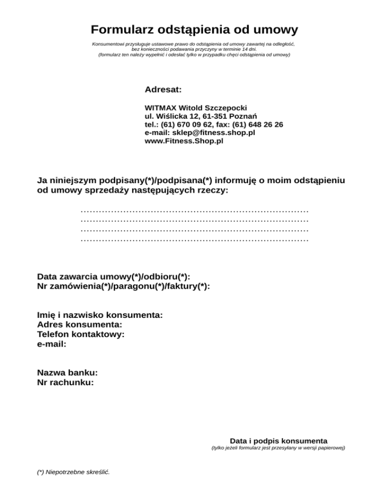 Formularz odstąpienia od umowy Konsumentowi przysługuje ustawowe prawo do odstąpienia od umowy zawartej na odległość, bez konieczności podawania przyczyny w terminie 14 dni. (formularz ten należy wypełnić i odesłać tylko w przypadku chęci odstąpienia od umowy) Adresat: WITMAX Witold Szczepocki ul. Wiślicka 12, 61-351 Poznań tel.: (61) 670 09 62, fax: (61) 648 26 26 e-mail: [email protected] www.Fitness.Shop.pl Ja niniejszym podpisany(*)/podpisana(*) informuję o moim odstąpieniu od umowy sprzedaży następujących rzeczy: ………………………………………………………………… ………………………………………………………………… ………………………………………………………………… ………………………………………………………………… Data zawarcia umowy(*)/odbioru(*): Nr zamówienia(*)/paragonu(*)/faktury(*): Imię i nazwisko konsumenta: Adres konsumenta: Telefon kontaktowy: e-mail: Nazwa banku: Nr rachunku: Data i podpis konsumenta (tylko jeżeli formularz jest przesyłany w wersji papierowej) (*) Niepotrzebne skreślić.