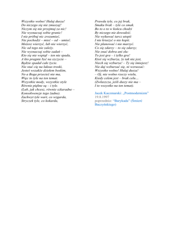 Wszystko wolno! Hulaj dusza! Do niczego się nie zmuszaj! Niczym się nie przejmuj za nic! Nie wyznaczaj sobie granic! I nie próbuj nic zrozumieć, Nie pochodzi – mieć – od – umieć. Możesz wierzyć, lub nie wierzyć, Nic od tego nie zależy. Nie wyznaczaj sobie zadań – Kto się nie wspiął – ten nie spada, A kto pragnie być na szczycie – Będzie spadał całe życie. Nie stać cię na luksus troski, Jesteś wszakże dziełem boskim, No a Boga przecież nie ma, Więc to tyle na ten temat. Wszystkie mody, wszystkie style Równie piękne są – i tyle. (Lub, jak chcesz, równie szkaradne – Konsekwencje tego żadne). Zachwyt tyle wart, co wzgarda, Stryczek tyle, co kokarda, Prawda tyle, co jej brak, Smaku brak – tyle co smak. Bo to o to w końcu chodzi By niczego nie dowodzić. Nie wykuwać tarcz utopii I nie kruszyć o nie kopii. Nie planować i nie marzyć. Co się zdarzy – to się zdarzy; Nie znać dobra ani zła: To jest gra – i tylko gra! Ktoś się wzburza, że tak nie jest, Niech się wzburza! – Ty się śmiejesz! Nie daj wzburzać się, ni wzruszać: Wszystko wolno! Hulaj dusza! – Oj, nie wolno rzeczy wielu, Kiedy celem jest – brak celu… (Zwłaszcza, jeśli duszy nie ma – I to wszystko na ten temat). Jacek Kaczmarski: „Postmodernizm” 19.8.1997 poprzednio: “Barykada” (Śmierć Baczyńskiego)