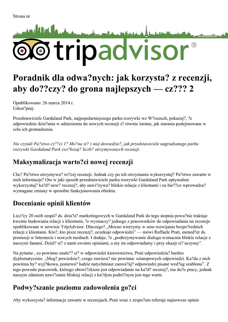 Strona nr Poradnik dla odwa?nych: jak korzysta? z recenzji, aby do??czy? do grona najlepszych — cz??? 2 Opublikowano: 26 marca 2014 r. Udost?pnij: Przedstawiciele Gardaland Park, najpopularniejszego parku rozrywki we W?oszech, pokazuj?, ?e odpowiednie dzia?ania w odniesieniu do nowych recenzji s? równie istotne, jak starania podejmowane w celu ich gromadzenia. Nie czytali Pa?stwo cz??ci 1? Mo?na si? z niej dowiedzie?, jak przedstawiciele nagradzanego parku rozrywki Gardaland Park zwi?kszaj? liczb? otrzymywanych recenzji. Maksymalizacja warto?ci nowej recenzji Chc? Pa?stwo otrzymywa? wi?cej recenzji. Jednak czy po ich otrzymaniu wykorzystuj? Pa?stwo zawarte w nich informacje? Oto w jaki sposób przedstawiciele parku rozrywki Gardaland Park optymalnie wykorzystuj? ka?d? now? recenzj?, aby nawi?zywa? bliskie relacje z klientami i na bie??co wprowadza? wymagane zmiany w sposobie funkcjonowania obiektu. Docenianie opinii klientów Licz?cy 20 osób zespó? ds. dzia?a? marketingowych w Gardaland Park do tego stopnia powa?nie traktuje kwestie budowania relacji z klientami, ?e wyznaczy? jednego z pracowników do odpowiadania na recenzje opublikowane w serwisie TripAdvisor. Dlaczego? „Mocno wierzymy w sens rozwijania bezpo?rednich relacji z klientami. Kto?, kto pisze recenzj?, oczekuje odpowiedzi” — mówi Raffaele Prati, mened?er ds. promocji w Internecie i nowych mediach. I dodaje, ?e „podtrzymywanie dialogu wzmacnia bliskie relacje z naszymi fanami. Dziel? si? z nami swoimi opiniami, a my im odpowiadamy i przy okazji si? uczymy”. Na pytanie , co powinno znale?? si? w odpowiedzi kierownictwa, Prati odpowiedzia? bardzo dyplomatycznie. „Mog? powiedzie?, czego zawiera? nie powinna: sztampowych odpowiedzi. Ka?da z nich powinna by? wyj?tkowa, poniewa? ludzie natychmiast zauwa?aj? odpowiedzi pisane wed?ug szablonu”. Z tego powodu pracownik, którego obowi?zkiem jest odpowiadanie na ka?d? recenzj?, ma du?o pracy, jednak naszym zdaniem nawi?zanie bliskiej relacji z ka?dym podró?nym jest tego warte. Podwy?szanie poziomu zadowolenia go?ci Aby wykorzysta? informacje zawarte w recenzjach, Prati wraz z zespo?em referuje najnowsze opinie pracownikom wszystkich dzia?ów. „Traktujemy to bardzo powa?nie. Chcemy, aby podró?ni wiedzieli, ?e bierzemy pod uwag? ich zdanie i doceniamy je. Raport trafia do wszystkich dzia?ów i na jego podstawie podejmujemy decyzje dotycz?ce kolejnych dzia?a? i akcji marketingowych”. W sezonie przygotowujemy go co tydzie?, poza sezonem — co miesi?c. Raport zwraca uwag? na najcz??ciej opisywane problemy, wymienia nasze mocne strony i zawiera nowe recenzje pogrupowane wed?ug kategorii pozytywne, neutralne i negatywne. Wzmacnianie reputacji Bran?a marketingowa przesz?a ogromne zmiany od czasu, gdy Gardaland Park otworzy? swoje podwoje w 1975 roku. W dzisiejszych czasach to recenzje s? podstawowym ?ród?em informacji dla podró?nych planuj?cych swoje wyjazdy i organizuj?cych swój czas wolny. Dlatego w?a?nie przedstawiciele tej wyró?nionej nagrod? Travellers’ Choice 2013 firmy dok?adaj? stara?, aby wykorzysta? mo?liwo?ci oferowane przez serwis TripAdvisor, nawet w swoich tradycyjnych dzia?aniach marketingowych. Przedstawiciele Gardaland Park przeprowadzili niedawno eksperyment polegaj?cy na zamieszczeniu na swoich ulotkach i mapach informacji o nagrodach serwisu TripAdvisor. Wynik? Prati stwierdza, ?e „zamieszczenie logo nagród serwisu TripAdvisor w naszych materia?ach marketingowych to kolejny, skuteczny sposób na zach?cenie podró?nych do pisania recenzji”. Jego zdaniem dodatkowe recenzje s? wynikiem wspó?pracy parku z serwisem TripAdvisor. W?a?nie dlatego ka?da wzmianka o opinii parku przyczynia si? do wzmocnienia ju? i tak imponuj?cej reputacji tej atrakcji w serwisie TripAdvisor. Teraz Pa?stwa kolej na wykorzystanie wiedzy zawartej w opiniach Zach?camy do odwiedzenia Centrum zarz?dzania, aby odpowiedzie? na naj?wie?sze recenzje i co tydzie? ?ledzi? wyniki swoich dzia?a? w serwisie TripAdvisor — i to wszystko bezp?atnie. Nawet je?li nie maj? Pa?stwo licz?cego 20 osób zespo?u ds. marketingu ani ba?niowej atmosfery, wystarczy raz w tygodniu po?wi?ci? troch? czasu na dzia?ania promocyjne w serwisie TripAdvisor, aby uzyska? magiczne rezultaty. Informacje o stronie TripAdvisor TripAdvisor® to najwi?ksza na ?wiecie strona turystyczna**, która pozwala podró?nym w pe?ni wykorzysta? ka?d? podró?. Mo?na na niej znale?? sprawdzone porady milionów podró?nych, szeroki wachlarz us?ug u?atwiaj?cych planowanie wyjazdu, a tak?e zintegrowane narz?dzia pozwalaj?ce dokonywa? rezerwacji i przeszukiwa? setki witryn w celu znalezienia najlepszych cen obowi?zuj?cych w hotelach. Witryny wspó?pracuj?ce ze stron? TripAdvisor tworz? najwi?ksz? spo?eczno?? podró?nych na ?wiecie. S? one odwiedzane ?rednio 390 milionów razy miesi?cznie* i mo?na na nich znale?? 435 milionów recenzji oraz opinii na temat 6,8 miliona obiektów zakwaterowania, restauracji i atrakcji. Nasze witryny s? dost?pne na 49 rynkach na ca?ym ?wiecie. TripAdvisor: Dowiedzcie si? wi?cej. Rezerwujcie lepiej. Podró?ujcie ?atwiej. TripAdvisor, Inc. (NASDAQ:TRIP) za po?rednictwem swoich spó?ek zale?nych obs?uguje witryny 24 innych marek z bran?y turystycznej: www.airfarewatchdog.com, www.bookingbuddy.com, www.citymaps.com, www.cruisecritic.com, www.familyvacationcritic.com, www.flipkey.com, www.thefork.com (w tym www.lafourchette.com, www.eltenedor.com, www.iens.nl, www.besttables.com i www.dimmi.com.au), www.gateguru.com, www.holidaylettings.co.uk, www.holidaywatchdog.com, www.housetrip.com, www.independenttraveler.com, www.jetsetter.com, www.niumba.com, www.onetime.com, www.oyster.com , www.seatguru.com, www.smartertravel.com, www.tingo.com, www.travelpod.com, www.tripbod.com, www.vacationhomerentals.com, www.viator.com oraz www.virtualtourist.com. *?ród?o: Pliki dziennika strony TripAdvisor, ?rednia miesi?czna liczba u?ytkowników, 3. kwarta? 2016 roku **?ród?o: comScore Media Metrix na zlecenie st