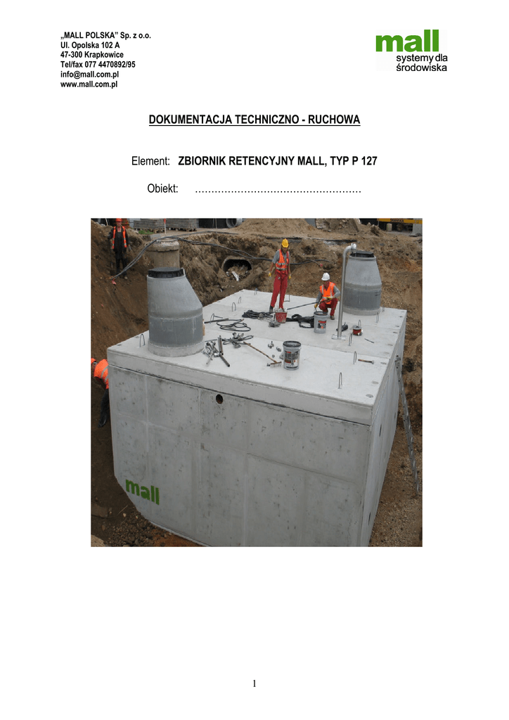 „MALL POLSKA” Sp. z o.o. Ul. Opolska 102 A 47-300 Krapkowice Tel/fax 077 4470892/95 [email protected] www.mall.com.pl DOKUMENTACJA TECHNICZNO - RUCHOWA Element: ZBIORNIK RETENCYJNY MALL, TYP P 127 Obiekt: …………………………………………… 1 „MALL POLSKA” Sp. z o.o. Ul. Opolska 102 A 47-300 Krapkowice Tel/fax 077 4470892/95 [email protected] www.mall.com.pl SPIS TREŚCI 1. PODSTAWY OPRACOWANIA DOKUMENTACJI 1.1 Przedmiot i zakres 2. WŁAŚCIWOŚCI UśYTKOWE ZBIORNIKA 3 WYMIARY I WIELKOŚCI ZBIORNIKA 4. ROZWIĄZANIA TECHNICZNE 5. PRZYGOTOWANIE WYKOPU 6. OPIS MONTAśU 7. ROBOTY WYKOŃCZENIOWE 8. WYPOSAśENIE 9. RYSUNKI 9.1 Rzut 9.2 Przekrój 9.3 Szczegół posadowienia zbiornika 2 „MALL POLSKA” Sp. z o.o. Ul. Opolska 102 A 47-300 Krapkowice Tel/fax 077 4470892/95 [email protected] www.mall.com.pl 1. PODSTAWY OPRACOWANIA PROJEKTU 1.1 PRZEDMIOT I ZAKRES Przedmiotem niniejszego opracowania jest dokumentacja techniczno - ruchowa zbiornika retencyjnego Mall typ P140. 2. WŁAŚCIWOŚCI UśYTKOWE ZBIORNIKA Zbiornik retencyjny zapewnia magazynowanie wody w okresach jej nadmiaru i wykorzystanie jej w innym okresie. 3. WYMIARY I WIELKOŚCI ZBIORNIKA Długość zbiornika: Szerokość zbiornika: Wysokość wewnętrzna zbiornika: Wysokość całkowita z pokrywą: Pojemność uŜytkowa: 4. 8,00 m 6,00 m 3,00 m 3,50 m 127,00 m3 ROZWIĄZANIA TECHNICZNE Zbiornik retencyjny Mall Typ P127 wykonany jako zbiornik prefabrykowany z Ŝelbetowych elementów z betonu klasy C 45/55 wodoszczelnego, klasa ekspozycji XC4/XA1, według DIN 1045-1, DIN 4281, PN EN 206. Klasa betonu 2 sprawdzona wg DIN 1045-3, ograniczenia powstawania rys zgodnie ze statyką typową < 0,25 m. Elementy zbiornika są produkowane w zakładzie prefabrykacji producenta i dostarczane na budowę przy pomocy samochodów niskopodwoziowych. Zbiornik składa się z elementów dolnych tzn. 2 elementów półokrągłych wysokości zewnętrznej ….. m, stanowiących początek i koniec zbiornika, 1 elementu środkowego tzw. u-profilu 3,00 m, wysokości zewnętrznej …… m oraz 3 sztuk odpowiednich płyt pokrywowych. Grubość ścian i dna zbiornika 200 mm, grubość pokrywy 300 mm. Poszczególne elementy zbiornika są wyposaŜone w kotwy stalowe oraz specjalne gniazda montaŜowe z markami stalowymi wszystkie stalowe elementy połączeń są zabezpieczone przed korozją. Wytrzymałość konstrukcji zapewniają połączenia śrubowe, za pomocą których są łączone poszczególne elementy zbiornika. Szczelne połączenia poszczególnych elementów zbiornika uzyskuje się dzięki elastomerowej uszczelce oraz dodatkowo w niektórych miejscach za pomocą specjalistycznych mas uszczelniających. 5. PRZYGOTOWANIE WYKOPU Wykop pod zbiornik naleŜy sprawdzić pod względem wymiarów, a takŜe odpowiednio zniwelować i wypoziomować. Przy przeciętnych warunkach gruntowych, podłoŜe pod zbiornik naleŜy zagęścić poprzez wykonanie warstwy nośnej co najmniej 30 cm. Warstwę nośną wykonać jako warstwę 25 cm pospółki oraz warstwę górną 5 cm grysu lub piasku 0,4 mm. Opisany współczynnik Proctora powinien osiągać 1,0 dla obliczeń statycznych zgodnie z załączonym rysunkiem. W przypadku innych warunków gruntowych, podłoŜe pod zbiornik naleŜy zaprojektować indywidualnie z uwzględnieniem 5 cm warstwy górnej grysu lub piasku 0,4 mm. Wykonanie wykopu powinno opowiadać obowiązującym przepisom. Wykop na czas montaŜu musi być odwodniony. 6. OPIS MONTAśU MontaŜ zbiornika w wykopie odbywa się przy pomocy dźwigu samojezdnego nie mniejszego niŜ 160 ton. Poszczególne elementy zbiornika są montowane w wykopie bezpośrednio z samochodów niskopodwoziowych lub z miejsca wcześniejszego rozładunku. Poszczególne elementy zbiornika po dostarczeniu do wykopu, są ze sobą łączone przy pomocy systemu specjalistycznych śrub. Na styku ścian łączonych elementów, znajduje się elastomerowa uszczelka zapewniająca szczelność zbiornika. W analogiczny sposób odbywa się montaŜ płyt pokrywowych. MontaŜ zbiornika nie moŜe odbywać się gdy w wykopie znajduje się woda gruntowa lub deszczowa. MontaŜ jest wykonywany przez specjalistyczną ekipę Mall Polska Sp. z o.o. 3 „MALL POLSKA” Sp. z o.o. Ul. Opolska 102 A 47-300 Krapkowice Tel/fax 077 4470892/95 [email protected] www.mall.com.pl 7. ROBOTY WYKOŃCZENIOWE Poziome i pionowe połączenia płyt pokrywowych w celu dodatkowego zabezpieczenia przed dostępem wody gruntowej naleŜy dodatkowo zabezpieczyć specjalną masą uszczelniającą. W celu zabezpieczenia przed korozją śrub łączących gniazda montaŜowe, znajdujące się wewnątrz zbiornika muszą one zostać zaślepione specjalnymi kostkami betonowymi i wodoszczelną zaprawą. W celu moŜliwości dokonania rewizji zbiornika, przewidziano wykonanie 2 otworów włazowych D 1000/400 mm wraz z nadbudowami. 8. WYPOSAśENIE Zbiornik jest wyposaŜony w: wyprowadzony ponad powierzchnię terenu, rurę wentylacyjną DN 100 ze stali nierdzewnej, tabliczkę informacyjną, 2 drabinki włazowe ze stali nierdzewnej oraz odpowiednie otwory wlotowe i wylotowe. 4 „MALL POLSKA” Sp. z o.o. Ul. Opolska 102 A 47-300 Krapkowice Tel/fax 077 4470892/95 [email protected] www.mall.com.pl 5