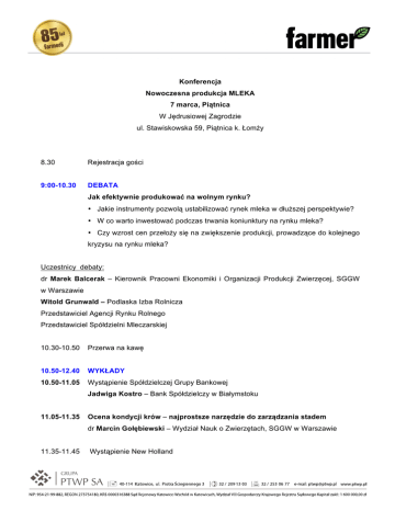 Konferencja Nowoczesna produkcja MLEKA 7 marca, Piątnica W Jędrusiowej Zagrodzie ul. Stawiskowska 59, Piątnica k. Łomży 8.30 Rejestracja gości 9:00-10.30 DEBATA Jak efektywnie produkować na wolnym rynku? • Jakie instrumenty pozwolą ustabilizować rynek mleka w dłuższej perspektywie? • W co warto inwestować podczas trwania koniunktury na rynku mleka? • Czy wzrost cen przełoży się na zwiększenie produkcji, prowadzące do kolejnego kryzysu na rynku mleka? Uczestnicy debaty: dr Marek Balcerak – Kierownik Pracowni Ekonomiki i Organizacji Produkcji Zwierzęcej, SGGW w Warszawie Witold Grunwald – Podlaska Izba Rolnicza Przedstawiciel Agencji Rynku Rolnego Przedstawiciel Spółdzielni Mleczarskiej 10.30-10.50 Przerwa na kawę 10.50-12.40 WYKŁADY 10.50-11.05 Wystąpienie Spółdzielczej Grupy Bankowej Jadwiga Kostro – Bank Spółdzielczy w Białymstoku 11.05-11.35 Ocena kondycji krów – najprostsze narzędzie do zarządzania stadem dr Marcin Gołębiewski – Wydział Nauk o Zwierzętach, SGGW w Warszawie 11.35-11.45 Wystąpienie New Holland 11.45-12.25 Odchów jałówek hodowlanych – jak zaprogramować wysokowydajną krowę? prof. dr hab. Henryk Grodzki – Wydział Nauk o Zwierzętach, SGGW w Warszawie 12.25-12.40 Alltech – naturalne rozwiązania żywieniowe dla krów mlecznych Jarosław Skiepko – Specjalista ds. Żywienia Zwierząt, Alltech 12.40-13.00 Przerwa na kawę 13.00-14.20 WYKŁADY 13.00-13.40 Budujemy nowoczesną oborę – najważniejsze aspekty inwestycji • Omówienie kluczowych punktów związanych z budową nowej obory, od projektu do zasiedlenia budynku dr Marcin Gołębiewski – Wydział Nauk o Zwierzętach, SGGW w Warszawie 13.40-13.50 Automatyczne karmienie krów – wybierz technologię na etapie planowania obory Józef Homanowski – Pellon 13.50-14.20 Najważniejsze parametry kukurydzy kiszonkowej • Jak dobrać odpowiednią odmianę kukurydzy kiszonkowej? • W jakim stopniu odmiana odpowiada za jakość paszy? prof. dr hab. Tadeusz Michalski – Wydział Rolnictwa i Bioinzynierii, Uniwersytet Przyrodniczy w Poznaniu 14.20 LUNCH