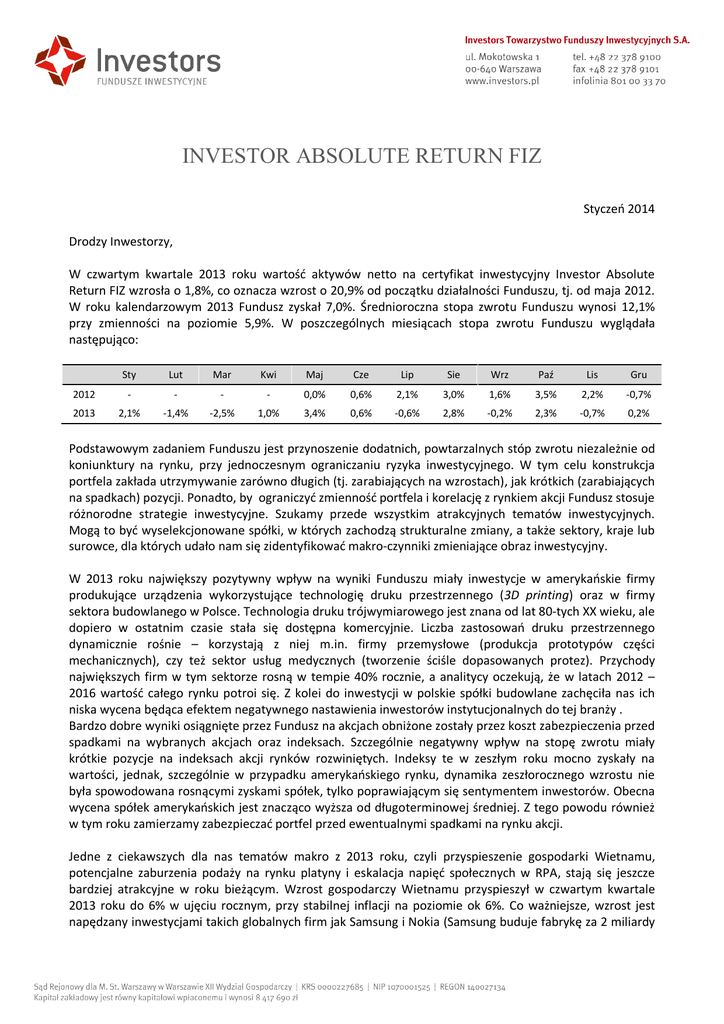 INVESTOR ABSOLUTE RETURN FIZ Styczeń 2014 Drodzy Inwestorzy, W czwartym kwartale 2013 roku wartość aktywów netto na certyfikat inwestycyjny Investor Absolute Return FIZ wzrosła o 1,8%, co oznacza wzrost o 20,9% od początku działalności Funduszu, tj. od maja 2012. W roku kalendarzowym 2013 Fundusz zyskał 7,0%. Średnioroczna stopa zwrotu Funduszu wynosi 12,1% przy zmienności na poziomie 5,9%. W poszczególnych miesiącach stopa zwrotu Funduszu wyglądała następująco: Sty Lut Mar Kwi Maj Cze Lip Sie Wrz Paź Lis Gru 2012 - - - - 0,0% 0,6% 2,1% 3,0% 1,6% 3,5% 2,2% -0,7% 2013 2,1% -1,4% -2,5% 1,0% 3,4% 0,6% -0,6% 2,8% -0,2% 2,3% -0,7% 0,2% Podstawowym zadaniem Funduszu jest przynoszenie dodatnich, powtarzalnych stóp zwrotu niezależnie od koniunktury na rynku, przy jednoczesnym ograniczaniu ryzyka inwestycyjnego. W tym celu konstrukcja portfela zakłada utrzymywanie zarówno długich (tj. zarabiających na wzrostach), jak krótkich (zarabiających na spadkach) pozycji. Ponadto, by ograniczyć zmienność portfela i korelację z rynkiem akcji Fundusz stosuje różnorodne strategie inwestycyjne. Szukamy przede wszystkim atrakcyjnych tematów inwestycyjnych. Mogą to być wyselekcjonowane spółki, w których zachodzą strukturalne zmiany, a także sektory, kraje lub surowce, dla których udało nam się zidentyfikować makro-czynniki zmieniające obraz inwestycyjny. W 2013 roku największy pozytywny wpływ na wyniki Funduszu miały inwestycje w amerykańskie firmy produkujące urządzenia wykorzystujące technologię druku przestrzennego (3D printing) oraz w firmy sektora budowlanego w Polsce. Technologia druku trójwymiarowego jest znana od lat 80-tych XX wieku, ale dopiero w ostatnim czasie stała się dostępna komercyjnie. Liczba zastosowań druku przestrzennego dynamicznie rośnie – korzystają z niej m.in. firmy przemysłowe (produkcja prototypów części mechanicznych), czy też sektor usług medycznych (tworzenie ściśle dopasowanych protez). Przychody największych firm w tym sektorze rosną w tempie 40% rocznie, a analitycy oczekują, że w latach 2012 – 2016 wartość całego rynku potroi się. Z kolei do inwestycji w polskie spółki budowlane zachęciła nas ich niska wycena będąca efektem negatywnego nastawienia inwestorów instytucjonalnych do tej branży . Bardzo dobre wyniki osiągnięte przez Fundusz na akcjach obniżone zostały przez koszt zabezpieczenia przed spadkami na wybranych akcjach oraz indeksach. Szczególnie negatywny wpływ na stopę zwrotu miały krótkie pozycje na indeksach akcji rynków rozwiniętych. Indeksy te w zeszłym roku mocno zyskały na wartości, jednak, szczególnie w przypadku amerykańskiego rynku, dynamika zeszłorocznego wzrostu nie była spowodowana rosnącymi zyskami spółek, tylko poprawiającym się sentymentem inwestorów. Obecna wycena spółek amerykańskich jest znacząco wyższa od długoterminowej średniej. Z tego powodu również w tym roku zamierzamy zabezpieczać portfel przed ewentualnymi spadkami na rynku akcji. Jedne z ciekawszych dla nas tematów makro z 2013 roku, czyli przyspieszenie gospodarki Wietnamu, potencjalne zaburzenia podaży na rynku platyny i eskalacja napięć społecznych w RPA, stają się jeszcze bardziej atrakcyjne w roku bieżącym. Wzrost gospodarczy Wietnamu przyspieszył w czwartym kwartale 2013 roku do 6% w ujęciu rocznym, przy stabilnej inflacji na poziomie ok 6%. Co ważniejsze, wzrost jest napędzany inwestycjami takich globalnych firm jak Samsung i Nokia (Samsung buduje fabrykę za 2 miliardy USD, która będzie produkować 120 milionów smartfonów rocznie), które wybierają Wietnam z uwagi na znacząco niższe koszty pracy niż w Chinach. Inwestycje pomagają zwiększyć eksport Wietnamu, który w 2013 roku wzrósł o 15% w stosunku do roku poprzedniego. Dodatkowym czynnikiem mogącym pozytywnie wpłynąć na wzrost lokalnego indeksu akcji będzie zwiększenie przez inwestorów zagranicznych limitu inwestycji w akcje wietnamskich spółek. Podtrzymujemy także nasze pozytywne nastawienie do platyny, która powinna korzystać z powolnego ożywienia w Europie. Spodziewamy się jednak, że głównym czynnikiem wpływającym na cenę tego metalu będą dalsze protesty pracowników firm wydobywających platynę. Związki zawodowe żądają obecnie dwukrotnego podniesienia pensji, na co nie mogą sobie pozwolić kopalnie, dla których produkcja staje się coraz mniej opłacalna z uwagi na szybko rosnące ceny energii elektrycznej. RPA dostarcza 75% światowej podaży platyny, dlatego zsynchronizowane wstrzymanie produkcji w tym kraju miałoby bezpośrednie przełożenie na światowe ceny metalu. Dodatkowym powodem do nasilenia niepokojów społecznych są zbliżające się wybory prezydenckie oraz skandal korupcyjny, w który zamieszany jest ubiegający się o reelekcję prezydent. Część aktywów Funduszu zaangażowana jest w strategie arbitrażowe, które przyniosły jedynie nieznaczny zysk w ubiegłym roku, ale mają szansę mieć większy wpływ na wynik w roku bieżącym. Arbitraż najczęściej polega na jednoczesnym zajmowaniu długich i krótkich pozycji na instrumentach, które są w stosunku do siebie niewłaściwie wycenione przez rynek. Ogromną zaletą tego typu strategii jest to, że mają bardzo niską korelację z szerokim rynkiem akcji, dzięki czemu pozwalają obniżyć zmienność portfela. Obecnie widzimy okazję do arbitrażu na akcjach rosyjskich spółek notowanych w Moskwie oraz pomiędzy kontraktami terminowymi na złoto, a tzw. bulionem, czyli fizycznymi sztabami złota. Maciej Wojtal Zarządzający Funduszem Tel: +48 22 378 9124 | Email: [email protected] Nota prawna: Niniejszy materiał ma wyłącznie charakter promocyjny. Opracowany został przez Investors TFI S.A. w związku z zarządzaniem funduszami inwestycyjnymi. Materiał oraz zawarte w nim prognozy stanowią wyłącznie wyraz poglądów jego autora i oparte zostały na stanie wiedzy aktualnym