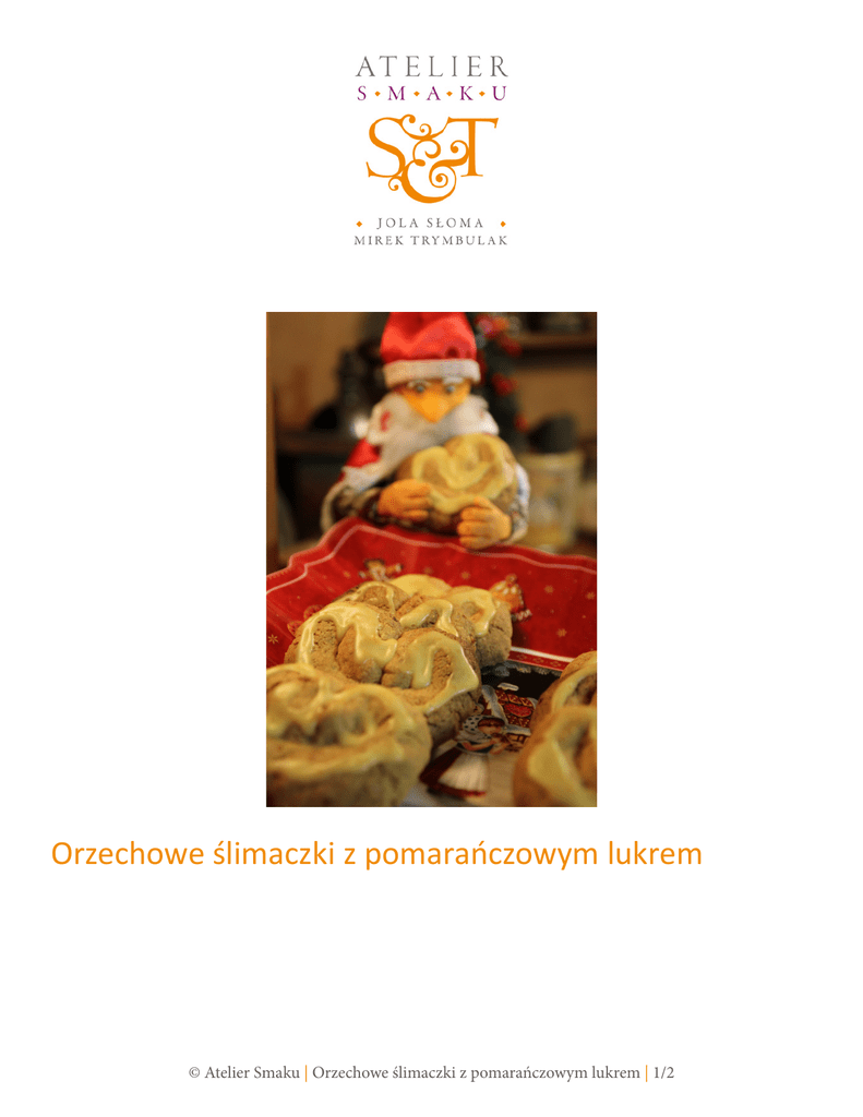 Orzechowe ślimaczki z pomarańczowym lukrem © Atelier Smaku | Orzechowe ślimaczki z pomarańczowym lukrem | 1/2 Składniki Ciastka 40 dag mąki kukurydzianej 25 dag brązowego cukru 15 dag zmieszanych i zmielonych migdałów i orzechów włoskich 150 ml rzadkiego mleka kokosowego 150 ml oleju słonecznikowego 2 łyżki siemienia lnianego 1,5 łyżeczki sody szczypta soli Pomarańczowy lukier 10 dag cukru pudru otarta skórka z połowy pomarańczy odrobina soku z pomarańczy Sposób przygotowania Brązowy cukier mielimy na puder, następnie wszystkie suche składniki na ciasto łączymy ze sobą i dokładnie mieszamy. Do tak przygotowanej bazy dolewamy olej i rozcieramy dobrze w palcach. Dodajemy mleka kokosowego i ponownie ucieramy. Dłonie moczymy w oleju, robimy to po to, by masa nie przykleiła się nam do dłoni. Nabieramy odrobinę ciasta, rolujemy je w palcach i, na wcześniej wysmarowanej olejem blaszce, formujemy z wałeczków ślimaczki. Całość wkładamy do piekarnika nagrzanego na 175°C i pieczemy ok. 25 minut. Do miseczki z cukrem pudrem dodajemy otartą skórkę pomarańczy i dolewamy kilka łyżeczek soku pomarańczowego i mieszamy tak długo, aż otrzymamy zawiesisty lukier. © Atelier Smaku | Orzechowe ślimaczki z pomarańczowym lukrem | 2/2