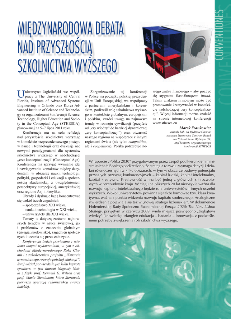 CONVENTIONES MIĘDZYNARODOWA DEBATA NAD PRZYSZŁOŚCIĄ SZKOLNICTWA WYŻSZEGO U niwersytet Jagielloński we współpracy z The University of Central Florida, Institute of Advanced Systems Engineering w Orlando oraz Korea Advanced Institute of Science and Technology są organizatorami konferencji Science, Technology, Higher Education and Society in the Conceptual Age (STHESCA), planowanej na 5–7 lipca 2011 roku. Konferencja ma na celu refleksję nad przyszłością szkolnictwa wyższego w kontekście bezprecedensowego postępu w nauce i technologii oraz dyskusję nad nowymi paradygmatami dla systemów szkolnictwa wyższego w nadchodzącej „erze konceptualizacji” (Conceptual Age). Konferencja ma sprzyjać wymianie idei i nawiązywaniu kontaktów między decydentami w obszarze nauki, technologii, polityki, gospodarki i edukacji a społecznością akademicką, z uwzględnieniem perspektywy europejskiej, amerykańskiej oraz regionu Azji i Pacyfiku. Obrady i dyskusje będą koncentrować się wokół trzech zagadnień: – społeczeństwo XXI wieku, – nauka i technologia w XXI wieku, – uniwersytety dla XXI wieku. Tematy te dotyczą zarówno najnowszych trendów w nauce światowej, jak i problemów o znaczeniu globalnym (energia, środowisko), zagadnień społecznych i uczenia się przez całe życie. Konferencja będzie powiązana z wieloma innymi wydarzeniami, w tym z obchodami Międzynarodowego Roku Chemii i z zakończeniem projektu „Wsparcie dynamicznego rozwoju polskiej edukacji”. Swój udział potwierdziło już kilku keynote speakers, w tym laureat Nagrody Nobla z fizyki prof. Kenneth G. Wilson oraz prof. Maria Siemionow, która kierowała pierwszą operacją rekonstrukcji twarzy ludzkiej. Zorganizowanie tej konferencji w Polsce, na początku polskiej prezydencji w Unii Europejskiej, we współpracy z partnerami amerykańskim i koreańskim, podkreśli rolę szkolnictwa wyższego w kontekście globalnym, europejskim i polskim, zwróci uwagę na najnowsze trendy w rozwoju cywilizacji (przejście od „ery wiedzy” do bardziej dynamicznej „ery konceptualizacji”) oraz otwartość naszego regionu na współpracę z innymi regionami świata (nie tylko competition, ale i coopetition). Polska potrzebuje no- wego znaku firmowego – aby pozbyć się stygmatu East-European brand. Takim znakiem firmowym może być promowanie kreatywności w kontekście nadchodzącej „ery konceptualizacji”. Więcej informacji można znaleźć na stronie internetowej konferencji www.sthesca.eu Marek Frankowicz adiunkt hab. na Wydziale Chemii; zastępca kierownika Centrum Badań nad Szkolnictwem Wyższym UJ; szef komitetu organizacyjnego konferencji STHESCA W raporcie „Polska 2030” przygotowanym przez zespół pod kierunkiem ministra Michała Boniego podkreślono, że strategia rozwoju wymaga decyzji i działań równoczesnych w kilku obszarach, w tym w obszarze budowy potencjału przyszłych przewag konkurencyjnych – kapitał ludzki, kapitał intelektualny, kapitał kreatywny. Kreatywność winna być jedną z głównych sił rozwojowych w przebudowie kraju. W ciągu najbliższych 20 lat niezwykle ważna dla rozwoju kapitału intelektualnego będzie rola uniwersytetów i innych uczelni wyższych. Wokół uniwersytetów powinna się także formować tzw. klasa kreatywna, ważna z punktu widzenia rozwoju kapitału społecznego. Analogiczne stwierdzenia pojawiają się też w „nowej strategii lizbońskiej”. W dokumencie Holenderskiej Rady Społeczno-Ekonomicznej Europe 2020: The New Lisbon Strategy, przyjętym w czerwcu 2009, wiele miejsca poświęcono „trójkątowi wiedzy” (knowledge triangle): edukacja – badania – innowacja, z podkreśleniem potrzeby zwiększenia roli szkolnictwa wyższego. ALMA MATER nr 128 63