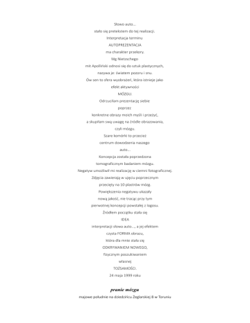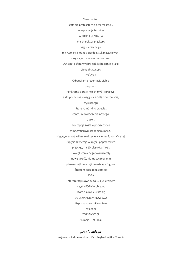 Słowo auto... stało się pretekstem do tej realizacji. Interpretacja terminu AUTOPREZENTACJA ma charakter przekory. Wg Nietzschego mit Apolliński odnosi się do sztuk plastycznych, nazywa je: światem pozoru i snu. Ów sen to sfera wyobrażeń, która istnieje jako efekt aktywności MÓZGU. Odrzuciłam prezentację siebie poprzez konkretne obrazy moich myśli i przeżyć, a skupiłam swą uwagę na źródle obrazowania, czyli mózgu. Szare komórki to przecież centrum dowodzenia naszego auto... Koncepcja została poprzedzona tomograficznym badaniem mózgu. Negatyw umożliwił mi realizację w ciemni fotograficznej. Zdjęcia zawierają w ujęciu poprzecznym przecięty na 10 plastrów mózg. Powiększenia negatywu ukazały nową jakość, nie tracąc przy tym pierwotnej koncepcji powstałej z logosu. Źródłem początku stała się IDEA interpretacji słowa auto..., a jej efektem czysta FORMA obrazu, która dla mnie stała się ODKRYWANIEM NOWEGO, fizycznym poszukiwaniem własnej TOŻSAMOŚCI. 24 maja 1999 roku pranie mózgu majowe południe na dziedzińcu Żeglarskiej 8 w Toruniu