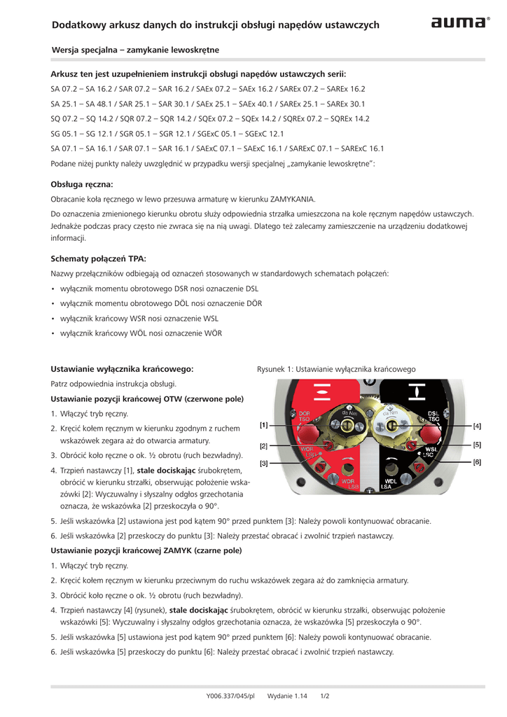 Dodatkowy arkusz danych do instrukcji obsługi napędów ustawczych Wersja specjalna – zamykanie lewoskrętne Arkusz ten jest uzupełnieniem instrukcji obsługi napędów ustawczych serii: SA 07.2 – SA 16.2 / SAR 07.2 – SAR 16.2 / SAEx 07.2 – SAEx 16.2 / SAREx 07.2 – SAREx 16.2 SA 25.1 – SA 48.1 / SAR 25.1 – SAR 30.1 / SAEx 25.1 – SAEx 40.1 / SAREx 25.1 – SAREx 30.1 SQ 07.2 – SQ 14.2 / SQR 07.2 – SQR 14.2 / SQEx 07.2 – SQEx 14.2 / SQREx 07.2 – SQREx 14.2 SG 05.1 – SG 12.1 / SGR 05.1 – SGR 12.1 / SGExC 05.1 – SGExC 12.1 SA 07.1 – SA 16.1 / SAR 07.1 – SAR 16.1 / SAExC 07.1 – SAExC 16.1 / SARExC 07.1 – SARExC 16.1 Podane niżej punkty należy uwzględnić w przypadku wersji specjalnej „zamykanie lewoskrętne”: Obsługa ręczna: Obracanie koła ręcznego w lewo przesuwa armaturę w kierunku ZAMYKANIA. Do oznaczenia zmienionego kierunku obrotu służy odpowiednia strzałka umieszczona na kole ręcznym napędów ustawczych. Jednakże podczas pracy często nie zwraca się na nią uwagi. Dlatego też zalecamy zamieszczenie na urządzeniu dodatkowej informacji. Schematy połączeń TPA: Nazwy przełączników odbiegają od oznaczeń stosowanych w standardowych schematach połączeń: • wyłącznik momentu obrotowego DSR nosi oznaczenie DSL • wyłącznik momentu obrotowego DÖL nosi oznaczenie DÖR • wyłącznik krańcowy WSR nosi oznaczenie WSL • wyłącznik krańcowy WÖL nosi oznaczenie WÖR Rysunek 1: Ustawianie wyłącznika krańcowego Ustawianie wyłącznika krańcowego: Patrz odpowiednia instrukcja obsługi. Ustawianie pozycji krańcowej OTW (czerwone pole) 1. Włączyć tryb ręczny. 2. Kręcić kołem ręcznym w kierunku zgodnym z ruchem wskazówek zegara aż do otwarcia armatury. 3. Obrócić koło ręczne o ok. ½ obrotu (ruch bezwładny). 4. Trzpień nastawczy [1], stale dociskając śrubokrętem, obrócić w kierunku strzałki, obserwując położenie wskazówki [2]: Wyczuwalny i słyszalny odgłos grzechotania oznacza, że wskazówka [2] przeskoczyła o 90°. 5. Jeśli wskazówka [2] ustawiona jest pod kątem 90° przed punktem [3]: Należy powoli kontynuować obracanie. 6. Jeśli wskazówka [2] przeskoczy do punktu [3]: Należy przestać obracać i zwolnić trzpień nastawczy. Ustawianie pozycji krańcowej ZAMYK (czarne pole) 1. Włączyć tryb ręczny. 2. Kręcić kołem ręcznym w kierunku przeciwnym do ruchu wskazówek zegara aż do zamknięcia armatury. 3. Obrócić koło ręczne o ok. ½ obrotu (ruch bezwładny). 4. Trzpień nastawczy [4] (rysunek), stale dociskając śrubokrętem, obrócić w kierunku strzałki, obserwując położenie wskazówki [5]: Wyczuwalny i słyszalny odgłos grzechotania oznacza, że wskazówka [5] przeskoczyła o 90°. 5. Jeśli wskazówka [5] ustawiona jest pod kątem 90° przed punktem [6]: Należy powoli kontynuować obracanie. 6. Jeśli wskazówka [5] przeskoczy do punktu [6]: Należy przestać obracać i zwolnić trzpień nastawczy. Y006.337/045/pl Wydanie 1.14 1/2 Dodatkowy arkusz danych do instrukcji obsługi napędów ustawczych Wersja specjalna – zamykanie lewoskrętne Ustawianie pozycji pośrednich (opcja): Rysunek 2: Ustawianie pozycji pośrednich Dokonać nastawy zgodnie z opisem w instrukcji obsługi napędu, z następującą różnicą: • Dla kierunku ruchu ZAMYK. obracać trzpień nastawczy [4] (czarne pole). • Dla kierunku ruchu OTW. obracać trzpień nastawczy [1] (czerwone pole). Ustawianie wyłącznika momentu obrotowego: Dokonać nastawy zgodnie z opisem w instrukcji obsługi napędu, z następującą różnicą: • Nastawę pozycji krańcowej OTW. przeprowadza się za pomocą czarnej tarczy z podziałką. • Nastawę pozycji krańcowej ZAMYK. przeprowadza się za pomocą białej tarczy z podziałką. Rysunek 3: Głowice do pomiaru momentu obrotowego Nastawa OTW. Nastawa ZAMYK. Ustawianie potencjometru (opcja): Dokonać nastawy zgodnie z opisem w instrukcji obsługi napędu, z następującą różnicą: • Napędy serii SA..., SQ...: Obrócić do oporu potencjometr [1] przeciwnie do kierunku ruchu wskazówek zegara. • Napędy serii SG...: Obrócić do oporu potencjometr [1] w kierunku ruchu wskazówek zegara. Y006.337/045/pl Wydanie 1.14 2/2