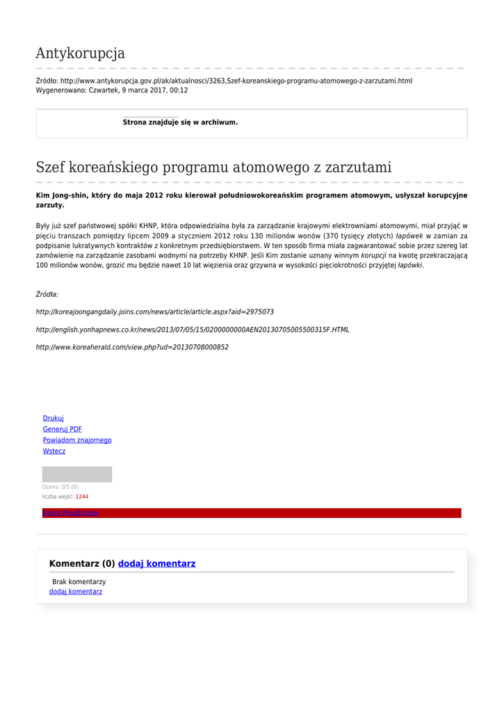 Antykorupcja Źródło: http://www.antykorupcja.gov.pl/ak/aktualnosci/3263,Szef-koreanskiego-programu-atomowego-z-zarzutami.html Wygenerowano: Czwartek, 9 marca 2017, 00:12 Strona znajduje się w archiwum. Szef koreańskiego programu atomowego z zarzutami Kim Jong-shin, który do maja 2012 roku kierował południowokoreańskim programem atomowym, usłyszał korupcyjne zarzuty. Były już szef państwowej spółki KHNP, która odpowiedzialna była za zarządzanie krajowymi elektrowniami atomowymi, miał przyjąć w pięciu transzach pomiędzy lipcem 2009 a styczniem 2012 roku 130 milionów wonów (370 tysięcy złotych) łapówek w zamian za podpisanie lukratywnych kontraktów z konkretnym przedsiębiorstwem. W ten sposób firma miała zagwarantować sobie przez szereg lat zamówienie na zarządzanie zasobami wodnymi na potrzeby KHNP. Jeśli Kim zostanie uznany winnym korupcji na kwotę przekraczającą 100 milionów wonów, grozić mu będzie nawet 10 lat więzienia oraz grzywna w wysokości pięciokrotności przyjętej łapówki. Źródła: http://koreajoongangdaily.joins.com/news/article/article.aspx?aid=2975073 http://english.yonhapnews.co.kr/news/2013/07/05/15/0200000000AEN20130705005500315F.HTML http://www.koreaherald.com/view.php?ud=20130708000852 Drukuj Generuj PDF Powiadom znajomego Wstecz Ocena: 0/5 (0) liczba wejść: 1244 Korea Południowa Komentarz (0) dodaj komentarz Brak komentarzy dodaj komentarz