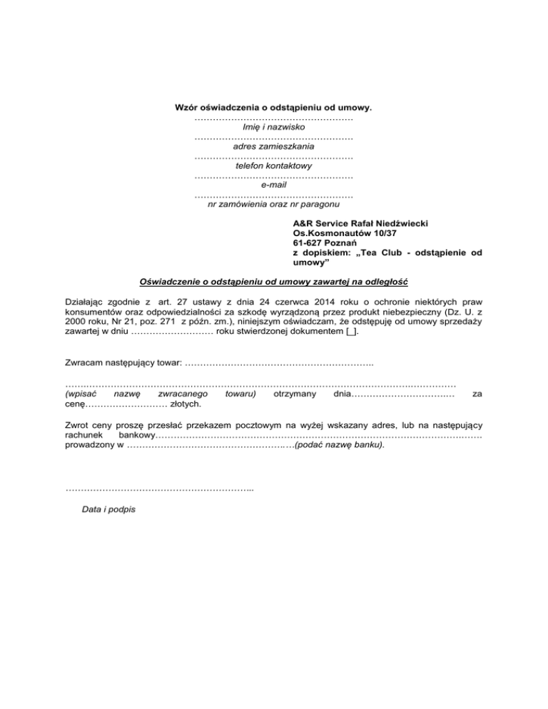 Wzór oświadczenia o odstąpieniu od umowy. ……………………………………………. Imię i nazwisko ……………………………………………. adres zamieszkania ……………………………………………. telefon kontaktowy ……………………………………………. e-mail ……………………………………………. nr zamówienia oraz nr paragonu A&R Service Rafał Niedźwiecki Os.Kosmonautów 10/37 61-627 Poznań z dopiskiem: „Tea Club - odstąpienie od umowy” Oświadczenie o odstąpieniu od umowy zawartej na odległość Działając zgodnie z art. 27 ustawy z dnia 24 czerwca 2014 roku o ochronie niektórych praw konsumentów oraz odpowiedzialności za szkodę wyrządzoną przez produkt niebezpieczny (Dz. U. z 2000 roku, Nr 21, poz. 271 z późn. zm.), niniejszym oświadczam, że odstępuję od umowy sprzedaży zawartej w dniu ……………………… roku stwierdzonej dokumentem [_]. Zwracam następujący towar: …………………………………………………….. …….…………………………………………………………………………………………….…………… (wpisać nazwę zwracanego towaru) otrzymany dnia………………………….… cenę……………………… złotych. za Zwrot ceny proszę przesłać przekazem pocztowym na wyżej wskazany adres, lub na następujący rachunek bankowy……………………………………………………………………………………….……. prowadzony w …………………………………………….…(podać nazwę banku). …………………………………………………….. Data i podpis