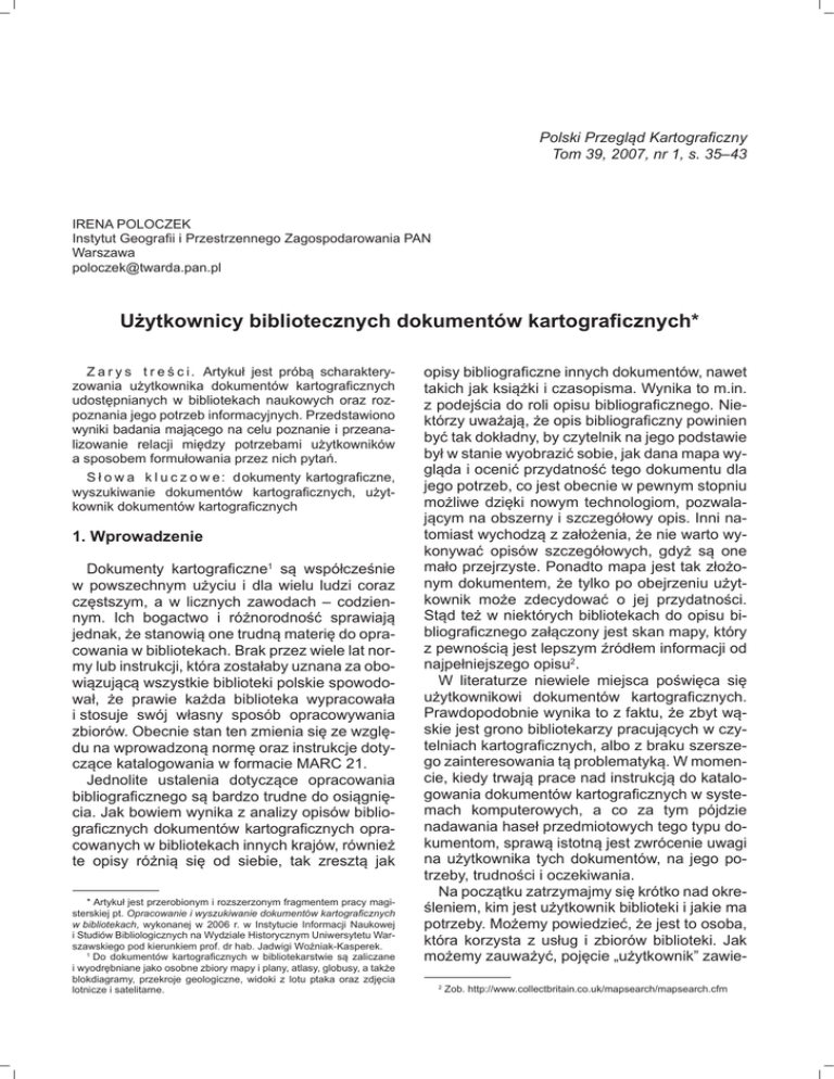 Polski Przegląd Kartograficzny Tom 39, 2007, nr 1, s. 35–43 IRENA POLOCZEK Instytut Geografii i Przestrzennego Zagospodarowania PAN Warszawa [email protected] Użytkownicy bibliotecznych dokumentów kartograficznych* Z a r y s t r e ś c i . Artykuł jest próbą scharaktery zowania użytkownika dokumentów kartograficznych udostępnianych w bibliotekach naukowych oraz roz poznania jego potrzeb informacyjnych. Przedstawiono wyniki badania mającego na celu poznanie i przeana lizowanie relacji między potrzebami użytkowników a sposobem formułowania przez nich pytań. S ł o w a k l u c z o w e : d okumenty kartograficzne, wyszukiwanie dokumentów kartograficznych, użyt kownik dokumentów kartograficznych 1. Wprowadzenie Dokumenty kartograficzne1 są współcześnie w powszechnym użyciu i dla wielu ludzi coraz częstszym, a w licznych zawodach – codzien nym. Ich bogactwo i różnorodność sprawiają jednak, że stanowią one trudną materię do opra cowania w bibliotekach. Brak przez wiele lat nor my lub instrukcji, która zostałaby uznana za obo wiązującą wszystkie biblioteki polskie spowodo wał, że prawie każda biblioteka wypracowała i stosuje swój własny sposób opracowywania zbiorów. Obecnie stan ten zmienia się ze wzglę du na wprowadzoną normę oraz instrukcje doty czące katalogowania w formacie MARC 21. Jednolite ustalenia dotyczące opracowania bibliograficznego są bardzo trudne do osiągnię cia. Jak bowiem wynika z analizy opisów biblio graficznych dokumentów kartograficznych opra cowanych w bibliotekach innych krajów, również te opisy różnią się od siebie, tak zresztą jak * Artykuł jest przerobionym i rozszerzonym fragmentem pracy magi sterskiej pt. Opracowanie i wyszukiwanie dokumentów kartograficznych w bibliotekach, wykonanej w 2006 r. w Instytucie Informacji Naukowej i Studiów Bibliologicznych na Wydziale Historycznym Uniwersytetu War szawskiego pod kierunkiem prof. dr hab. Jadwigi Woźniak-Kasperek. 1 Do dokumentów kartograficznych w bibliotekarstwie są zaliczane i wyodrębniane jako osobne zbiory mapy i plany, atlasy, globusy, a także blokdiagramy, przekroje geologiczne, widoki z lotu ptaka oraz zdjęcia lotnicze i satelitarne. opisy bibliograficzne innych dokumentów, nawet takich jak książki i czasopisma. Wynika to m.in. z podejścia do roli opisu bibliograficznego. Nie którzy uważają, że opis bibliograficzny powinien być tak dokładny, by czytelnik na jego podstawie był w stanie wyobrazić sobie, jak dana mapa wy gląda i ocenić przydatność tego dokumentu dla jego potrzeb, co jest obecnie w pewnym stopniu możliwe dzięki nowym technologiom, pozwala jącym na obszerny i szczegółowy opis. Inni na tomiast wychodzą z założenia, że nie warto wy konywać opisów szczegółowych, gdyż są one mało przejrzyste. Ponadto mapa jest tak złożo nym dokumentem, że tylko po obejrzeniu użyt kownik może zdecydować o jej przydatności. Stąd też w niektórych bibliotekach do opisu bi bliograficznego załączony jest skan mapy, który z pewnością jest lepszym źródłem informacji od najpełniejszego opisu2. W literaturze niewiele miejsca poświęca się użytkownikowi dokumentów kartograficznych. Prawdopodobnie wynika to z faktu, że zbyt wą skie jest grono bibliotekarzy pracujących w czy telniach kartograficznych, albo z braku szersze go zainteresowania tą problematyką. W momen cie, kiedy trwają prace nad instrukcją do katalo gowania dokumentów kartograficznych w syste mach komputerowych, a co za tym pójdzie nadawania haseł przedmiotowych tego typu do kumentom, sprawą istotną jest zwrócenie uwagi na użytkownika tych dokumentów, na jego po trzeby, trudności i oczekiwania. Na początku zatrzymajmy się krótko nad okre śleniem, kim jest użytkownik biblioteki i jakie ma potrzeby. Możemy powiedzieć, że jest to osoba, która korzysta z usług i zbiorów biblioteki. Jak możemy zauważyć, pojęcie „użytkownik” zawie 2 Zob. http://www.collectbritain.co.uk/mapsearch/mapsearch.cfm 36 Irena Poloczek ra w sobie pojęcie „czytelnik”, ale jednocześnie wskazuje dodatkowe możliwości, jakie oprócz tradycyjnych materiałów bibliotecznych (książek, czasopism) daje czytelnikowi współczesna bi blioteka. To nie jest już tylko i wyłącznie obsługa czytelnika, ale wachlarz usług informacyjnych mogących zaspokoić jego potrzeby, a jednocze śnie wymagający od użytkownika umiejętności ich wyszukiwania i wykorzystania. Dlatego użyt kownika biblioteki możemy nazwać użytkowni kiem informacji: „Użytkownik informacji to osoba (fizyczna lub prawna) korzystająca z usług sys temu informacyjno-wyszukiwawczego, w tym z bibliotek i innych instytucji zajmujących się działalnością informacyjną” (J.Woźniak-Kaspe rek 2005, s. 34). We Wprowadzeniu do bibliotekoznawstwa Je rzy Ratajewski zwraca uwagę, że „biblioteko znawstwo może rozpatrywać problem użytkow ników bibliotek w różnych aspektach, np.: użyt kownik jako twórca oraz odbiorca dokumentów i informacji zgromadzonych w bibliotece, jako członek grupy społecznej (rodzinnej, zawodo wej, narodowej, religijnej itp.), jako indywiduum fizyczne i psychiczne, jako członek jakiejś in stytucji oraz uczestnik jej życia i działalności, jako członek ‘niewidzialnego kolegium’ w nauce i technice, jako stały i nierozerwalny element systemu ‘biblioteka’” (J. Ratajewski 2002, s. 29– 30). Ponadto autor podkreśla, że ten sam użyt kownik często występuje w różnych grupach lub kategoriach użytkowników i że jego potrzeby nie mają stałego charakteru, gdyż zbyt wiele czyn ników społecznych je warunkuje. Do ważniej szych zjawisk określających potrzeby użytkow ników J. Ratajewski zalicza: • stały oraz ciągle poszerzający się i coraz bardziej różnorodny przyrost wiedzy ludzkiej, • ewolucję metod i form utrwalania wiedzy, • rozwój systemów oświaty w świecie i ich de mokratyzację, • poszerzanie 
