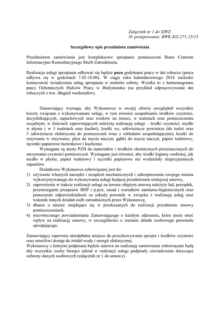 Załącznik nr 1 do SIWZ Nr postępowania: BWK-KG-271-23/13 Szczegółowy opis przedmiotu zamówienia Przedmiotem zamówienia jest kompleksowe sprzątanie pomieszczeń Biura Centrum Informacyjno-Konsultacyjnego Służb Zatrudnienia. Realizacja usługi sprzątania odbywać się będzie poza godzinami pracy w dni robocze (praca odbywa się w godzinach 7.45-18.00). W ciągu roku kalendarzowego 2014 zachodzi konieczność świadczenia usług sprzątania w niektóre soboty. Wynika to z harmonogramu pracy Ochotniczych Hufców Pracy w Białymstoku (na przykład odpracowywanie dni roboczych z tzw. długich weekendów). Zamawiający wymaga, aby Wykonawca w swojej ofercie uwzględnił wszystkie koszty związane z wykonywaniem usługi, w tym również uzupełnianie środków czystości, dezynfekujących, zapachowych oraz worków na śmieci, w toaletach oraz pomieszczeniu socjalnym, w ilościach zapewniających należytą realizację usługi – środki czystości: mydło w płynie ( w 3 toaletach oraz kuchni), kostki wc, odświeżacze powietrza (do toalet oraz 3 odświeżacze elektryczne do pomieszczeń wraz z wkładami uzupełniającymi), kostki do zmywania w zmywarce, płyn do mycia naczyń, gąbki do mycia naczyń, papier toaletowy, ręczniki papierowe łazienkowe i kuchenne. Wymagane są atesty PZH do materiałów i środków chemicznych przeznaczonych do utrzymania czystości pomieszczeń. Wymagane jest również, aby środki higieny osobistej, jak mydło w płynie, papier toaletowy i ręczniki papierowe nie wydzielały nieprzyjemnych zapachów. Dodatkowo Wykonawca zobowiązany jest do: 1) używania własnych narzędzi i urządzeń mechanicznych i zabezpieczenia swojego mienia wykorzystywanego do wykonywania usługi będącej przedmiotem niniejszej umowy, 2) zapewnienia w trakcie realizacji usługi na terenie objętym umową należyty ład, porządek, przestrzeganie przepisów BHP i p.poż, zasad i warunków sanitarno-higienicznych oraz ponoszenie odpowiedzialnośi za szkody powstałe w związku z realizacją usług oraz wskutek innych działań osób zatrudnionych przez Wykonawcę, 3) dbania o mienie znajdujące się w przekazanych do realizacji przedmiotu umowy pomieszczeniach, 4) niezwłocznego powiadamiania Zamawiającego o każdym zdarzeniu, które może mieć wpływ na realizację umowy, w szczególności o zmianie składu osobowego personelu sprzątającego. Zamawiający zapewnia nieodpłatne miejsce do przechowywania sprzętu i środków czystości oraz umożliwi dostęp do źródeł wody i energii elektrycznej. Wykonawcy z którymi podpisana będzie umowa na realizację zamówienia zobowiązani będą aby wszystkie osoby biorące udział w realizacji usługi podpisały oświadczenie dotyczące ochrony danych osobowych (załącznik nr 1 do umowy). Zakres i częstotliwość podstawowych prac porządkowych: Codziennie: - opróżnianie i czyszczenie pojemników na śmieci, wymiana wkładów foliowych oraz składowanie odpadów w wyznaczonych do tego miejscach (kosze małe biurowe 32 szt + 2 duże), -odkurzanie i mycie podłóg (60,78m2 stanowi gres, 233,10 m2 stanowi wykładzina dywanowa), - wycieranie i mycie blatów biurek, stołów, szafek, parapetów, drzwi, szafek kuchennych z zewnątrz oraz wewnątrz, zlewozmywaków, lodówek, mikrofali, ekspresu do kawy, zmywarek i luster, - czyszczenie i dezynfekowanie podłóg, płytek ceramicznych podłogowych i ściennych oraz wszystkich urządzeń w WC (w tym pojemników na środki czystości oraz papier) przy użyciu środków dezynfekujących (powierzchnia łazienek 17,58 m2), - zamiatanie i mycie ciągów komunikacyjnych. Raz w tygodniu: - odkurzanie tapicerki meblowej, - wycieranie i mycie szaf, regałów biurowych, - mycie środkiem dezynfekującym glazury i drzwi w WC, - mycie drzwi szklanych oraz ścian przeszklonych (obustronne) powierzchnia jednostronna szyb (32,335 m2), - odkurzanie podłóg w pokoju nr 220 (34 m2), - wycieranie i mycie blatów biurek, stołów, szafek, parapetów w pokoju nr 220. Raz w miesiącu: -mycie drzwi, framug oraz włączników światła, - wycieranie z kurzu krat wentylacyjnych, - odkamienianie i czyszczenie czajników elektrycznych (3szt.) oraz ekspresu do kawy (ciśnieniowy). Raz na pół roku: - pranie wykładziny i tapicerek meblowych, - mycie okien (7 okien o szer. ok. 90cm), rolet, verticali. W zależności od potrzeb: - wycieranie plam ze ścian, podłóg i wykładzin, - wymiana odświeżaczy powietrza w wc oraz wymiana wkładów w odświeżaczach elektrycznych, - czyszczenie krzeseł tapicerowanych, - odkurzanie pajęczyn, - podlewanie i pielęgnacja kwiatów. Kontrola wykonania w/w czynności będzie przeprowadzana na bieżąco poprzez wyrywkowe kontrole prowadzone przez upoważnionych pracowników Zamawiającego. Zamawiający zastrzega sobie również prawo do kontroli środków chemicznych (czyszczących) używanych przez pracowników Wykonawcy.