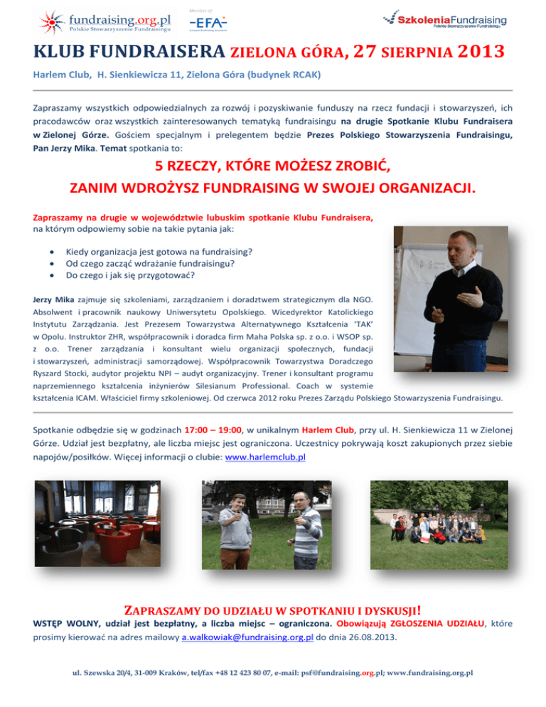 KLUB FUNDRAISERA ZIELONA GÓRA, 27 SIERPNIA 2013 Harlem Club, H. Sienkiewicza 11, Zielona Góra (budynek RCAK) Zapraszamy wszystkich odpowiedzialnych za rozwój i pozyskiwanie funduszy na rzecz fundacji i stowarzyszeń, ich pracodawców oraz wszystkich zainteresowanych tematyką fundraisingu na drugie Spotkanie Klubu Fundraisera w Zielonej Górze. Gościem specjalnym i prelegentem będzie Prezes Polskiego Stowarzyszenia Fundraisingu, Pan Jerzy Mika. Temat spotkania to: 5 RZECZY, KTÓRE MOŻESZ ZROBIĆ, ZANIM WDROŻYSZ FUNDRAISING W SWOJEJ ORGANIZACJI. Zapraszamy na drugie w województwie lubuskim spotkanie Klubu Fundraisera, na którym odpowiemy sobie na takie pytania jak: Kiedy organizacja jest gotowa na fundraising? Od czego zacząć wdrażanie fundraisingu? Do czego i jak się przygotować? Jerzy Mika zajmuje się szkoleniami, zarządzaniem i doradztwem strategicznym dla NGO. Absolwent i pracownik naukowy Uniwersytetu Opolskiego. Wicedyrektor Katolickiego Instytutu Zarządzania. Jest Prezesem Towarzystwa Alternatywnego Kształcenia ‘TAK’ w Opolu. Instruktor ZHR, współpracownik i doradca firm Maha Polska sp. z o.o. i WSOP sp. z o.o. Trener zarządzania i konsultant wielu organizacji społecznych, fundacji i stowarzyszeń, administracji samorządowej. Współpracownik Towarzystwa Doradczego Ryszard Stocki, audytor projektu NPI – audyt organizacyjny. Trener i konsultant programu naprzemiennego kształcenia inżynierów Silesianum Professional. Coach w systemie kształcenia ICAM. Właściciel firmy szkoleniowej. Od czerwca 2012 roku Prezes Zarządu Polskiego Stowarzyszenia Fundraisingu. Spotkanie odbędzie się w godzinach 17:00 – 19:00, w unikalnym Harlem Club, przy ul. H. Sienkiewicza 11 w Zielonej Górze. Udział jest bezpłatny, ale liczba miejsc jest ograniczona. Uczestnicy pokrywają koszt zakupionych przez siebie napojów/posiłków. Więcej informacji o clubie: www.harlemclub.pl ZAPRASZAMY DO UDZIAŁU W SPOTKANIU I DYSKUSJI! WSTĘP WOLNY, udział jest bezpłatny, a liczba miejsc – ograniczona. Obowiązują ZGŁOSZENIA UDZIAŁU, które prosimy kierować na adres mailowy [email protected] do dnia 26.08.2013. ul. Szewska 20/4, 31-009 Kraków, tel/fax +48 12 423 80 07, e-mail: [email protected]; www.fundraising.org.pl