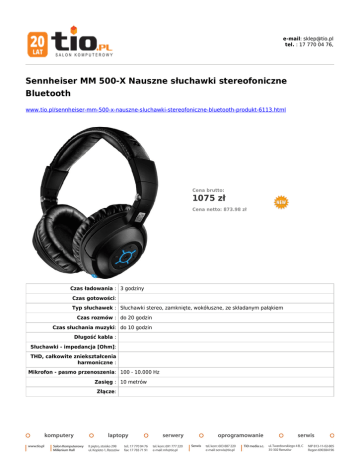 e-mail: [email protected] tel. : 17 770 04 76, Sennheiser MM 500-X Nauszne słuchawki stereofoniczne Bluetooth www.tio.pl/sennheiser-mm-500-x-nauszne-sluchawki-stereofoniczne-bluetooth-produkt-6113.html Cena brutto: 1075 zł Cena netto: 873.98 zł Czas ładowania : 3 godziny Czas gotowości: Typ słuchawek : Słuchawki stereo, zamknięte, wokółuszne, ze składanym pałąkiem Czas rozmów : do 20 godzin Czas słuchania muzyki: do 10 godzin Długość kabla : Słuchawki - impedancja [Ohm]: THD, całkowite zniekształcenia harmoniczne : Mikrofon - pasmo przenoszenia: 100 - 10.000 Hz Zasięg : 10 metrów Złącze: Słuchawki - poziom ciśnienia 107 dB (dla 1mW, 1kHz) akustycznego (SPL): Mikrofon - rodzaj : do-okólny (wielokierunkowy) Słuchawki - pasmo 15 - 22000 HZ przenoszenia: Słuchawki - typ przetwornika: Mikrofon - czułość: Technologia : Bluetooth 2.1 + EDR/wspierane profile A2DP + AVRCP + HSP + HFP/kodeki:SBC, apt-X *Ceny obowiązują wyłącznie przy składaniu zamówień przez sklep internetowy. Ceny w salonie TiO media mogą nieznacznie różnić się od cen prezentowanych na stronach sklepu internetowego. Przedstawiona oferta w sklepie internetowym nie stanowi oferty w rozumieniu Kodeksu Cywilnego, i jest jedynie zaproszeniem do rozpoczęcia rokowań (zgodnie z art. 71 k.c.). Zastrzegamy sobie prawo do niezrealizowania zamówień z ważnych przyczyn ekonomicznych.