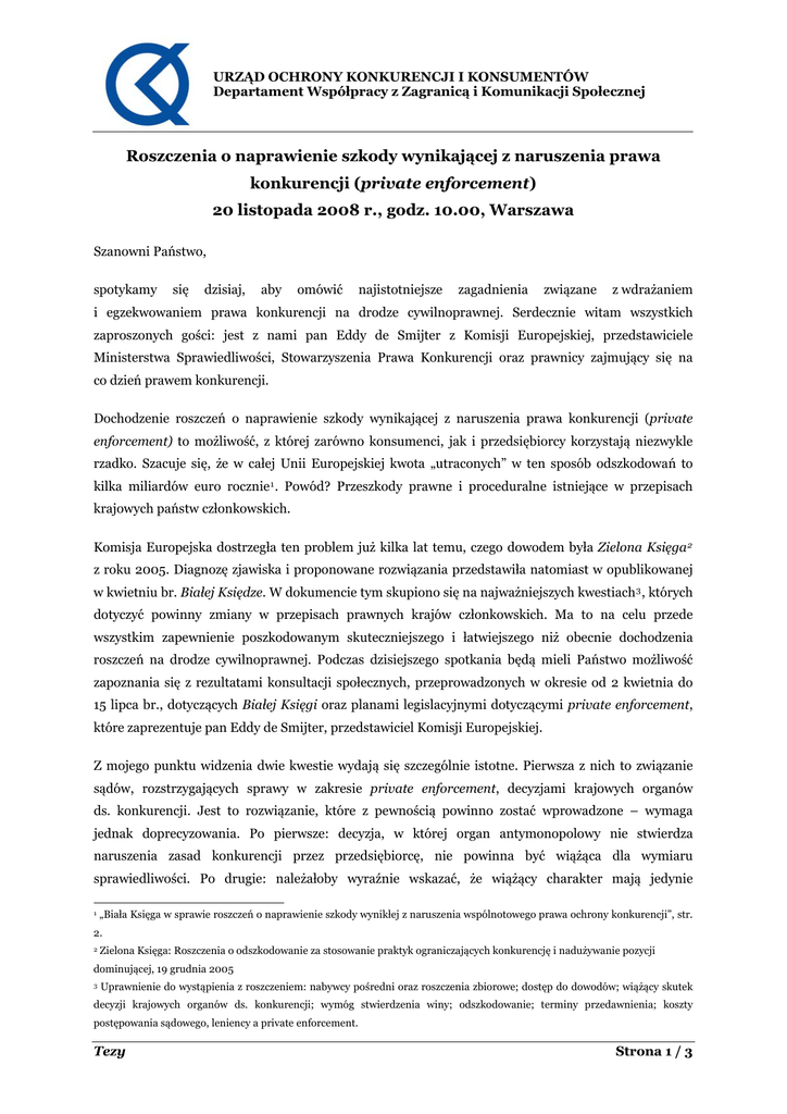 URZĄD OCHRONY KONKURENCJI I KONSUMENTÓW Departament Współpracy z Zagranicą i Komunikacji Społecznej Roszczenia o naprawienie szkody wynikającej z naruszenia prawa konkurencji (private enforcement) 20 listopada 2008 r., godz. 10.00, Warszawa Szanowni Państwo, spotykamy się dzisiaj, aby omówić najistotniejsze zagadnienia związane z wdrażaniem i egzekwowaniem prawa konkurencji na drodze cywilnoprawnej. Serdecznie witam wszystkich zaproszonych gości: jest z nami pan Eddy de Smijter z Komisji Europejskiej, przedstawiciele Ministerstwa Sprawiedliwości, Stowarzyszenia Prawa Konkurencji oraz prawnicy zajmujący się na co dzień prawem konkurencji. Dochodzenie roszczeń o naprawienie szkody wynikającej z naruszenia prawa konkurencji (private enforcement) to możliwość, z której zarówno konsumenci, jak i przedsiębiorcy korzystają niezwykle rzadko. Szacuje się, że w całej Unii Europejskiej kwota „utraconych” w ten sposób odszkodowań to kilka miliardów euro rocznie 1 . Powód? Przeszkody prawne i proceduralne istniejące w przepisach krajowych państw członkowskich. Komisja Europejska dostrzegła ten problem już kilka lat temu, czego dowodem była Zielona Księga 2 z roku 2005. Diagnozę zjawiska i proponowane rozwiązania przedstawiła natomiast w opublikowanej w kwietniu br. Białej Księdze. W dokumencie tym skupiono się na najważniejszych kwestiach 3 , których dotyczyć powinny zmiany w przepisach prawnych krajów członkowskich. Ma to na celu przede wszystkim zapewnienie poszkodowanym skuteczniejszego i łatwiejszego niż obecnie dochodzenia roszczeń na drodze cywilnoprawnej. Podczas dzisiejszego spotkania będą mieli Państwo możliwość zapoznania się z rezultatami konsultacji społecznych, przeprowadzonych w okresie od 2 kwietnia do 15 lipca br., dotyczących Białej Księgi oraz planami legislacyjnymi dotyczącymi private enforcement, które zaprezentuje pan Eddy de Smijter, przedstawiciel Komisji Europejskiej. Z mojego punktu widzenia dwie kwestie wydają się szczególnie istotne. Pierwsza z nich to związanie sądów, rozstrzygających sprawy w zakresie private enforcement, decyzjami krajowych organów ds. konkurencji. Jest to rozwiązanie, które z pewnością powinno zostać wprowadzone – wymaga jednak doprecyzowania. Po pierwsze: decyzja, w której organ antymonopolowy nie stwierdza naruszenia zasad konkurencji przez przedsiębiorcę, nie powinna być wiążąca dla wymiaru sprawiedliwości. Po drugie: należałoby wyraźnie wskazać, że wiążący charakter mają jedynie 1 „Biała Księga w sprawie roszczeń o naprawienie szkody wynikłej z naruszenia wspólnotowego prawa ochrony konkurencji”, str. 2. 2 Zielona Księga: Roszczenia o odszkodowanie za stosowanie praktyk ograniczających konkurencję i nadużywanie pozycji dominującej, 19 grudnia 2005 3 Uprawnienie do wystąpienia z roszczeniem: nabywcy pośredni oraz roszczenia zbiorowe; dostęp do dowodów; wiążący skutek decyzji krajowych organów ds. konkurencji; wymóg stwierdzenia winy; odszkodowanie; terminy przedawnienia; koszty postępowania sądowego, leniency a private enforcement. Tezy Strona 1 / 3 URZĄD OCHRONY KONKURENCJI I KONSUMENTÓW Departament Współpracy z Zagranicą i Komunikacji Społecznej ostateczne decyzje, a więc po zakończeniu trybu odwoławczego, jeśli z takiej możliwości skorzystał przedsiębiorca. Po trzecie: wiążąca powinna być jedynie taka decyzja, która dotyczy zachowania pozwanego będącego przedmiotem dochodzenia odszkodowania. Kwestią, nad którą należałoby się również zastanowić, jest zawieszenie postępowania sądowego w przypadku, kiedy urząd antymonopolowy prowadzi postępowanie administracyjne w sprawie naruszenia reguł konkurencji. Jak Państwo doskonale wiedzą, taka możliwość funkcjonuje w polskim systemie prawnym. Nie można jednak uzależniać wydania wyroku od spowodowania przez powoda wszczęcia postępowania administracyjnego w sprawie naruszenia prawa konkurencji. Przyczyna jest prosta: obowiązująca od kwietnia 2007 roku w Polsce ustawa o ochronie konkurencji i konsumentów nie przewiduje prowadzenia przez UOKiK postępowań na wniosek. Każdy, kto posiada informacje o naruszeniu prawa, może złożyć do Urzędu zawiadomienie, ale o zasadności wszczęcia formalnego postępowania decyduje UOKiK. Drugą niezwykle istotną sprawą, ściśle związaną z przedmiotem naszego dzisiejszego spotkania, jest wprowadzenie do obowiązującego porządku prawnego instytucji pozwów zbiorowych. Narzędzie to znacznie ułatwiłoby, przede wszystkim konsumentom, sądową batalię o odszkodowanie. Krokiem zmierzającym do realizacji tego celu są prowadzone obecnie prace nad ustawą o dochodzeniu roszczeń w postępowaniu grupowym. Przygotowany przez Ministerstwo Sprawiedliwości projekt znajduje się w tej chwili w fazie uzgodnień międzyresortowych. 4 Kilka kwestii wymaga, moim zdaniem, uzupełnienia i doprecyzowania. Należy m.in. rozważyć przyznanie legitymacji do występowania w charakterze reprezentanta grupy, obok powiatowego (miejskiego) rzecznika konsumentów, innym organizacjom, do których zadań statutowych należy ochrona praw słabszych uczestników rynku. Ponadto, biorąc pod uwagę okoliczność, że projekt ustawy nie ogranicza postępowań grupowych jedynie do spraw konsumenckich, uzasadnione wydaje się przyznanie takiego prawa także organizacjom przedsiębiorców, jako że z roszczeniami mogą również występować te grupy podmiotów. Proponowane przez Urząd rozwiązanie stanowiłoby realizację rozwiązania zaproponowanego w Białej Księdze. 5 Warto się również zastanowić nad zasadnością uprawnienia pozwanego do żądania od powoda złożenia kaucji na zabezpieczenie kosztów procesu – obawiam się, że takie rozwiązanie może zniechęcić wiele osób do wnoszenia pozwów. Wątpliwości Urzędu budzi również wymóg zastępstwa powoda przez adwokata lub radcę prawnego – zwłaszcza 