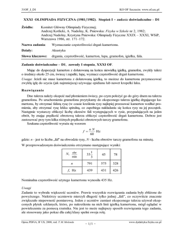 31OF_I_D1 KO OF Szczecin: www.of.szc.pl XXXI OLIMPIADA FIZYCZNA (1981/1982). Stopień I - zadanie doświadczalne – D1 Źródło: Komitet Główny Olimpiady Fizycznej; Andrzej Kotlicki, A. Nadolny, K. Pniewska: Fizyka w Szkole nr 2, 1982; Andrzej Nadolny, Krystyna Pniewska: Olimpiady Fizyczne XXIX – XXXI, WSiP, Warszawa 1986, str. 171–172. Nazwa zadania: Wyznaczanie częstotliwości drgań kamertonu. Działy: Akustyka Słowa kluczowe: drgania, częstotliwość, kamerton, lupa, gramofon, igiełka, fala. Zadanie doświadczalne – D1, zawody I stopnia, XXXI OF. Mając do dyspozycji: kamerton z dolutowaną na końcu niewielką igiełką, gramofon, zwykły talerz o średnicy około 25 cm, świecę i zapałki, lupę, wyznacz częstotliwość drgań kamertonu. Uwaga: Jeżeli nie masz kamertonu z dolutowaną igiełką, to możesz do kamertonu przymocować zwykłą igłę do szycia (jak najmniejszą) używając epidianu lub nawet kropelki laku. Rozwiązanie Dno talerza należy okopcić nad płomieniem świecy, po czym położyć go do góry dnem na talerzu gramofonu. Po uruchomieniu gramofonu przytykamy do okopconego talerza igiełkę drgającego kamertonu, by otrzymać falistą rysę (w czasie kreślenia rysy najlepiej przesuwać kamerton wzdłuż promienia, aby otrzymać rysę lekka spiralną, co zapobiega nakładaniu się końca rysy na jej początek. Następnie wystarczy obliczyć liczbę okresów fali występujących w rysie, przypadających na jeden obrót, by znając prędkość obrotową talerza obliczyć częstotliwość drgań kamertonu. Dobrze jest zastosować przy tym kilka różnych prędkości obrotowych tarczy gramofonu. Szukana częstotliwość wyraża się wzorem f nN Hz 60 gdzie: n - jest to liczba „fal" na obwodzie rysy, N - liczba obrotów tarczy gramofonu na minutę. W przeprowadzonym doświadczeniu otrzymano następujące wyniki: 1 3 45 78 n 791 575 328 f, Hz 439 431 426 N, obr min 33 Nominalna częstotliwość użytego kamertonu wynosiła 435 Hz. Uwagi Zadanie to wybrała większość uczniów. Prawie wszystkie rozwiązania zadania były zbliżone do powyższego. Niektórzy uczniowie mierzyli długość tylko jednej „fali”, co oczywiście znacznie zwiększało niepewność pomiarową. Jeden z uczniów zamiast okopconego talerza używał okopconych płytek szklanych, które, po nakreśleniu na nich linii igiełką kamertonu, mógł oglądać w powiekszeniu za pomocą rzutnika. Nie jest to może najlepszy sposób rozwiązania tego zadania, ale stosowany jako pokaz dla całej klasy spełni swoja rolę. Oprac.PDFiA, IF US, 2008, red. T. M. Molenda - 1/1 - www.dydaktyka.fizyka.szc.pl