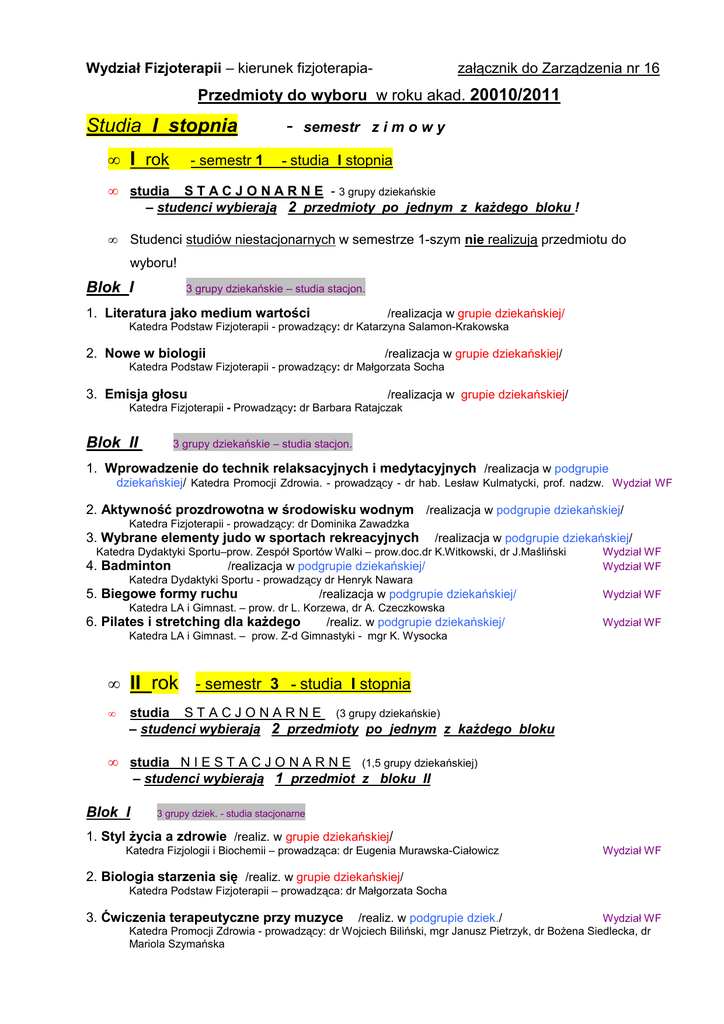Wydział Fizjoterapii – kierunek fizjoterapia- załącznik do Zarządzenia nr 16 Przedmioty do wyboru w roku akad. 20010/2011 Studia I stopnia • I rok - semestr 1 - semestr z i m o w y - studia I stopnia • studia S T A C J O N A R N E - 3 grupy dziekańskie – studenci wybierają 2 przedmioty po jednym z każdego bloku ! • Studenci studiów niestacjonarnych w semestrze 1-szym nie realizują przedmiotu do wyboru! Blok I 3 grupy dziekańskie – studia stacjon. 1. Literatura jako medium wartości /realizacja w grupie dziekańskiej/ Katedra Podstaw Fizjoterapii - prowadzący: dr Katarzyna Salamon-Krakowska 2. Nowe w biologii /realizacja w grupie dziekańskiej/ Katedra Podstaw Fizjoterapii - prowadzący: dr Małgorzata Socha 3. Emisja głosu /realizacja w grupie dziekańskiej/ Katedra Fizjoterapii - Prowadzący: dr Barbara Ratajczak Blok II 3 grupy dziekańskie – studia stacjon. 1. Wprowadzenie do technik relaksacyjnych i medytacyjnych /realizacja w podgrupie dziekańskiej/ Katedra Promocji Zdrowia. - prowadzący - dr hab. Lesław Kulmatycki, prof. nadzw. Wydział WF 2. Aktywność prozdrowotna w środowisku wodnym /realizacja w podgrupie dziekańskiej/ Katedra Fizjoterapii - prowadzący: dr Dominika Zawadzka 3. Wybrane elementy judo w sportach rekreacyjnych /realizacja w podgrupie dziekańskiej/ Katedra Dydaktyki Sportu–prow. Zespół Sportów Walki – prow.doc.dr K.Witkowski, dr J.Maśliński 4. Badminton /realizacja w podgrupie dziekańskiej/ Wydział WF Wydział WF Katedra Dydaktyki Sportu - prowadzący dr Henryk Nawara 5. Biegowe formy ruchu /realizacja w podgrupie dziekańskiej/ Wydział WF Katedra LA i Gimnast. – prow. dr L. Korzewa, dr A. Czeczkowska 6. Pilates i stretching dla każdego /realiz. w podgrupie dziekańskiej/ Wydział WF Katedra LA i Gimnast. – prow. Z-d Gimnastyki - mgr K. Wysocka • II rok - semestr 3 - studia I stopnia • studia S T A C J O N A R N E (3 grupy dziekańskie) – studenci wybierają 2 przedmioty po jednym z każdego bloku • studia N I E S T A C J O N A R N E (1,5 grupy dziekańskiej) – studenci wybierają 1 przedmiot z bloku II Blok I 3 grupy dziek. - studia stacjonarne 1. Styl życia a zdrowie /realiz. w grupie dziekańskiej/ Katedra Fizjologii i Biochemii – prowadząca: dr Eugenia Murawska-Ciałowicz Wydział WF 2. Biologia starzenia się /realiz. w grupie dziekańskiej/ Katedra Podstaw Fizjoterapii – prowadząca: dr Małgorzata Socha 3. Ćwiczenia terapeutyczne przy muzyce /realiz. w podgrupie dziek./ Wydział WF Katedra Promocji Zdrowia - prowadzący: dr Wojciech Biliński, mgr Janusz Pietrzyk, dr Bożena Siedlecka, dr Mariola Szymańska Blok II 3 grupy dziek. studia stacjonarne + 1,5 grupy dziek. studia niestacjonarne 1. Anatomia na żywym człowieku /realiz.w podgrupie dziek./ Wydział WF Katedra Biostruktury - prowadzący: dr Grzegorz Żurek, dr Jarosław Domaradzki, dr Kamila Czajka, dr Paweł Posłuszny, dr Katarzyna Kochan-Jacheć, dr Jarosław Fugiel, mgr Katarzyna Prasał, mgr Jakub Pokrywka 2. Antropologia w fizjoterapii /realiz.w podgrupie dziek./ Wydział WF Katedra Motoryczności Sportowca - prowadzący: dr Justyna Andrzejewska, dr Jadwiga Pietraszewska, dr Krystyna Chromik 3. Praktyczne wykorzystanie diagnostyki biochemicznej w fizjoterapii /realiz.w podgrupie dziek./ Katedra Fizjologii i Biochemii - prowadzący: dr Ewa Bakońska-Pacoń Wydział WF 4. Fizykoterapia w kosmetologii /realiz.w podgrupie dziekańskiej/ Katedra Fizjoterapii – prowadząca dr Agnieszka Pisula-Lewandowska 5. Elementy filozofii i socjologii zdrowia. Z warsztatu badawczego socjologa /realiz.w grupie dziekańskiej/ Katedra Podstaw Fizjoterapii - prowadząca: dr Elżbieta Wojtaś 6. Strzelectwo sportowe /realiz. w podgrupie dziekańskiej/ Wydział WF Katedra Dydaktyki Sportu – prow. dr K.Kurzawski, mgr R.Mauer, mgr A.Kijowski 7. Biegowe formy ruchu /realiz. w podgrupie dziekańskiej/ Wydział WF Katedra LA i Gimnast. – prow. dr Leszek Korzewa, dr A. Czeczkowska • III rok - semestr 5 - studia I stopnia • studia • studia NIESTACJONARNE (wieczorowe 0,5 grupy dziekańskiej, zaoczne 0,5 grupy dziek./ – studenci wybierają 1 przedmiot STACJONARNE (2 grupy dziekańskie) – studenci wybierają 1 przedmiot 1. Studium rodziny /realiz. w grupie dziekańskiej/ Katedra Podstaw Fizjoterapii - prowadzący: dr Lucyna Górska-Kłęk 2. Układ równowagi /realiz. w podgrupie dziekańskiej/ Katedra Fizjoterapii – prowadzący – dr hab. Michał Kuczyński, prof.nadzw. 3. Propedeutyka pływania osób niepełnosprawnych /realiz. w podgrupie dziekańskiej/ Katedra Kultury Fizycznej Osób Niepełnosprawnych - prowadzący: mgr Wojciech Seidel 4. Taniec towarzyskich w rehabilitacji osób niewidomych /realiz.w podgrupie dziekańskiej/ Katedra Promocji Zdrowia - prowadzący: mgr Janusz Pietrzyk, dr Wojciech Biliński – Wydział WF 5. Odnowa biologiczna w sporcie osób niepełnosprawnych /realiz. w podgrupie dziek./ Katedra Kultury Fizycznej Osób Niepełnosprawnych - prowadząca: dr Tetyana Prystupa • k o n t y n u a c j a (w sem. 5 i 6) specjalizacji - Instruktor Rekreacji Ruchowej specjalność H I P O T E R A P I A - dla osób, które w poprzednim roku ukończyły „Teorię i praktykę jazdy konnej” oraz „Jazdę konną”. UWAGA: zajęcia na studiach zaocznych odbędą się w miesiącu wrześniu. Studenci studiów zaocznych wybierają przedmioty od 2 do 5 (z późniejszą korektą). Studia II stopnia - semestr z i m o w y • I rok • studia S T A C J O N A R N E (3 grupy dziekańskie) – studenci wybierają 2 przedmioty po jednym z każdego bloku • studia N I E S T A C J O N A R N E (3 grupy dziekańskie) – studenci wybierają 2 przedmioty po jednym z każdego bloku Blok I - semestr 1 - studia II stopnia 3 grupy dziek. studia stacjonarne + 3 grupy dziek. studia niestacjonarne 1. Elementy filozofii i socjologii zdrowia. Z warsztatu badawczego socjologa /realiz.w grupie dziekańskiej/ Katedra Podstaw Fizjoterapii - prowadzący: dr E