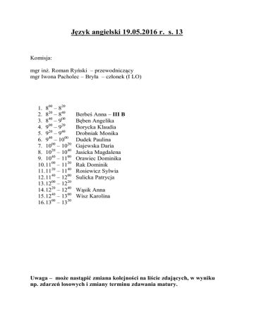 Język angielski 19.05.2016 r. s. 13 Komisja: mgr inż. Roman Ryński – przewodniczący mgr Iwona Pacholec – Bryła – członek (I LO) 1. 800 – 820 2. 820 – 840 3. 840 – 900 4. 900 – 920 5. 920 – 940 6. 940 – 1000 7. 1000 – 1020 8. 1020 – 1040 9. 1040 – 1100 10. 1100 – 1120 11. 1120 – 1140 12. 1140 – 1200 13. 1200 – 1220 14. 1220 – 1240 15. 1240 – 1300 16. 1300 – 1330 Berbeś Anna – III B Bęben Angelika Borycka Klaudia Drobniak Monika Dudek Paulina Gajewska Daria Jasicka Magdalena Orawiec Dominika Rak Dominik Rosiewicz Sylwia Sulicka Patrycja Wąsik Anna Wisz Karolina Uwaga – może nastąpić zmiana kolejności na liście zdających, w wyniku np. zdarzeń losowych i zmiany terminu zdawania matury. Język angielski 19.05.2016 r. s. 14 Komisja: mgr Krzysztof Gajek – przewodniczący mgr Agnieszka Jarosz – członek (I LO) 1. 1300 – 1320 2. 1320 – 1340 3. 1340 – 1400 4. 1400 – 1420 5. 1420 – 1440 6. 1440 – 1500 7. 1500 – 1520 8. 1520 – 1540 9. 1540 – 1600 10. 1600 – 1620 11. 1620 – 1640 12. 1640 – 1700 13. 1700 – 1720 14. 1720 – 1740 15. 1740 – 1800 16. 1800 – 1820 17. 1820 – 1840 Dąbrowska Patrycja – III B Dobko Maria Godzisz Agnieszka Jarecka Bernadetta Kanios Krzysztof Misiur Magda Morzyńska Izabela Piasecka Klaudia Rewera Natalia Bryła Tomasz – III A Brzeski Bartosz Durda Albert Gospodarczyk Aleksander Grzesik Magdalena Uwaga – może nastąpić zmiana kolejności na liście zdających, w wyniku np. zdarzeń losowych i zmiany terminu zdawania matury. Język angielski 20.05.2016 r. s. 13 Komisja: mgr Krzysztof Gajek – przewodniczący mgr Zbigniew Wójcik – członek (I LO) 1. 800 – 820 2. 820 – 840 3. 840 –900 4. 900 – 920 5. 920 – 940 6. 940 – 1000 7. 1000 – 1020 8. 1020 – 1040 9. 1040 – 1100 10. 1100 – 1120 11. 1120 – 1140 12. 1140 – 1200 13. 1200 – 1220 14. 1220 – 1240 Haas Daniel – III A Kaczmarski Karol Kolasa Karol Tenderenda Michał Wilczewski Paweł Wołek Bartosz Woźniak Anna Basak Dominika – III C Cichoń Patrycja Cira Klaudia Czuba Natalia Dziekan Martyna Jaworski Kamil Jędral Natalia Uwaga – może nastąpić zmiana kolejności na liście zdających, w wyniku np. zdarzeń losowych i zmiany terminu zdawania matury. Język angielski 20.05.2016 r. s. 13 Komisja: mgr inż. Roman Ryński – przewodniczący mgr Agnieszka Jarosz – członek (I LO) 1. 1300 – 1320 2. 1320 – 1340 3. 1340 – 1400 4. 1400 – 1420 5. 1420 – 1440 6. 1440 – 1500 7. 1500 – 1520 8. 1520 – 1540 9. 1540 – 1600 10. 1600 – 1620 11. 1620 – 1640 12. 1640 – 1700 13. 1700 – 1720 Kępa Wojciech – III C Lisicki Michał Marzec Dominika Mazur Aleksandra Mendala Przemysław Rachwalska Angelika Siatrak Jakub Smardz Klaudia Urbaniak Aleksandra Wójcik Paulina Zvyeryeva Anastazja Żmudzińska Patrycja Pasek Weronika Uwaga – może nastąpić zmiana kolejności na liście zdających, w wyniku np. zdarzeń losowych i zmiany terminu zdawania matury.