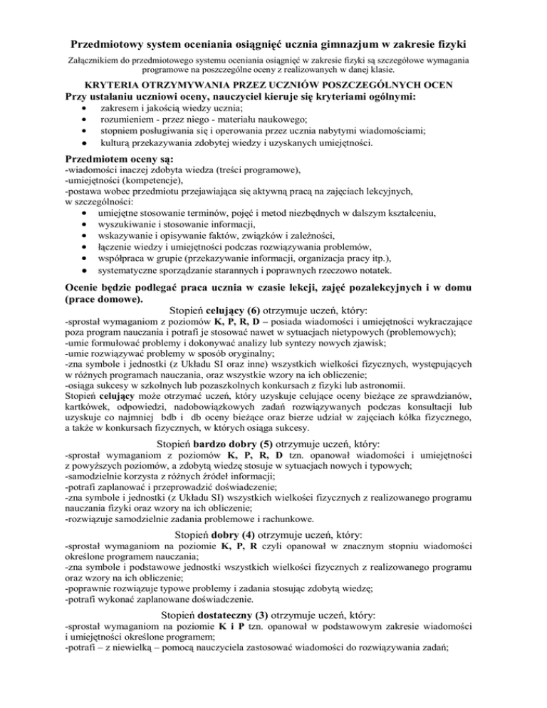 Przedmiotowy system oceniania osiągnięć ucznia gimnazjum w zakresie fizyki Załącznikiem do przedmiotowego systemu oceniania osiągnięć w zakresie fizyki są szczegółowe wymagania programowe na poszczególne oceny z realizowanych w danej klasie. KRYTERIA OTRZYMYWANIA PRZEZ UCZNIÓW POSZCZEGÓLNYCH OCEN Przy ustalaniu uczniowi oceny, nauczyciel kieruje się kryteriami ogólnymi: zakresem i jakością wiedzy ucznia; rozumieniem - przez niego - materiału naukowego; stopniem posługiwania się i operowania przez ucznia nabytymi wiadomościami; kulturą przekazywania zdobytej wiedzy i uzyskanych umiejętności. Przedmiotem oceny są: -wiadomości inaczej zdobyta wiedza (treści programowe), -umiejętności (kompetencje), -postawa wobec przedmiotu przejawiająca się aktywną pracą na zajęciach lekcyjnych, w szczególności: umiejętne stosowanie terminów, pojęć i metod niezbędnych w dalszym kształceniu, wyszukiwanie i stosowanie informacji, wskazywanie i opisywanie faktów, związków i zależności, łączenie wiedzy i umiejętności podczas rozwiązywania problemów, współpraca w grupie (przekazywanie informacji, organizacja pracy itp.), systematyczne sporządzanie starannych i poprawnych rzeczowo notatek. Ocenie będzie podlegać praca ucznia w czasie lekcji, zajęć pozalekcyjnych i w domu (prace domowe). Stopień celujący (6) otrzymuje uczeń, który: -sprostał wymaganiom z poziomów K, P, R, D – posiada wiadomości i umiejętności wykraczające poza program nauczania i potrafi je stosować nawet w sytuacjach nietypowych (problemowych); -umie formułować problemy i dokonywać analizy lub syntezy nowych zjawisk; -umie rozwiązywać problemy w sposób oryginalny; -zna symbole i jednostki (z Układu SI oraz inne) wszystkich wielkości fizycznych, występujących w różnych programach nauczania, oraz wszystkie wzory na ich obliczenie; -osiąga sukcesy w szkolnych lub pozaszkolnych konkursach z fizyki lub astronomii. Stopień celujący może otrzymać uczeń, który uzyskuje celujące oceny bieżące ze sprawdzianów, kartkówek, odpowiedzi, nadobowiązkowych zadań rozwiązywanych podczas konsultacji lub uzyskuje co najmniej bdb i db oceny bieżące oraz bierze udział w zajęciach kółka fizycznego, a także w konkursach fizycznych, w których osiąga sukcesy. Stopień bardzo dobry (5) otrzymuje uczeń, który: -sprostał wymaganiom z poziomów K, P, R, D tzn. opanował wiadomości i umiejętności z powyższych poziomów, a zdobytą wiedzę stosuje w sytuacjach nowych i typowych; -samodzielnie korzysta z różnych źródeł informacji; -potrafi zaplanować i przeprowadzić doświadczenie; -zna symbole i jednostki (z Układu SI) wszystkich wielkości fizycznych z realizowanego programu nauczania fizyki oraz wzory na ich obliczenie; -rozwiązuje samodzielnie zadania problemowe i rachunkowe. Stopień dobry (4) otrzymuje uczeń, który: -sprostał wymaganiom na poziomie K, P, R czyli opanował w znacznym stopniu wiadomości określone programem nauczania; -zna symbole i podstawowe jednostki wszystkich wielkości fizycznych z realizowanego programu oraz wzory na ich obliczenie; -poprawnie rozwiązuje typowe problemy i zadania stosując zdobytą wiedzę; -potrafi wykonać zaplanowane doświadczenie. Stopień dostateczny (3) otrzymuje uczeń, który: -sprostał wymaganiom na poziomie K i P tzn. opanował w podstawowym zakresie wiadomości i umiejętności określone programem; -potrafi – z niewielką – pomocą nauczyciela zastosować wiadomości do rozwiązywania zadań; -zna najważniejsze zasady i prawa fizyki; -zna symbole i podstawowe jednostki wszystkich wielkości fizycznych z realizowanego programu oraz najważniejsze wzory na ich obliczenie; -umie wykonać proste doświadczenie zgodnie z instrukcją. Stopień dopuszczający (2) otrzymuje uczeń, który: -opanował wiadomości i umiejętności konieczne do dalszego kształcenia, choć ma w nich niewielkie braki czyli sprostał wymaganiom na poziomie K; -zna podstawowe prawa i zasady fizyki; -zna symbole i podstawowe jednostki większości wielkości fizycznych z realizowanego programu oraz wzory na ich obliczenie; -potrafi, z pomocą nauczyciela, wykonać proste doświadczenie i rozwiązać proste zadanie. Stopień niedostateczny (1) otrzymuje uczeń, który: -nie opanował wiadomości i umiejętności koniecznych do dalszego kształcenia czyli nie sprostał wymaganiom nawet z poziomu K; -nie zna nawet najważniejszych praw i zasad fizyki; -nie zna symboli i podstawowych jednostek większości wielkości fizycznych z realizowanego programu oraz wzorów na ich obliczenie; -nie potrafi rozwiązywać zadań o elementarnym stopniu trudności – nawet z pomocą nauczyciela. ZASADY BIEŻĄCEJ OCENY PRACY I OSIĄGNIĘĆ UCZNIÓW 1. Informacji o bieżących postępach ucznia, odnotowanych w formie ocen bieżących dostarczą: -sprawdziany (prace pisemne, całogodzinne – niektóre składające się z dwóch osobno ocenianych części tzw. teoretycznej i zadaniowej – obejmujące swoim zakresem większą partię materiału tzn. dział programowy (pisane po zakończeniu realizowania zagadnień z tego działu); w przypadku skali punktowej przeliczanej na oceny cyfrowe stosuje się następujące kryteria 100% – celujący (jeśli ta ocena z danej pracy jest przewidziana), 99% –86% – bardzo dobry, 85% –71% – dobry, 70% – 51% – dostateczny, 50% – 36% – dopuszczający, 35% – 0% – niedostateczny; -kartkówki (prace pisemne, kilkunastominutowe, obejmujące swoim zakresem kilka (max. 5 realizowanych ostatnio tematów lekcyjnych); -zadania domowe, sprawdzane bezpośrednio w miejscu ich napisania lub np. w formie kartkówki, (za brak zadania domowego lub zadanie noszące znamiona pracy niesamodzielnej uczeń otrzymuje ocenę niedostateczną); zadania domowe uczeń odrabia według zasad określonych przez nauczyciela (patrz Polecenia organizacyjne pkt. 3); -odpowiedzi ustne obejmujące swoim zakresem materi