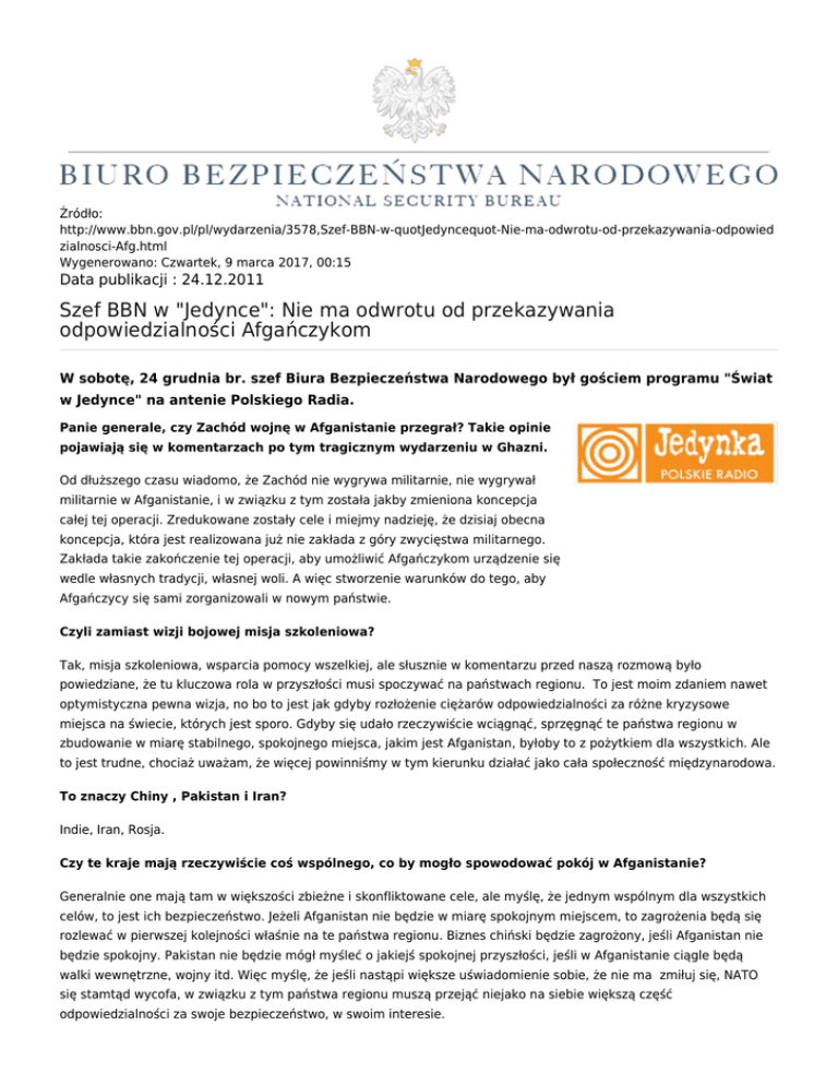 Źródło: http://www.bbn.gov.pl/pl/wydarzenia/3578,Szef-BBN-w-quotJedyncequot-Nie-ma-odwrotu-od-przekazywania-odpowied zialnosci-Afg.html Wygenerowano: Czwartek, 9 marca 2017, 00:15 Data publikacji : 24.12.2011 Szef BBN w "Jedynce": Nie ma odwrotu od przekazywania odpowiedzialności Afgańczykom W sobotę, 24 grudnia br. szef Biura Bezpieczeństwa Narodowego był gościem programu "Świat w Jedynce" na antenie Polskiego Radia. Panie generale, czy Zachód wojnę w Afganistanie przegrał? Takie opinie pojawiają się w komentarzach po tym tragicznym wydarzeniu w Ghazni. Od dłuższego czasu wiadomo, że Zachód nie wygrywa militarnie, nie wygrywał militarnie w Afganistanie, i w związku z tym została jakby zmieniona koncepcja całej tej operacji. Zredukowane zostały cele i miejmy nadzieję, że dzisiaj obecna koncepcja, która jest realizowana już nie zakłada z góry zwycięstwa militarnego. Zakłada takie zakończenie tej operacji, aby umożliwić Afgańczykom urządzenie się wedle własnych tradycji, własnej woli. A więc stworzenie warunków do tego, aby Afgańczycy się sami zorganizowali w nowym państwie. Czyli zamiast wizji bojowej misja szkoleniowa? Tak, misja szkoleniowa, wsparcia pomocy wszelkiej, ale słusznie w komentarzu przed naszą rozmową było powiedziane, że tu kluczowa rola w przyszłości musi spoczywać na państwach regionu. To jest moim zdaniem nawet optymistyczna pewna wizja, no bo to jest jak gdyby rozłożenie ciężarów odpowiedzialności za różne kryzysowe miejsca na świecie, których jest sporo. Gdyby się udało rzeczywiście wciągnąć, sprzęgnąć te państwa regionu w zbudowanie w miarę stabilnego, spokojnego miejsca, jakim jest Afganistan, byłoby to z pożytkiem dla wszystkich. Ale to jest trudne, chociaż uważam, że więcej powinniśmy w tym kierunku działać jako cała społeczność międzynarodowa. To znaczy Chiny , Pakistan i Iran? Indie, Iran, Rosja. Czy te kraje mają rzeczywiście coś wspólnego, co by mogło spowodować pokój w Afganistanie? Generalnie one mają tam w większości zbieżne i skonfliktowane cele, ale myślę, że jednym wspólnym dla wszystkich celów, to jest ich bezpieczeństwo. Jeżeli Afganistan nie będzie w miarę spokojnym miejscem, to zagrożenia będą się rozlewać w pierwszej kolejności właśnie na te państwa regionu. Biznes chiński będzie zagrożony, jeśli Afganistan nie będzie spokojny. Pakistan nie będzie mógł myśleć o jakiejś spokojnej przyszłości, jeśli w Afganistanie ciągle będą walki wewnętrzne, wojny itd. Więc myślę, że jeśli nastąpi większe uświadomienie sobie, że nie ma zmiłuj się, NATO się stamtąd wycofa, w związku z tym państwa regionu muszą przejąć niejako na siebie większą część odpowiedzialności za swoje bezpieczeństwo, w swoim interesie. Czy wierzy Pan w to, że w 2014 roku wycofają się wszystkie siły z Afganistanu? Amerykanie już zaczynają mówić o tym, że nie wszystkie siły wycofają, że zostaną tak zwane siły szkoleniowe przydzielone do żołnierzy afgańskich. Problem, co po 2014 roku jest rzeczywiście na dzisiaj otwarty i miejmy nadzieję, że na zbliżającym się szczycie NATO w Chicago w maju przyszłego roku zostanie zarysowana jakaś generalna strategia. Wydaje się, że będzie to prawdopodobnie rozwiązanie podobne, jak było w stosunku do Iraku. To znaczy po zakończeniu tej misji wojskowej, albo Sojusz w ramach jakiegoś partnerstwa z nowym państwem afgańskim, albo poszczególne mocarstwa takie jak Stany Zjednoczone będą chciały zawrzeć pewne porozumienia, co do pilnowania swoich dalej tam interesów. Każde, zwłaszcza Stany Zjednoczone mają tam swoje interesy, więc niewykluczone, że w ramach porozumienia amerykańsko-afgańskiego pozostaną jakieś siły wojskowe amerykańskie. Chociaż to dla Afgańczyków będzie znowu bardzo trudne do zaakceptowania. Więc to jest bardzo delikatny problem. Z jednej strony, taka potrzeba by była, aby w miarę stabilizować jeszcze trochę, czy likwidować to główne zagrożenie zewnętrzne, terrorystyczne dla Afganistanu, a z drugiej strony, to bardzo trudne politycznie do zaakceptowania przez samych Afgańczyków, którzy Amerykanów po prostu, i zresztą wszystkie siły międzynarodowe w większości traktują jako siły zewnętrzne, obce, nawet okupacyjne. A czy nie obawia się Pan takiego samego scenariusza, jaki był w Iraku, że po wyjściu amerykańskich żołnierzy nastąpiły duże tarcia wewnątrz władzy w Bagdadzie, że te władze zaczęły się nawzajem oskarżać? Moim zdaniem jest to więcej niż pewne, że tak będzie w Afganistanie. Niestety to są takie miejsca, w których nie da się od tak zaprowadzić porządku. Pewne spory, pewne konflikty wewnętrzne, które tam są, one muszą się po prostu wypalić. Nie ma siły zewnętrznej, która byłaby zdolna utrzymywać tam cały czas - jakby rozcierać - te sporne siły, które tam są. Więc zapewne Afganistan wiele, wiele lat jeszcze, i po 2014 roku, będzie bardzo niespokojnym miejscem, ale to wcale nie znaczy, że tam mają być obce, zewnętrzne siły wojskowe, które mają tam pilnować porządku. No, ale jak wyjdą siły międzynarodowe, czy może być tak, że będzie wojna domowa? Zapewne tak. Problem tylko jakiej skali. Zresztą tam prawie cały czas toczą się wojny. Nie można ich w sposób sztuczny i zewnętrzny, stawiając tam większą siłę, wygasić. Po prostu te spory muszą się tam toczyć, a że specyfiką sporów w tamtym regionie nie jest tak jak u nas na Zachodzie spór demokratyczny, poprzez wybory, poprzez rozmowy, poprzez spory takie, no jakby bardziej pokojowe, tam po prostu ten spór z reguły przybiera zawsze formę walki zbrojnej. No i niestety długo jeszcze będą następować tam zmiany cywilizacyjne, przez pokolenia będą trwały, zanim będzie można powiedzieć, że w tamtym miejscu może być budowane państwo ot tak, według takiego modelu, do jakiego my pr